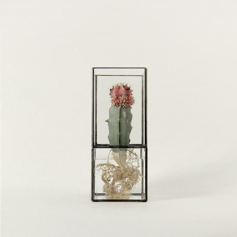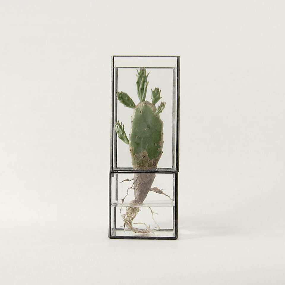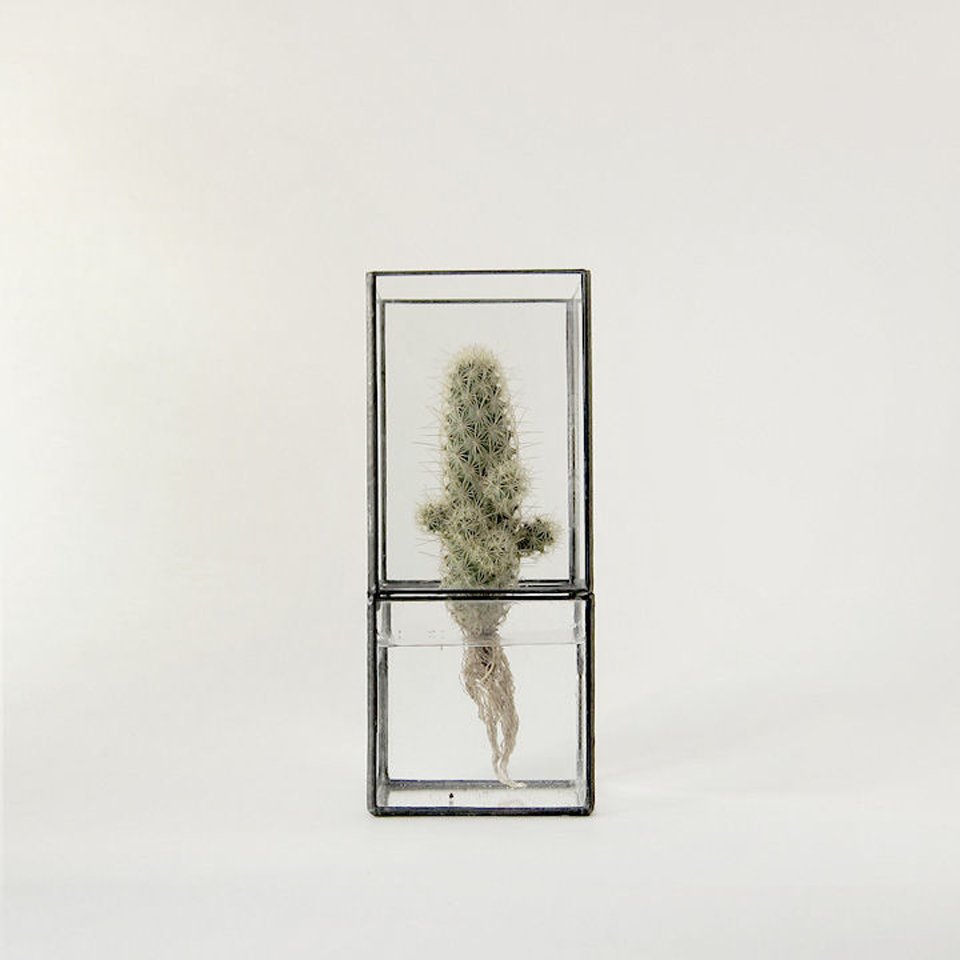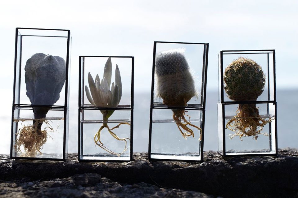 Bonsai, literally plantings (sai) in a tray (bon), are a familiar sighting among Japanese homes but designers Dasiuke Tsumanuma and Kenichi Yamada are moving from the more traditional planter to a new kind of terrarium. Their brand, [ 10¹² ] TERRA, makes use of the transparency of glass to feature both what lies above and below the surface. True to the brand name that alludes to the number of cells produced each day, the handcrafted containers highlight not just the leafy greens but also the meristem at the tip of the root, the source of new cells for plants. The glass construction of the pieces makes them ideal for hydroponics, and creates the illusion of the flower or plant floating in the air with roots exposed and pulsing with life. The prisms come in a variety of sizes and configurations – some orthogonal, others rotated on their edges – to accommodate a range of aesthetics that can be both table-top pieces as well as wall hangings.