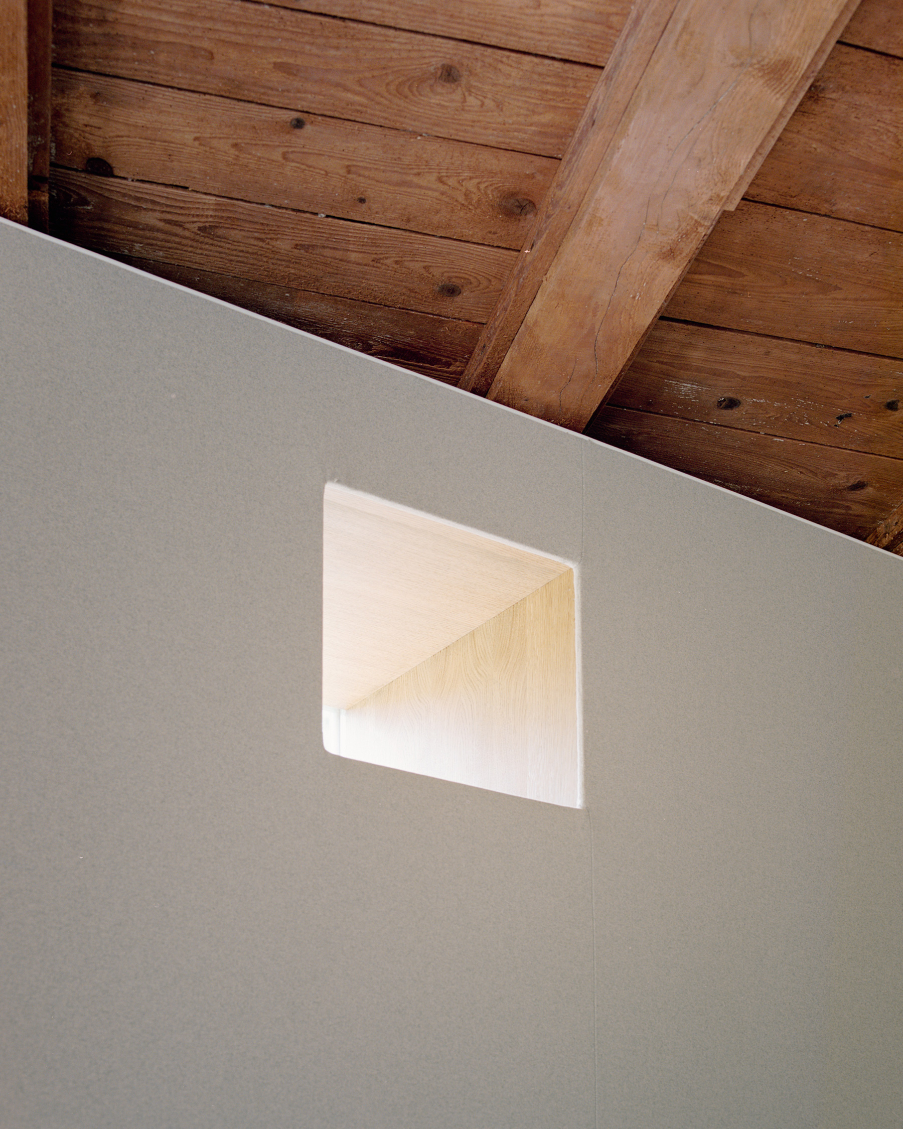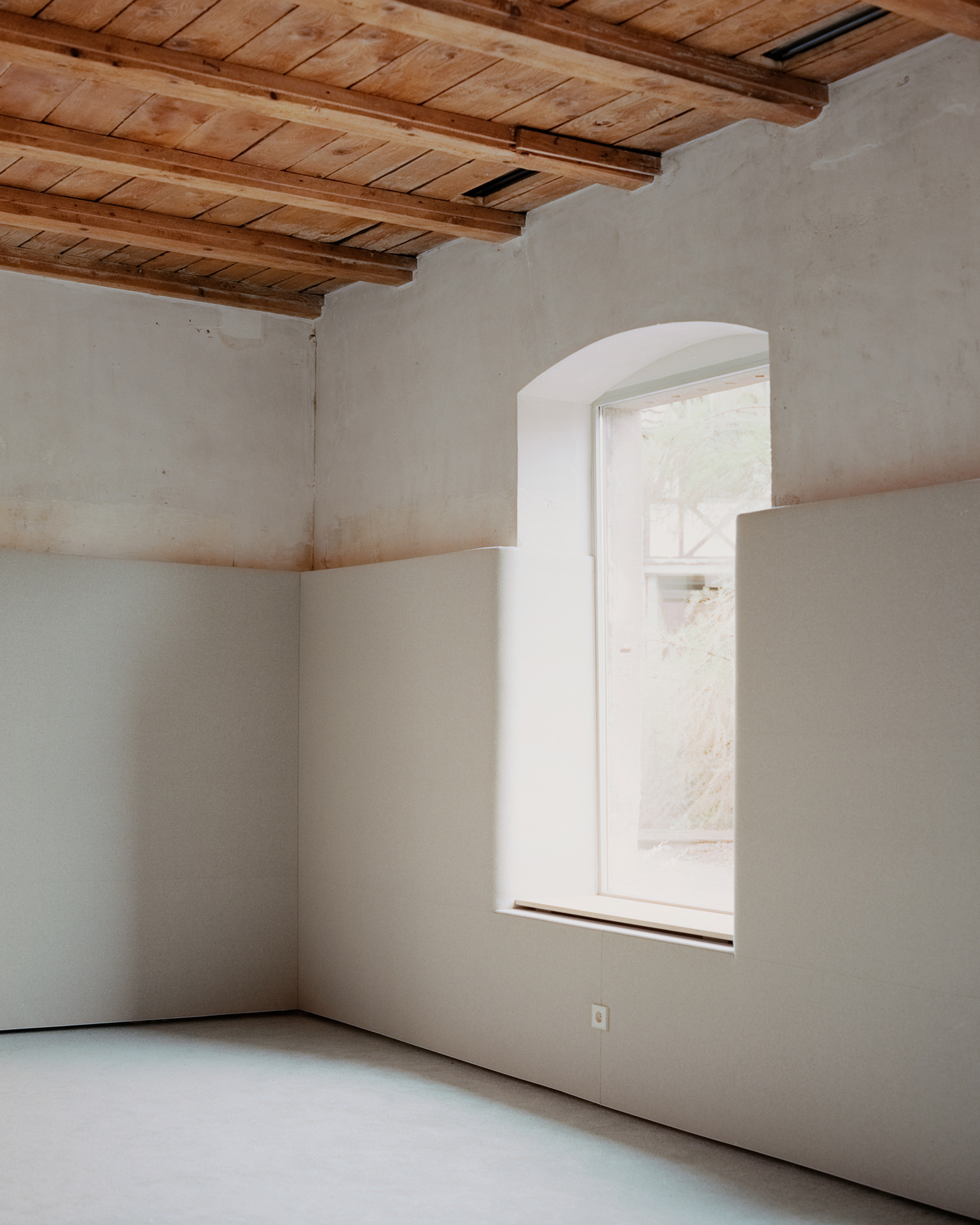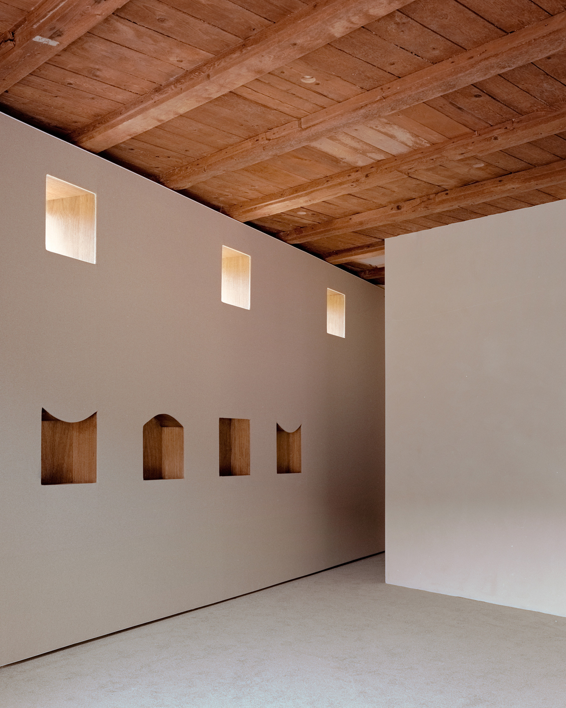 Guests enter the restaurant by walking beyond a circular curtain and then stepping into the lounge area and the dining space at the end of this carefully choreographed sequence. Felt panels cover the walls, rising up to two meters in height. This soft material creates continuity with the carpeted flooring but also offers a counterpoint to the organic textures and warm colors of the wooden ceiling. Felt also gives the dining space excellent acoustic and thermal insulation. The studio used minimalist wood furniture to create a simple and warm dining room where guests can relax in comfort. At the same time, these restrained contemporary additions highlight the character of the original walls and timber ceilings. Large windows frame rural views while bringing an abundance of natural light into the restaurant. Photography© Simone Bossi.