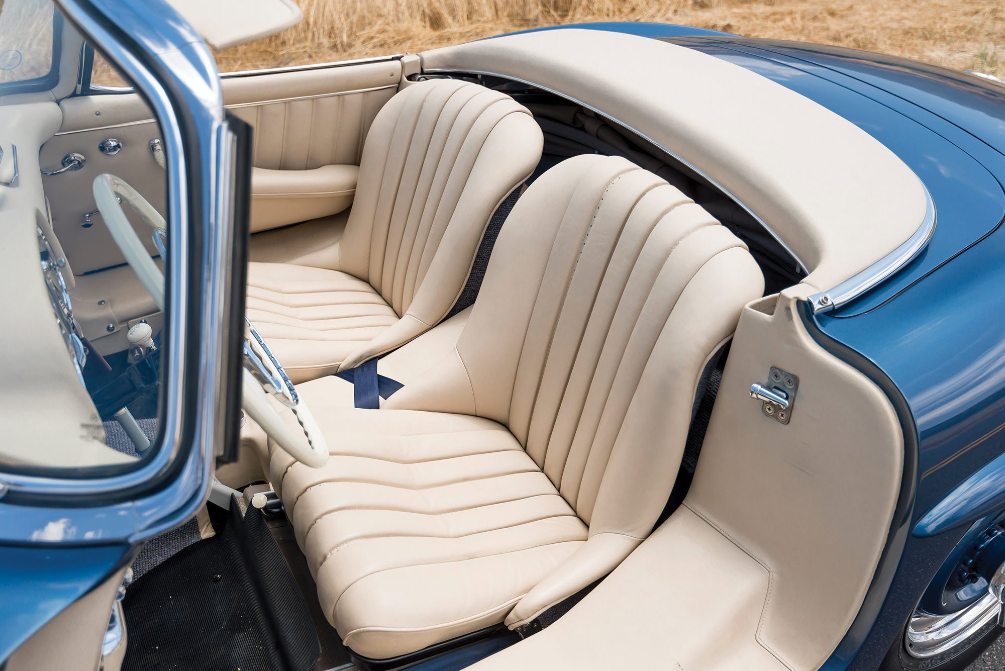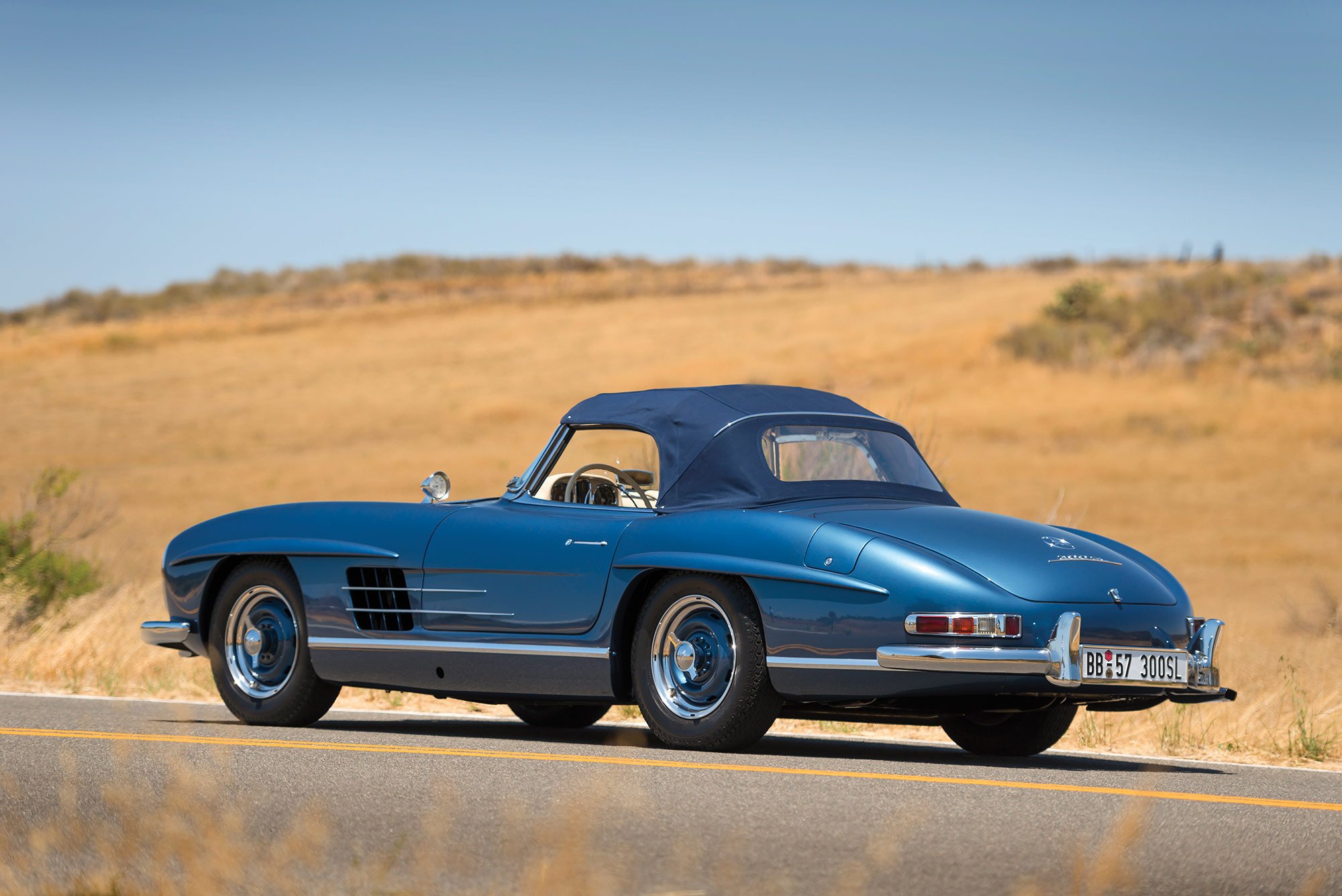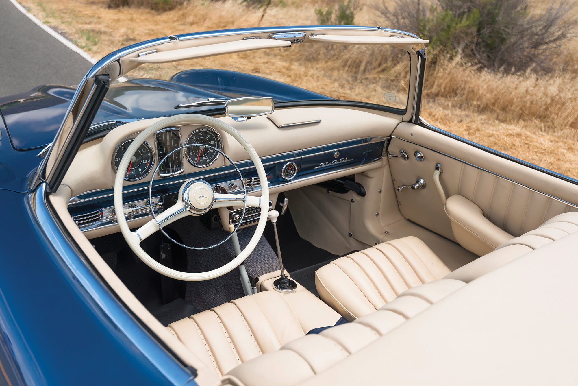 The roadster was refurbished extensively by Classic European Restorations in Escondido, California, with the engine and transmission rebuilt, various parts sourced from HK Engineering in Germany, the interior reupholstered in Parchment leather which complemented the new blue paint, period-accurate wheel replacements, a period ivory Bakelite steering wheel, and reconditioned electrical systems and gauges. Completed in 2005, the restoration project won several awards, including Best of Show at the Gullwing National Convention in San Diego. But this Roadster’s journey was not over yet. In 2013, the car went through its final restoration stage, completed by a seasoned specialist in 300 SL cars, Mark Allin of Rare Drive in Kensington, New Hampshire. The stunning attention to detail guaranteed a class award at the inaugural 2013 Pinehurst Concours d’Elegance show. Now this rare and valuable 1957 Mercedes-Benz 300 SL Roadster is listed on RM Sotheby’s, with an auction date set at 19-20 August 2016. The car comes with the original matching-numbers engine, detailed documentation that includes the heritage certificate issued by Mercedes-Benz Classic in Stuttgart in 2004 and a detailed factory data card. As it has a 1957 build date, the car is also one of the few models eligible for the Mille Miglia Storico or the California Mille. Images courtesy of RM Sotheby’s.