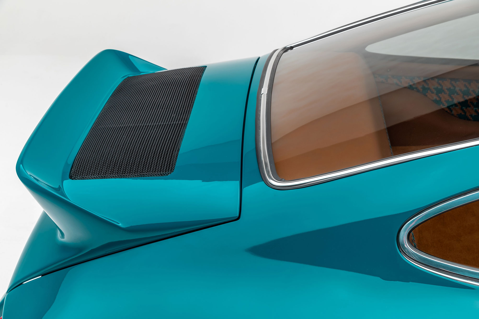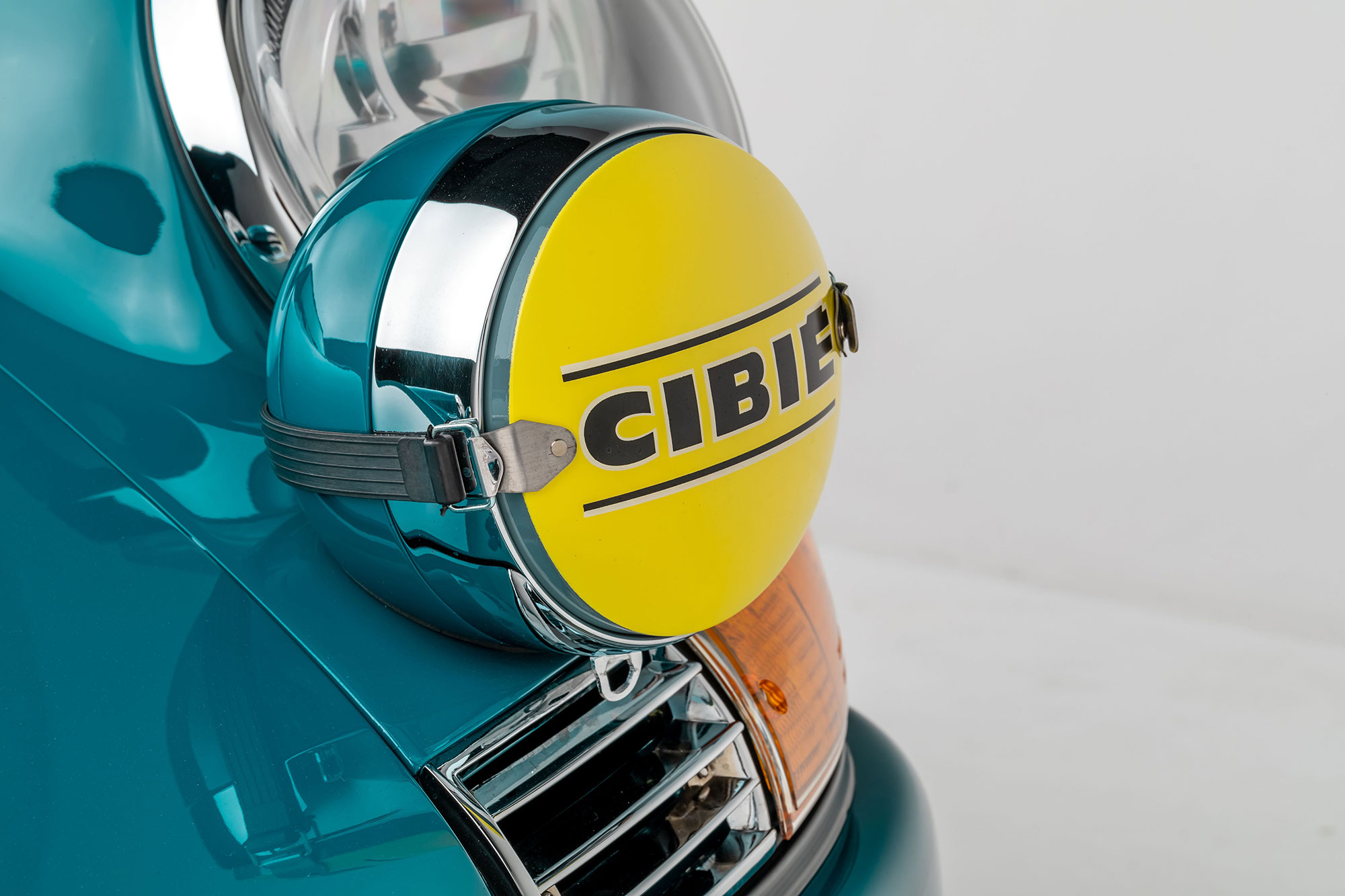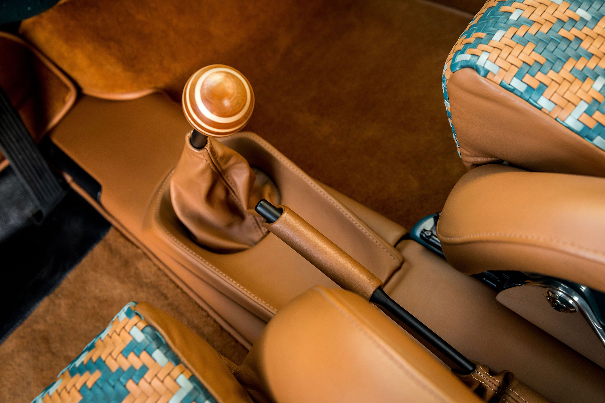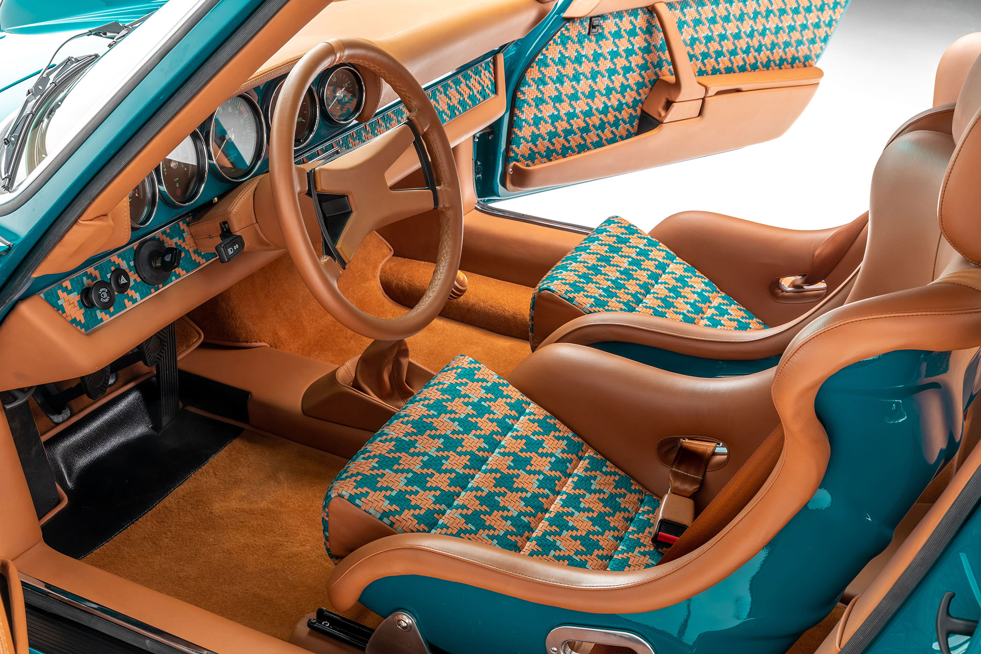 As stylish as the exterior, the cabin boasts Cognac leather on the new roll cage, seats, and other surfaces. The interior also features a specially designed weave pattern on the seat inserts, doors, and accent areas. Wool carpets, a wood shift knob that gives a nod to the 917, and gauges that draw inspiration from the 365 and early 911 cars complete the interior. Finally, this 1975 Porsche 911 features an eye-catching Green-Blue paint finish. A one-off color, the paint was designed specially for this Porsche restoration project. Photographs© European Collectibles.