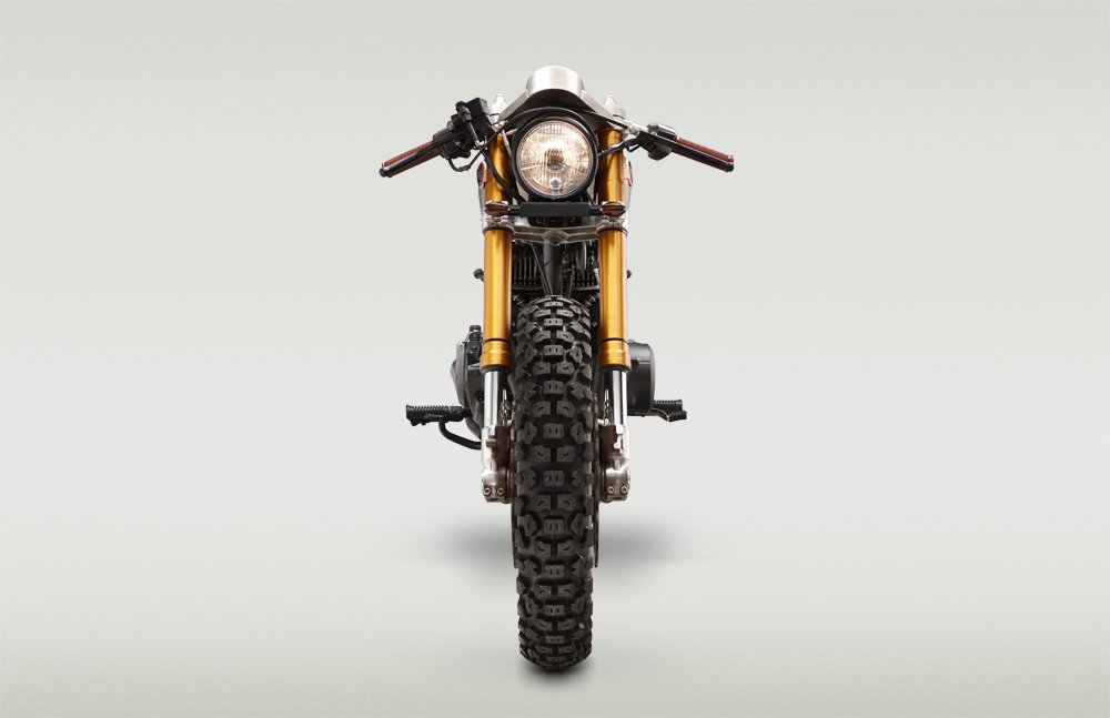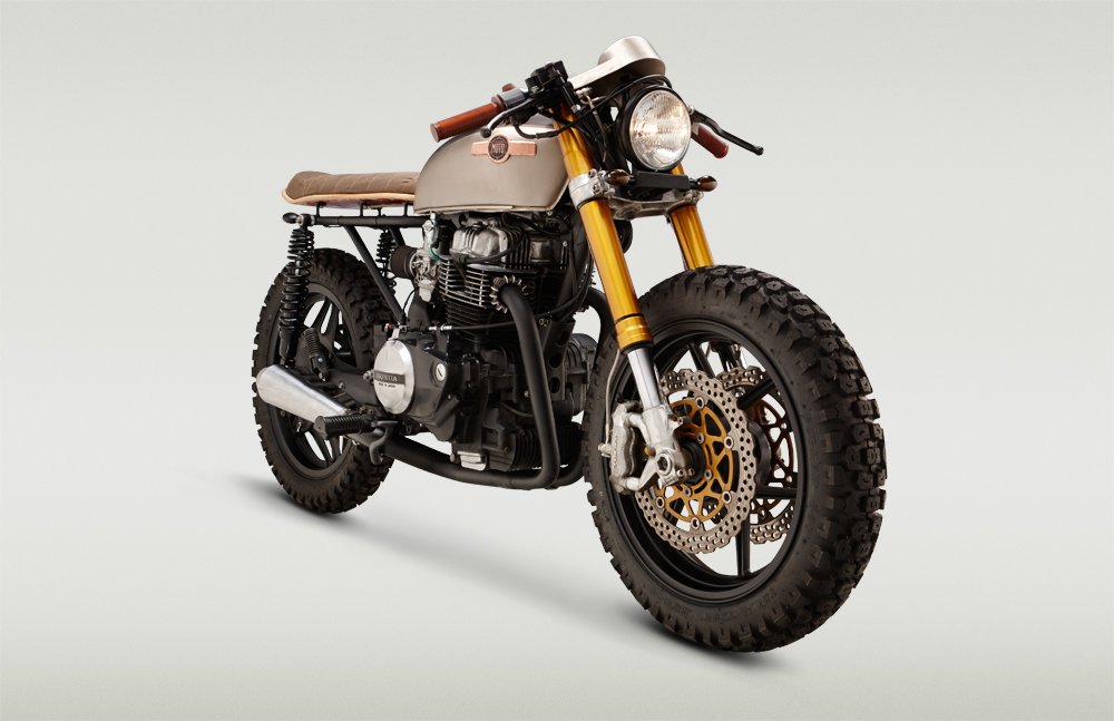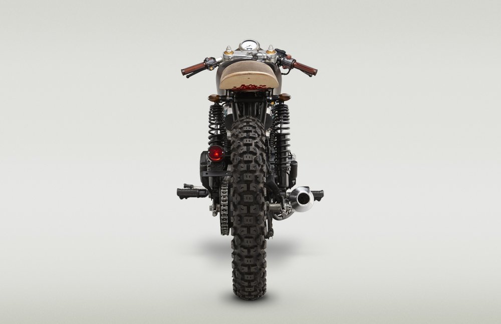 The Fox as it is nicknamed in French, Le Renard is a 1982 Honda CB450T Hawk built by John Ryland and his Classified Moto Team. Made for Justin Renard of Brooklyn, NY who was looking for his name to be worked into the project. There are some natural elements of wood and brown waxed canvas, a pop of red, and a few things rearranged for a more solid expression like mounts for the Progressive Series 12 shocks. The real treat in this machine is all in the seat, underneath it actually, made more visible by elevating the seat an inch or so off the frame rails. Artist Kristy Heilenday from Richmond, Virginia painted the pan made from a skateboard deck with a fox lying on his back in a bed of red flowers, wrench in his mouth. The cushion of the seat is upholstered by Richmond’s Roy Baird. Other fun features include the front forks, brakes and wheel from a 2005 Kawasaki ZX6R, small Shorai Lithium Ion battery powers everything for the 30 year old reconstructed motor, and a Honda CB350 model tank that’s nickel plated with a two-tone candy black stripe and copper CM badging. This is a truly elegant cafe racer.