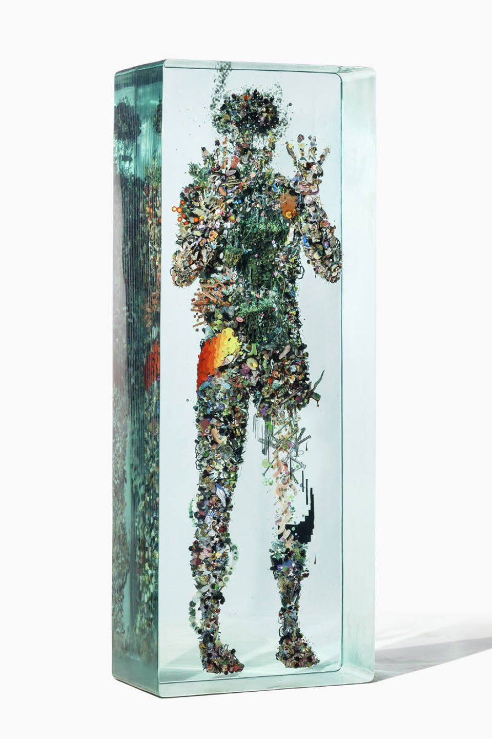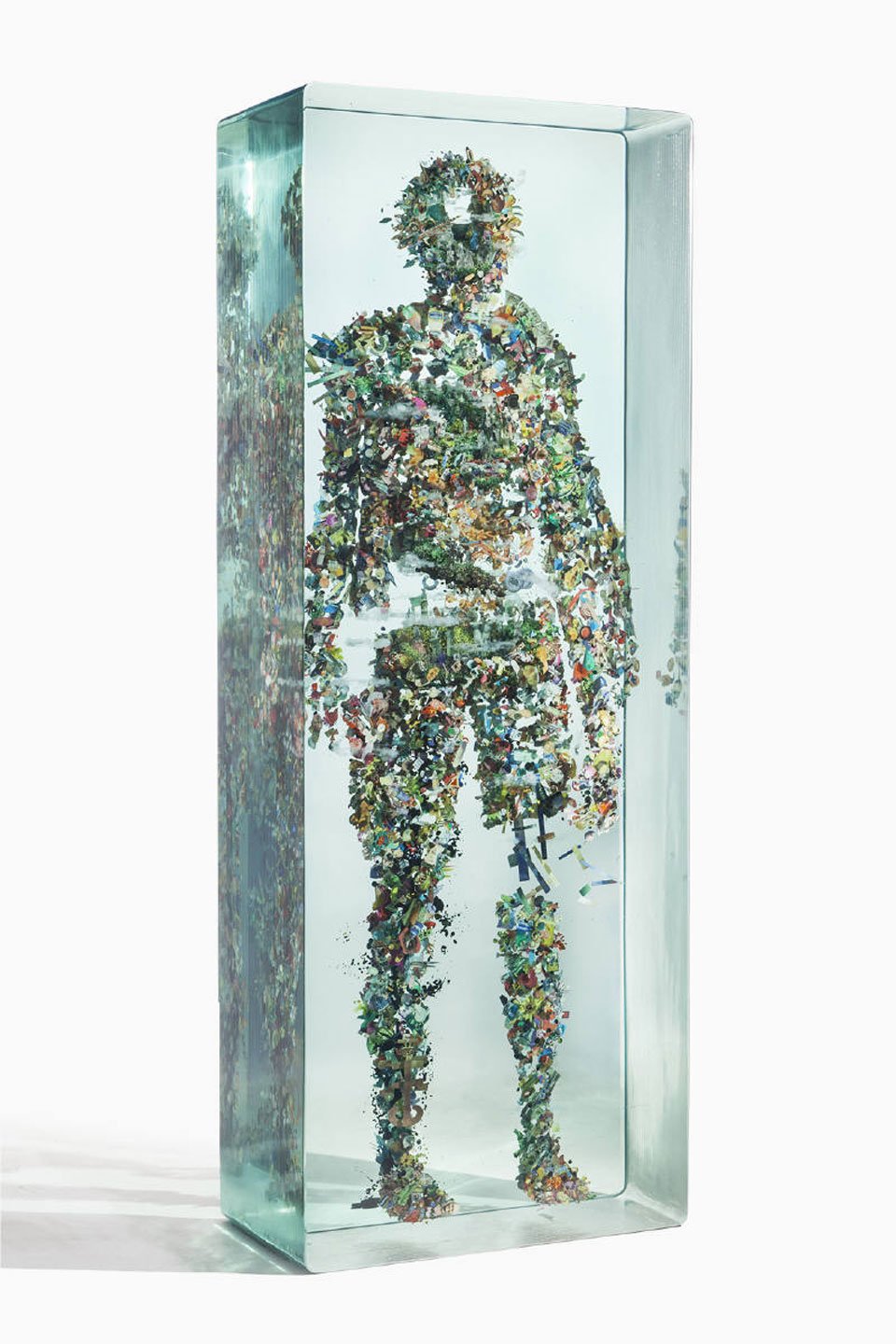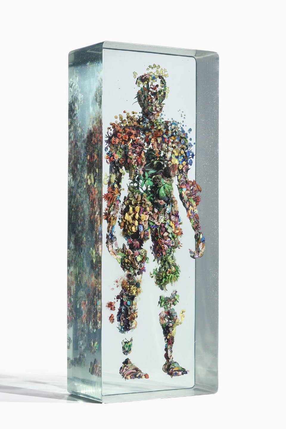 “Psychogeographies” is a term for intuitively exploring cities and, now, a series of 3D collages by Brooklyn-based artist Dustin Yellin. The collages layer magazine clippings and acrylic paint on several sheets of glass, forming a 3D and life-sized abstraction of the human form. Standing six feet tall, the finished blocks of glass look like tanks for fictional science experiments. The human figures seem trapped inside, and one presses its hands against the glass. Made up of thousands of colorful scraps, the figures represent human anatomy with parts missing, ruptured, or disconnected. Altogether sinuous and strange, the “Psychogeographies” have the appearance of a culturally-charged, nth layer to the body.