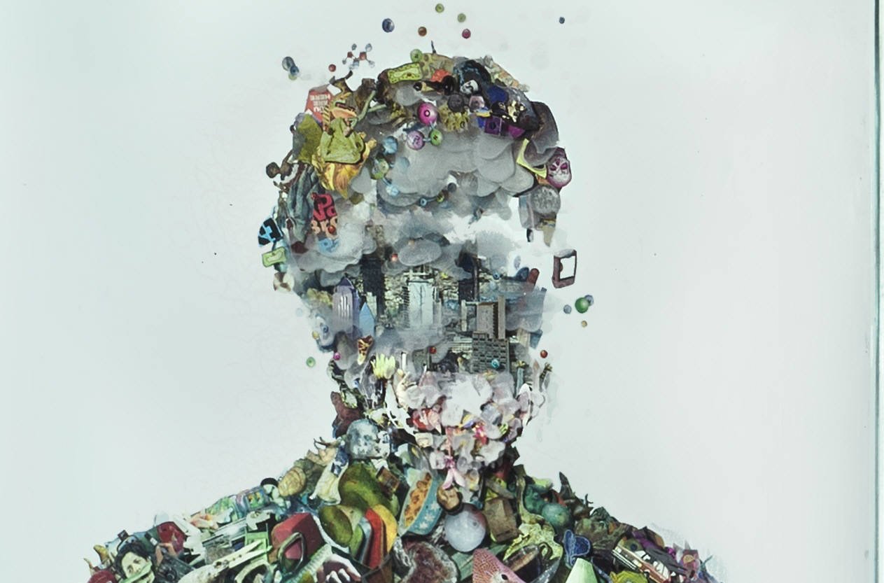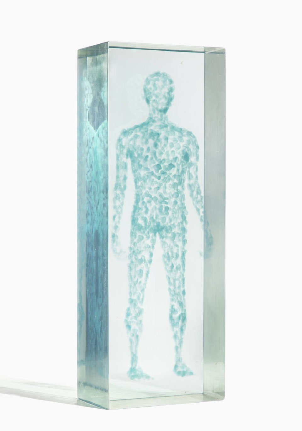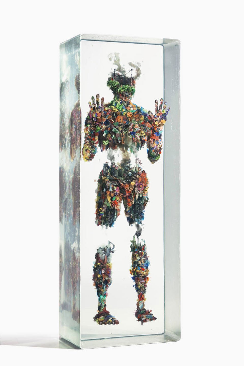 “Psychogeographies” is a term for intuitively exploring cities and, now, a series of 3D collages by Brooklyn-based artist Dustin Yellin. The collages layer magazine clippings and acrylic paint on several sheets of glass, forming a 3D and life-sized abstraction of the human form. Standing six feet tall, the finished blocks of glass look like tanks for fictional science experiments. The human figures seem trapped inside, and one presses its hands against the glass. Made up of thousands of colorful scraps, the figures represent human anatomy with parts missing, ruptured, or disconnected. Altogether sinuous and strange, the “Psychogeographies” have the appearance of a culturally-charged, nth layer to the body.