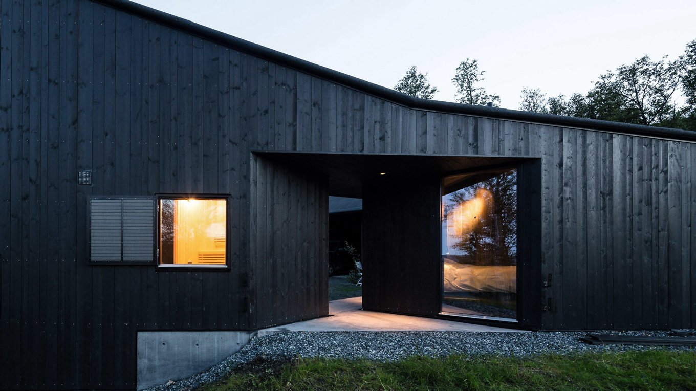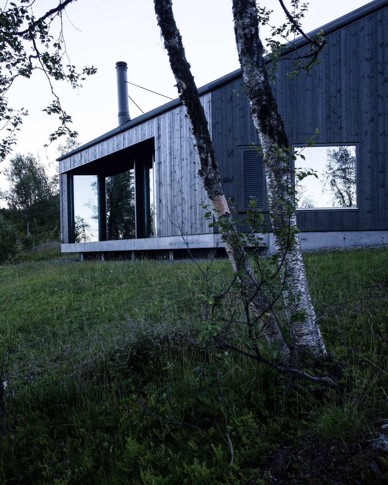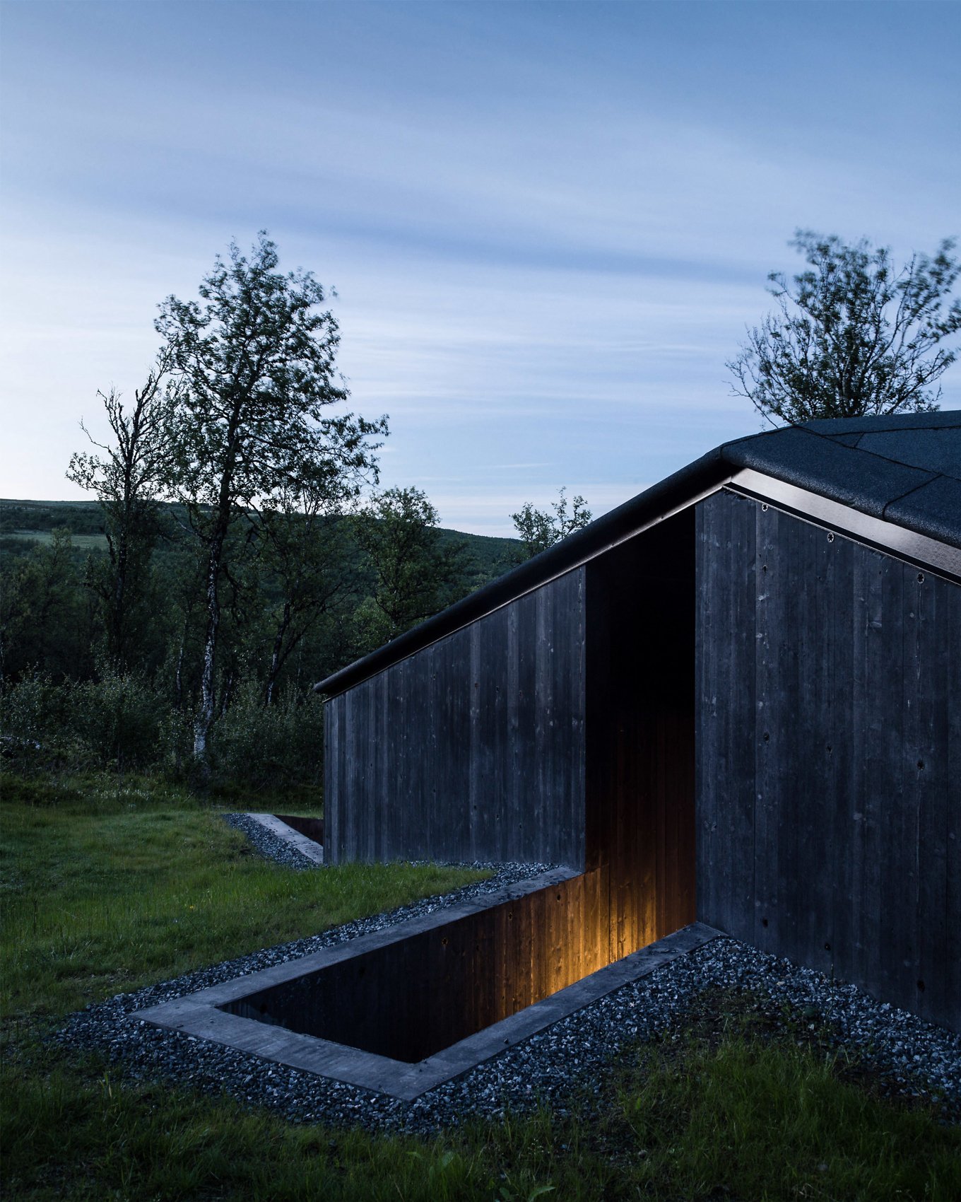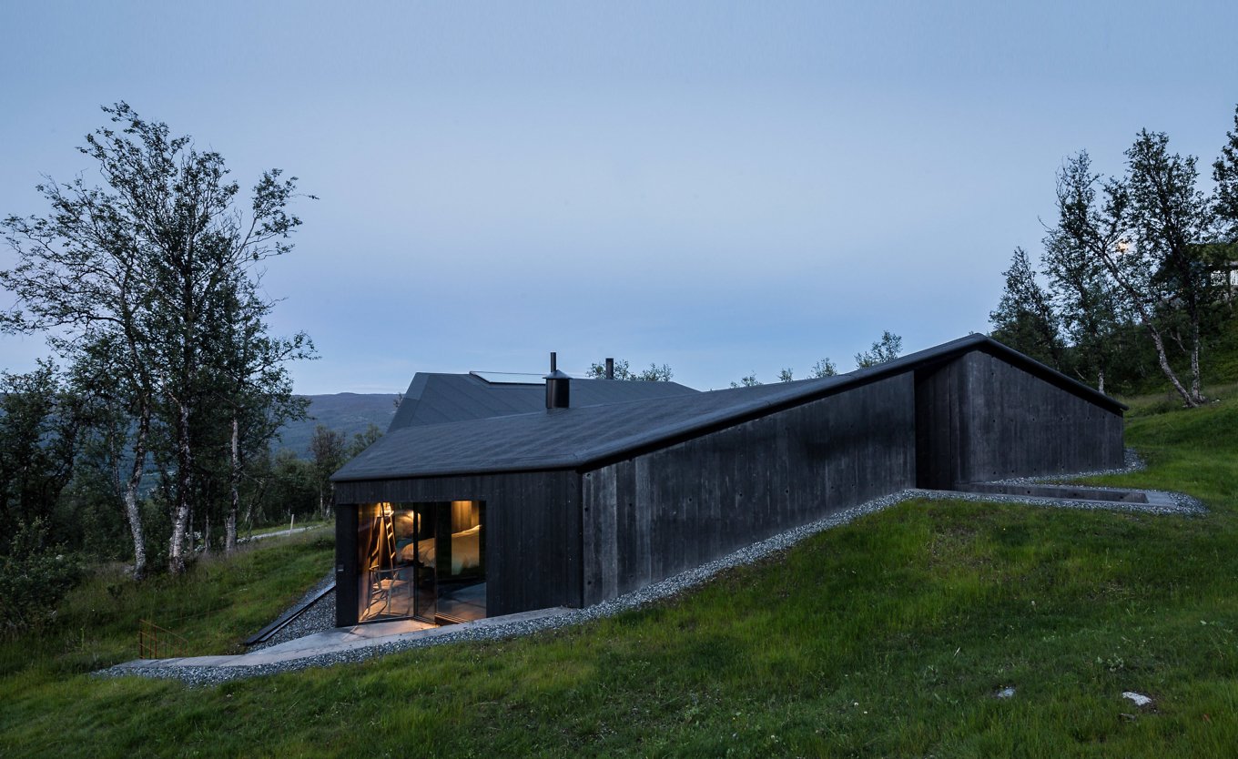 Located in a pastoral landscape in Geilo, Norway, this cabin allows its inhabitants to connect to nature and disconnect from the fast pace of urban living. Designed by Oslo-based Lund Hagem Architects, Cabin Geilo features a gorgeous blend of minimalism and traditional influences. Clad in black painted wood that pays homage vernacular architecture, the cabin stands out in the natural landscape. The structure has a distinctive geometry, dictated by the topography of the land as well as by the architects’ desire to optimize the views. The main cabin, guest house and garage are connected in a U-shape which also creates a sheltered courtyard.