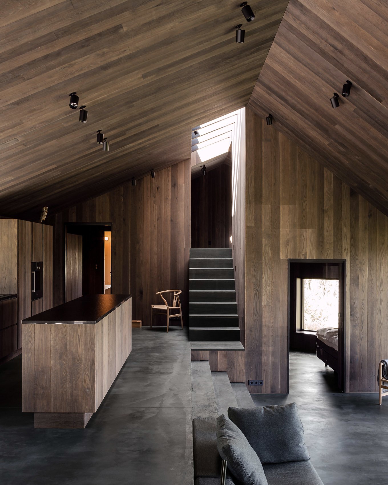 Both the exterior and interior feature black tinted concrete. Inside, oak darkened with iron sulphate gives the living space a refined appearance while also complementing the black accents. Large windows provide sweeping views of the Geilo valley below. Along with the skylight, they fill the interior with natural light. In winter, the cabin is accessible only by ski and snowmobile. Set low in the plot of land, the minimalist cabin covered by a blanket of snow becomes burrow-like, creating a cozy ambience accentuated by the sounds of crackling wood in the suspended fireplace. Photography by Marc Goodwin.