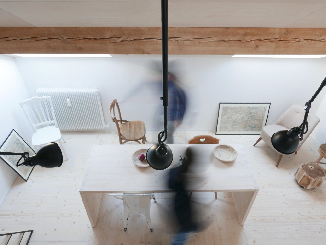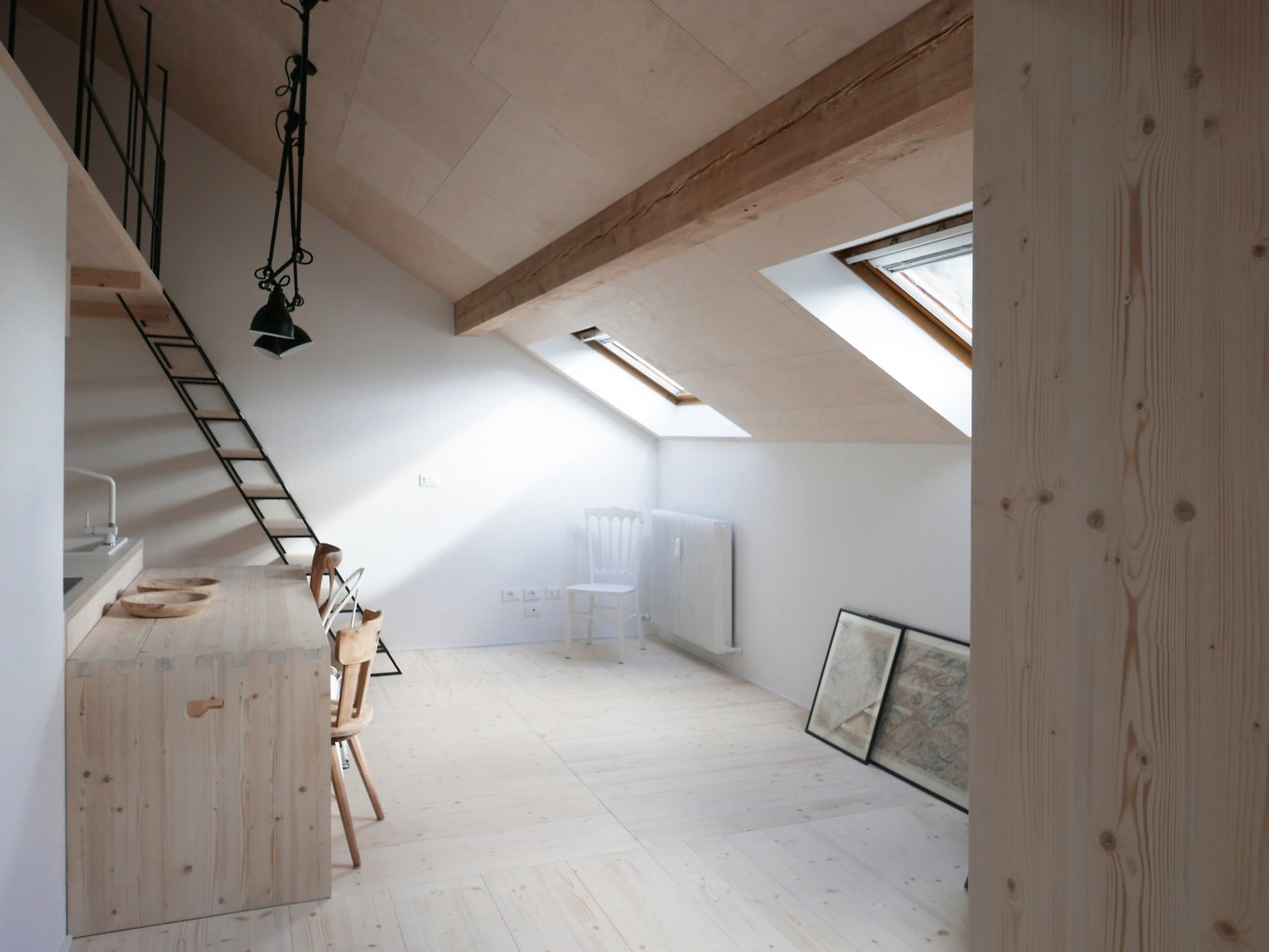 Located in the old town of Sterzing, in South Tyrol, Italy, the FWH House is a cozy and welcoming dwelling surrounded by a breathtaking landscape. The attic apartment is compact, measuring just 46 square meters, but Jab Studio maximized the available space to create a roomy and versatile interior. A double-height ceiling and an open-plan design promote spatial continuity and the connection between different areas of the apartment. The living room doubles as a guest room and opens up or separates itself from the other rooms, as needed, while the mezzanine area houses the main bedroom. Natural light floods the interior through the three skylights, creating a relationship with the natural landscape at the same time.