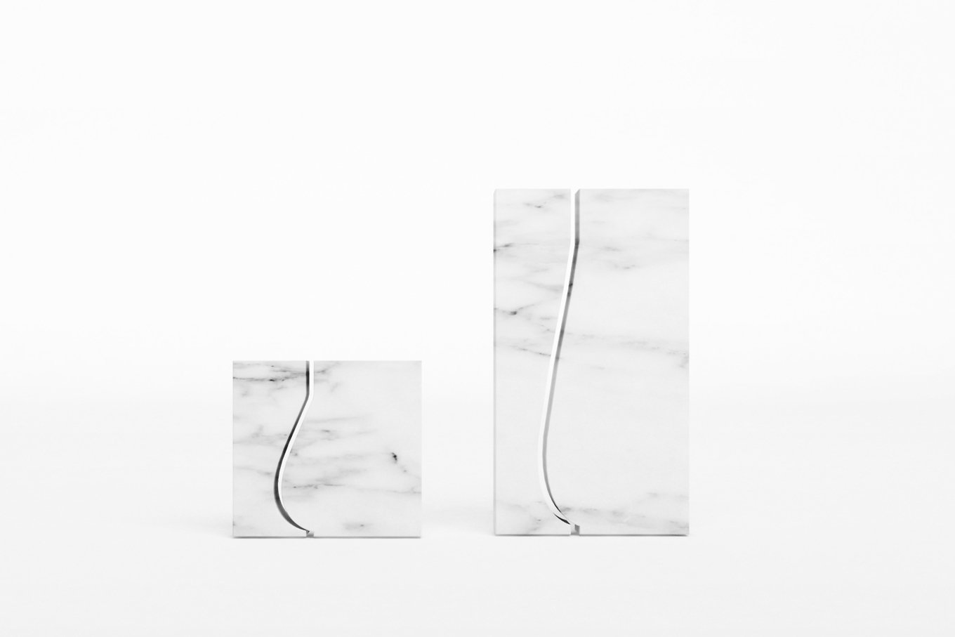 Much like the Suspended Collection that provided a powerful commentary on the state of modern-day marble processing, “Recisi” also hides more under the surface. Designed by Moreno Ratti, this collection intrigues by referencing childhood memories in a subtle way. The Italian word “recisi” refers to cut flowers prepared for ornamental vases, but gains a slightly different nuance here. Using water jet technology, the designer cut the marble into precise shapes that remind of the charm of paper cutting games. Ratti reimagined the magic of exploration and discovery of the form – uncovered by cutting bright white paper – in a more sophisticated medium. But the results share the same concept of subtraction, elimination and re-composition.