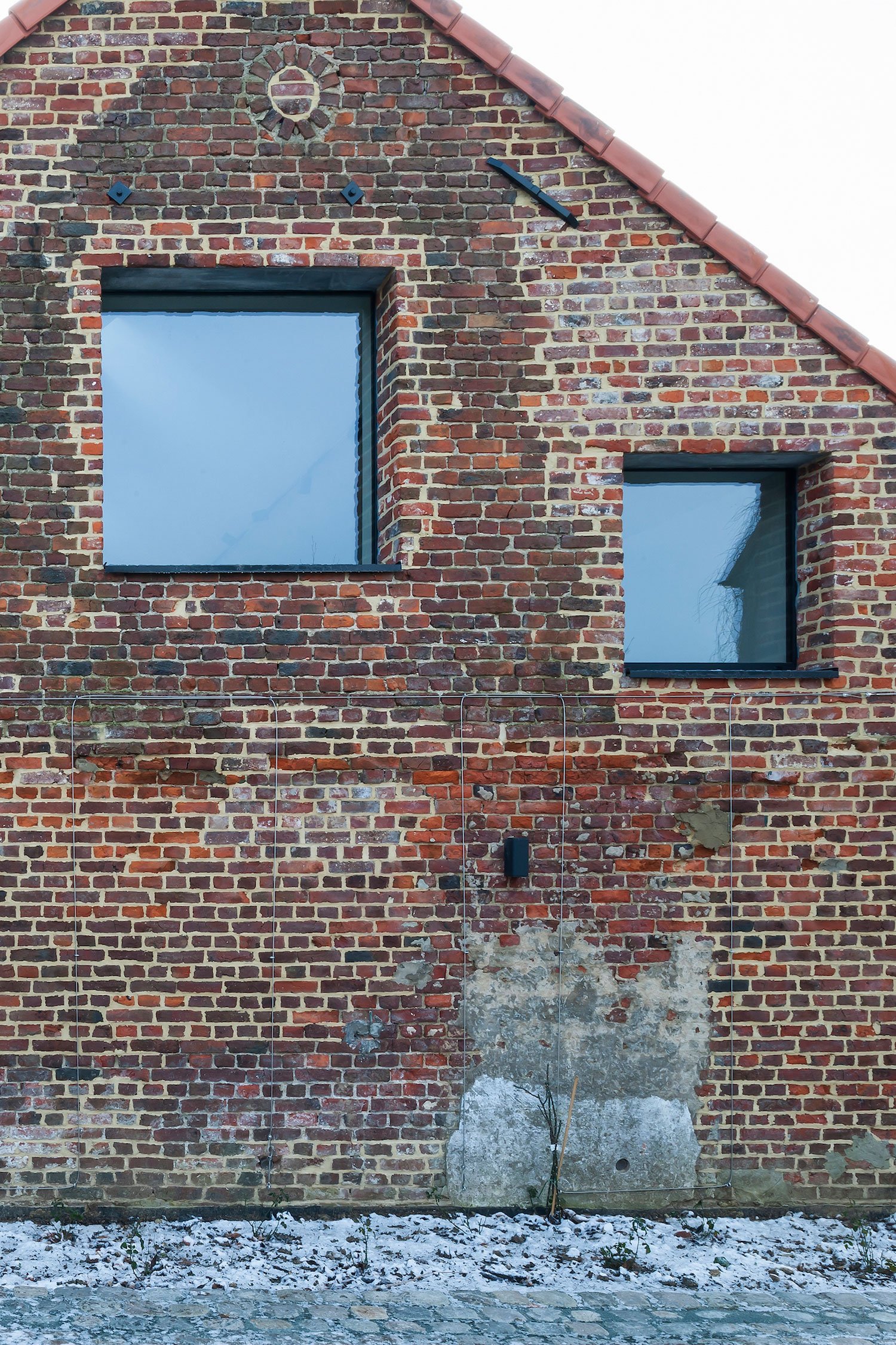 Rural architecture and contemporary design are brought together in a blend of old and new in this charming barn located in West Flanders, Belgium. Built in the early 1900s, the stable contained several smaller rooms divided across two floors. Studio Farris Architects, an architecture practice based in Antwerp, was hired by the owner to transform the unused space into a home office separated from the main house. The studio approached the project creatively, deciding to use the shape of the old building as a foundation and starting point for the final design which ultimately enhances the perception of the stable’s original form. The upper floor was removed and a concrete box was built within the brick walls, to improve energy efficiency and to protect the interior from the sulfates present in the farm’s ground and original walls. A large skylight, extra windows, and a glass sliding door were added to allow more natural light inside. For the furniture, the architects used several wooden beams, cut and arranged in a unitary sculpture. This ingeniously designed wooden object is multi-functional. It divides the interior into a meeting area, reading and seating spaces, a library, and an office at the mezzanine level. It also offers storage areas, bookshelves, and includes steps that provide access to various levels. Just as convenient as it is striking, this creative work space redefines the meaning of home office. Photography by Koen Van Damme.