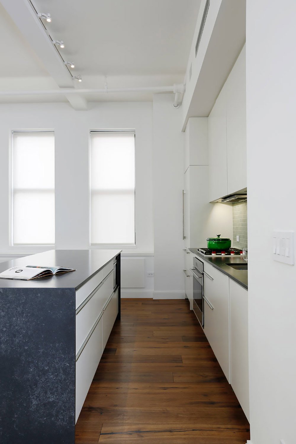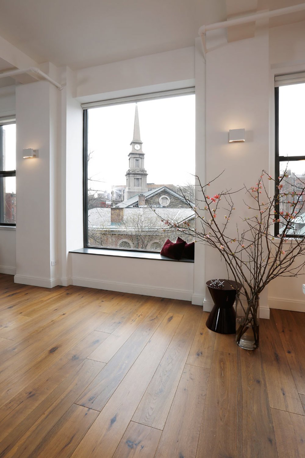 Located in the East Village, this spacious loft offers beautiful views of St. Mark’s Church in-the-Bowery and a living space filled with natural light. The owners hired the Shadow Architects firm to design and reorganize the interior. The heart of the home is the large open plan area housing a living room, dining room, and kitchen. Here, the tall windows present on three sides create a bright and welcoming space by letting in generous amounts of natural light. The lounge area offers access to a spacious home office and studio, which is separated from the rest of the room by sliding doors made of glass and blackened steel; a projector is placed above, working with the roll-down screen to offer a convenient way to watch movies and TV. In the dining room, Flos Lighting Aim Lamps are placed above a custom-made table made of reclaimed wood. The bathroom is modern and features a striking custom photo mural wallpaper from Swedish company Mr Perswall; the giant white flowers seem an abstract pattern at first sight, their organic beauty complementing the clean lines of the rest of the bathroom beautifully. Throughout the apartment, wooden floors add a touch of warmth and rustic allure, providing the perfect balance in a home where white walls, dark accents, and contemporary furniture create a modern and stylish interior. Photography by Elizabeth Lippman.
