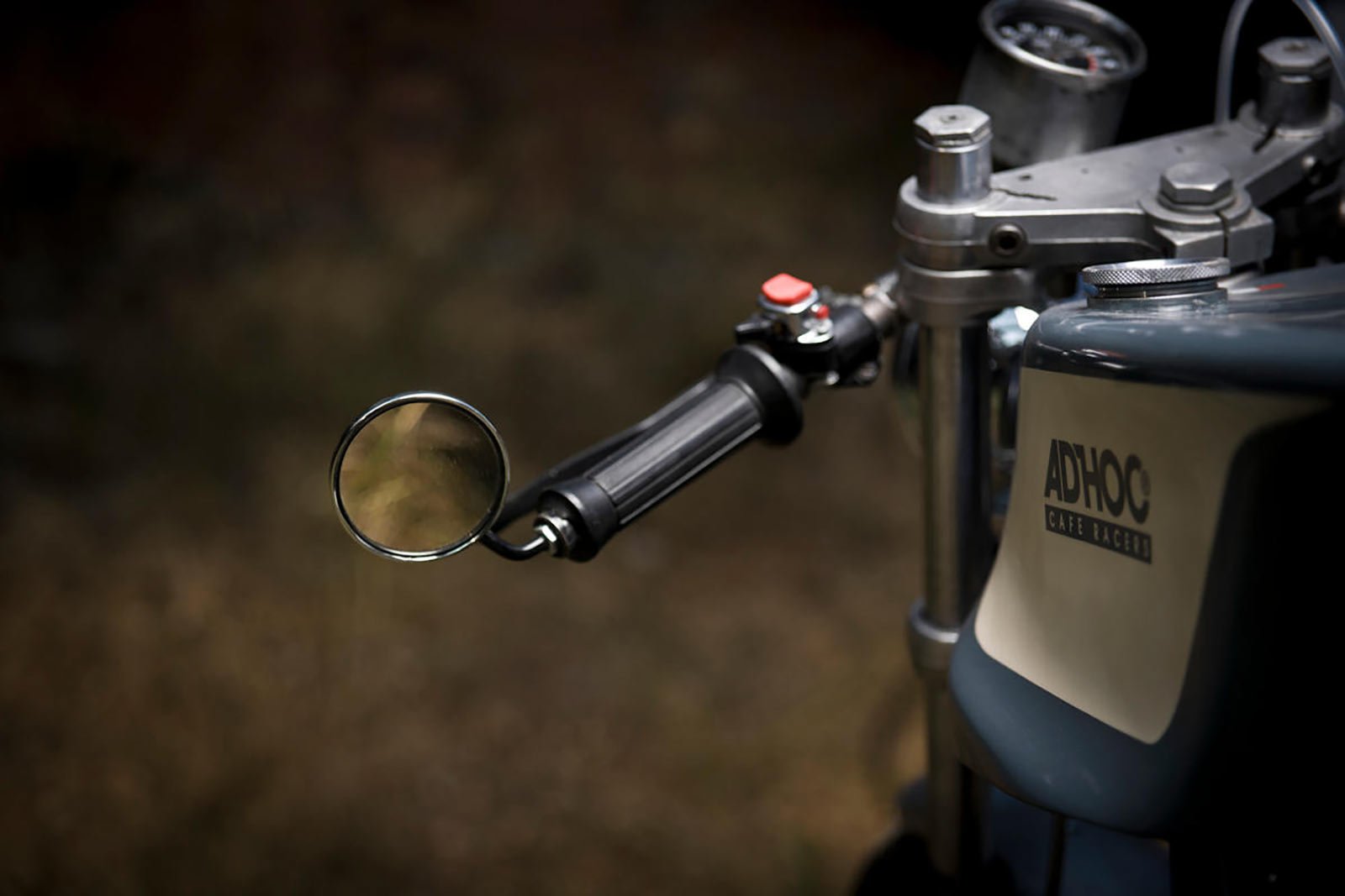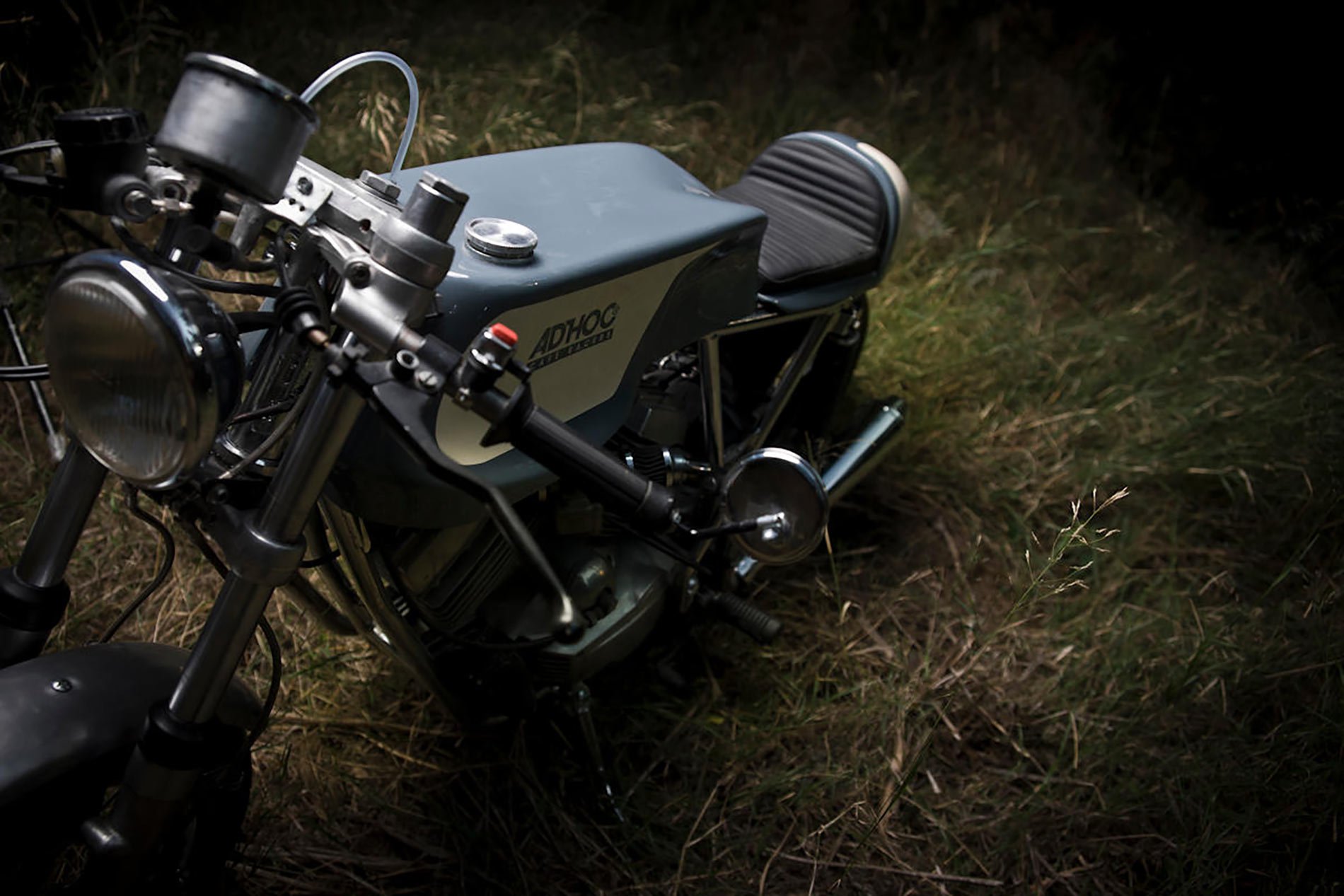 The bike was first deconstructed so that the frame could be shortened at the back and chromed. He then breathed life into the frame with parts from other broken-down bikes; the fenders of a Puch mini-cross bike; the seat and tank from a Europlast. All these parts had to be modified to fit the Moto Morini’s frame, along with a complete rewire. To find a dual-disc front hub that would work with the bike’s spoked wheels, David used a Honda Transalp that he matched with a Moto Morini Coguaro’s rear hub. All the parts and models put into this one bike can be a bit hard to keep track of, but it displays just exactly why he named his company Ad Hoc; his skill as a mechanic grants him a unique intuition for the universal aspects of bikes, combining seemingly incompatible parts with a surgical skill. This combines with a keen aesthetic eye, as seen in the final touch of painting the bike with a Subaru color that contrasts nicely with the chrome frame. His process reminds me a lot of the renovation projects that often get featured on this blog; a process of seeing the potential in the old instead of blindly embracing the new. And when it’s done with such a deft hand, it transcends the constraints of time and truly becomes an art.