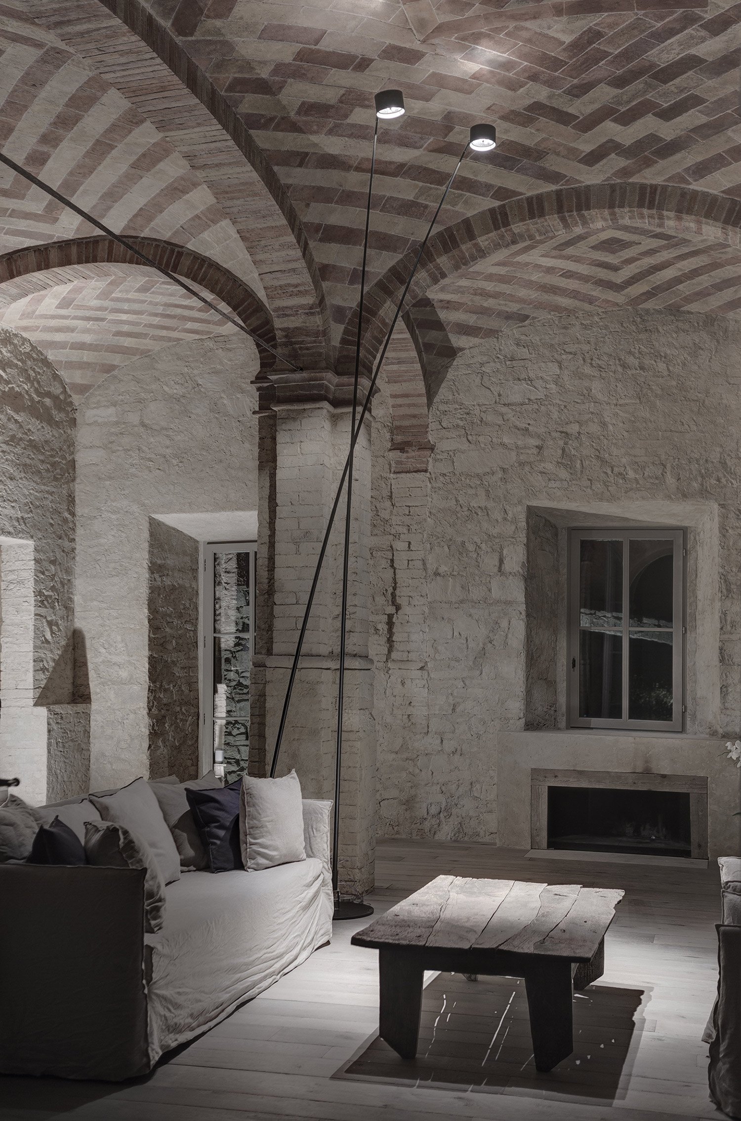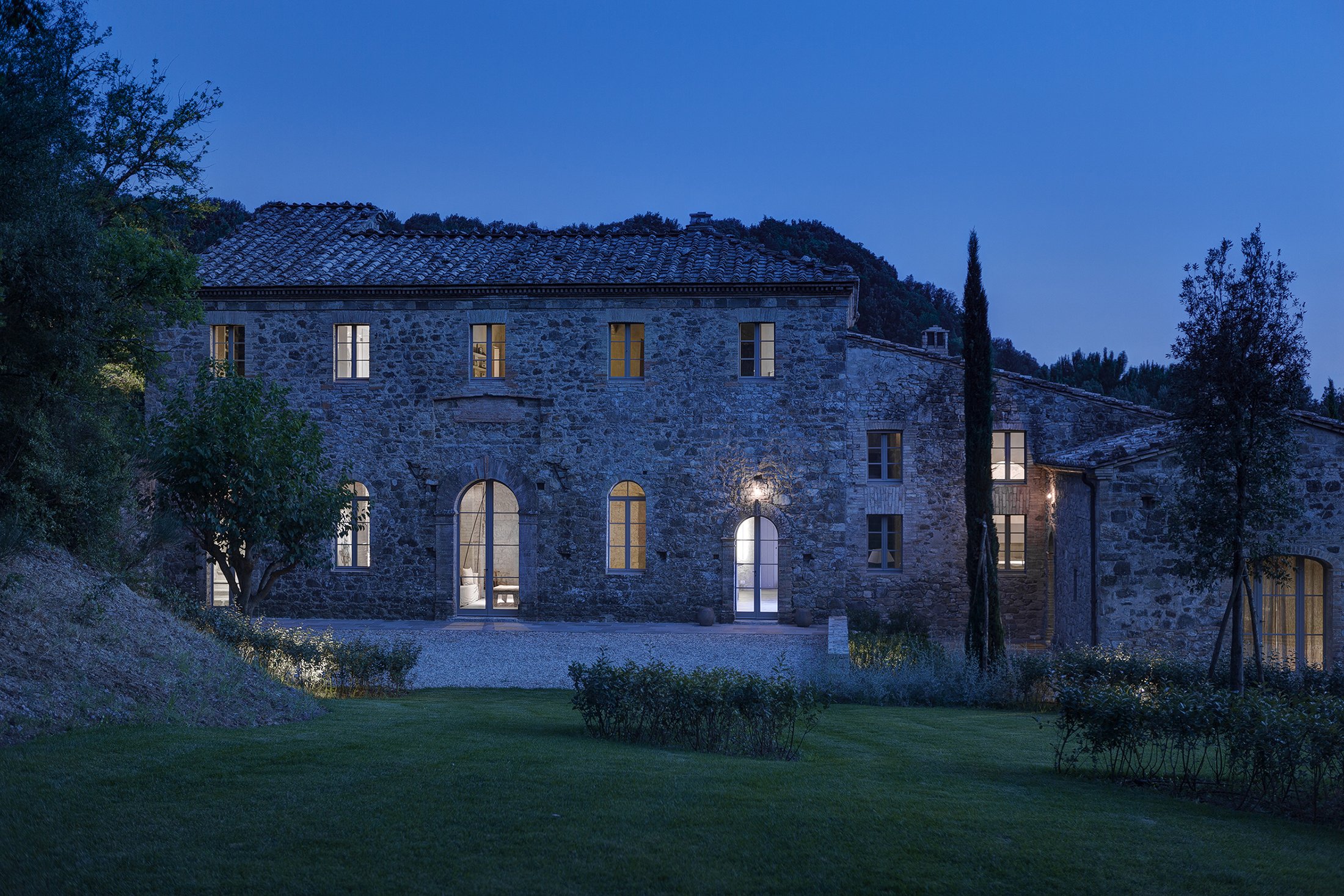 When we talk about architecture, we talk about light. How it moves through spaces, how it penetrates façades, and how it interacts with us in our daily routines. So it’s not uncommon that most of the time we focus on how a building looks and performs in the daytime. But to discuss Marco Pignattai’s work on remodeling a house in Montalcino, Tuscany, we must approach the project as dusk retreats to the night, for this truly house shines as a nocturnal marvel. As daylight creeps away from the Tuscan villa, it is replaced by the glow of carefully organized light fixtures, beacons that guide us both to, and throughout, the home.