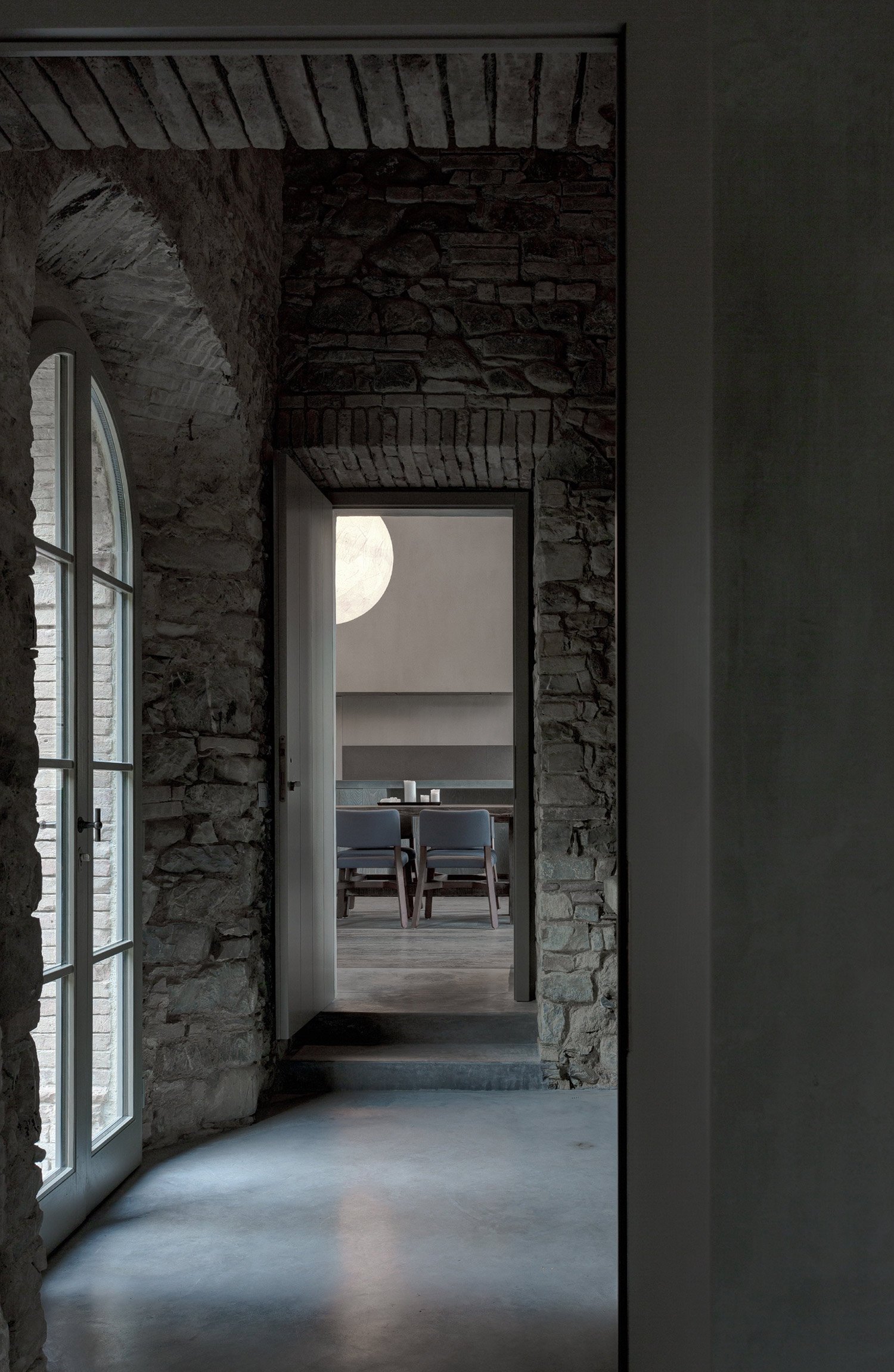The lights are designed with the intent of embracing the home, created in partnership with designer Davide Groppi. The home is dotted with sparse twinkles, points of light that try to delicately maintain the natural calmness of the landscape in the dark with a need to invite your approach. Though few in numbers, these lights still provide an adequate path to the home, which glows through its stoic windowpanes. One window in particular peaks your curiosity, as it lets you inquisitively witness an unusual globe in the interior. Entering the house you find this to be the “Moon,” an enormous light that illuminates the kitchen in a soft manner that reflects the quality of its namesake’s glow. This moon acts as the centerpiece for the interior’s design, and despite its size it never feels overpowering.