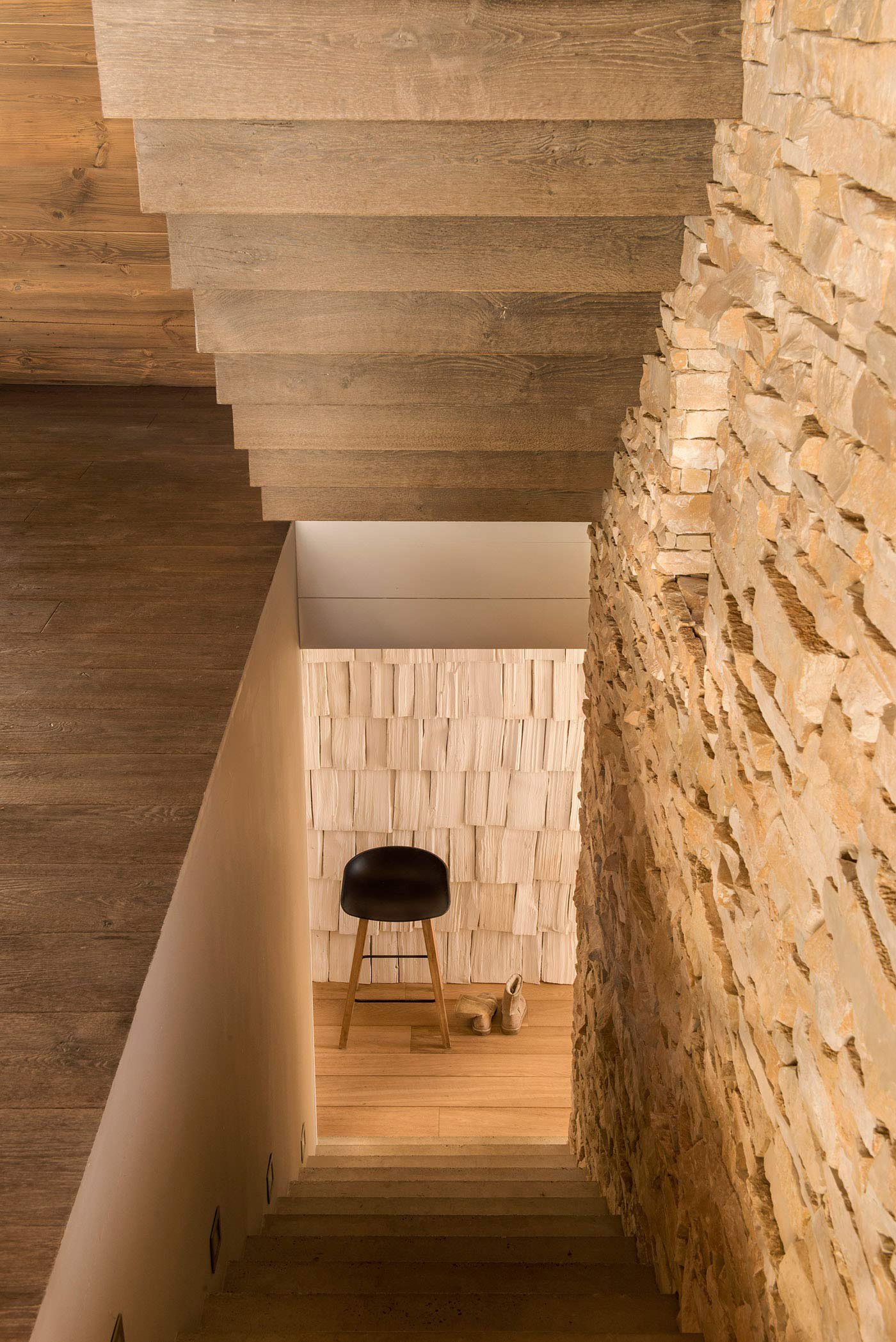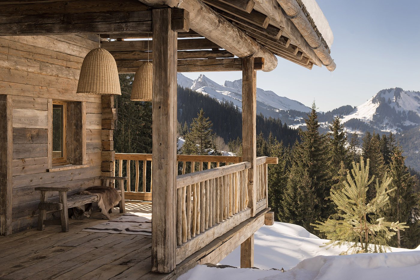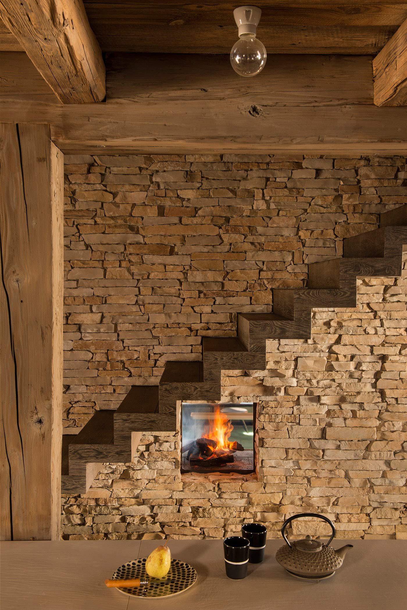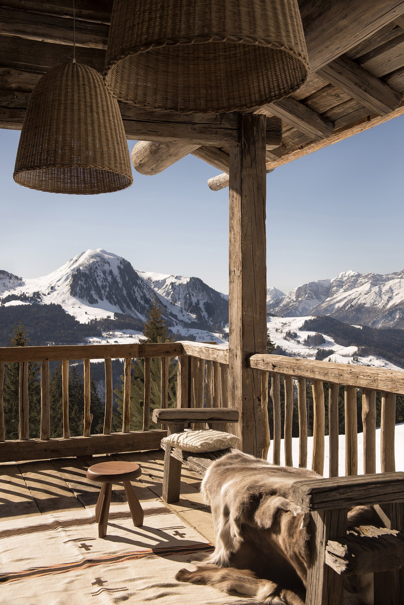 Blanchet collaborated with local craftsmen to modify the structure and to maintain its walls intact. A section of the terrace was elevated on stilts and some of the floors were carefully replaced. The cabin has now three levels and offers breathtaking 180 degrees views of the majestic Alps. Inside, the color palette is dominated by shades of brown and beige, creating a warm, comfortable, and welcoming space. The wood used throughout the interior has been exposed to the elements and then expertly hand sanded to brighten its tone, achieving a unique vintage effect that makes the beams, ceilings and floors seem like they are original features preserved from the 19th century. Light brown Bourgogne stones featuring irregular surfaces, a small fireplace integrated into a kitchen wall, wicker and fur accents, all contribute to create a timeless look and feel infused with an undeniable rustic warmth. The kitchen, bathrooms and living room have a few modern and eclectic furniture pieces, but all of them were chosen to integrate into the space and to complement the rest of the cabin with their minimalist look. This idyllic vacation house provides more than place to enjoy a break from the bustling city life, it offers a home away from home.