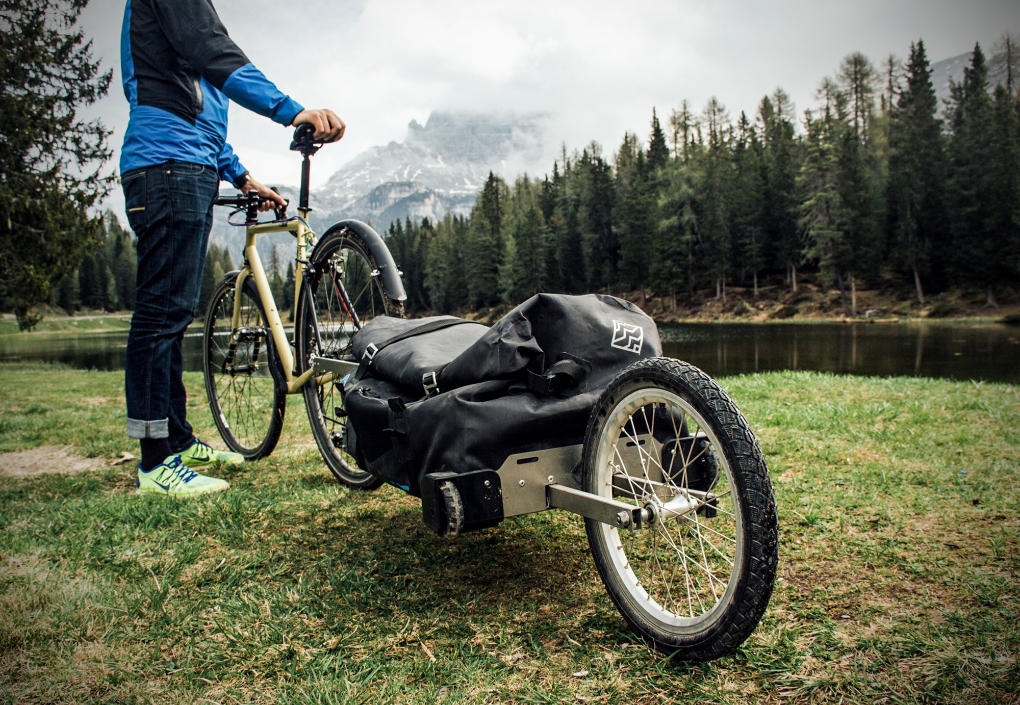Despite its numerous advantages, bike travel is often dismissed as impractical, cumbersome, and/or inconvenient. Anyone who has tried to travel long distance on or with a bike knows just how costly and complex the process can be; existing storage solutions often involve elaborate modifications with extremely limited potential carrying capacity. But thanks to Italian outdoor brand Sentier Adventure Gear, travelling by bike has never been easier. Their Bike Trolley (live on kickstarter until June 24) combines trailer and bag into a single unit; a seamless duffel made from ripstop Nylon and PU sits in a wheeled carriage that can be easily attached to the back wheel of any bike from road to mountain as long as there is a quick-release skewer.