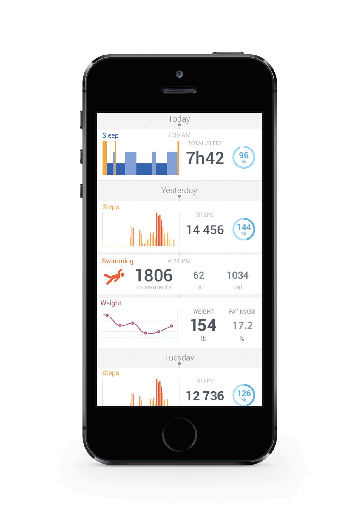 The wellness device and app also track the time and quality of sleep and provide an alarm to help jumpstart the morning. The alarm time can be checked on the watch with a double-tap of the responsive glass, and the time automatically resets for daylight savings time and changes in time zone.