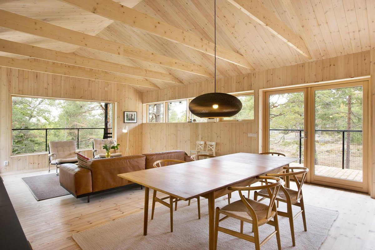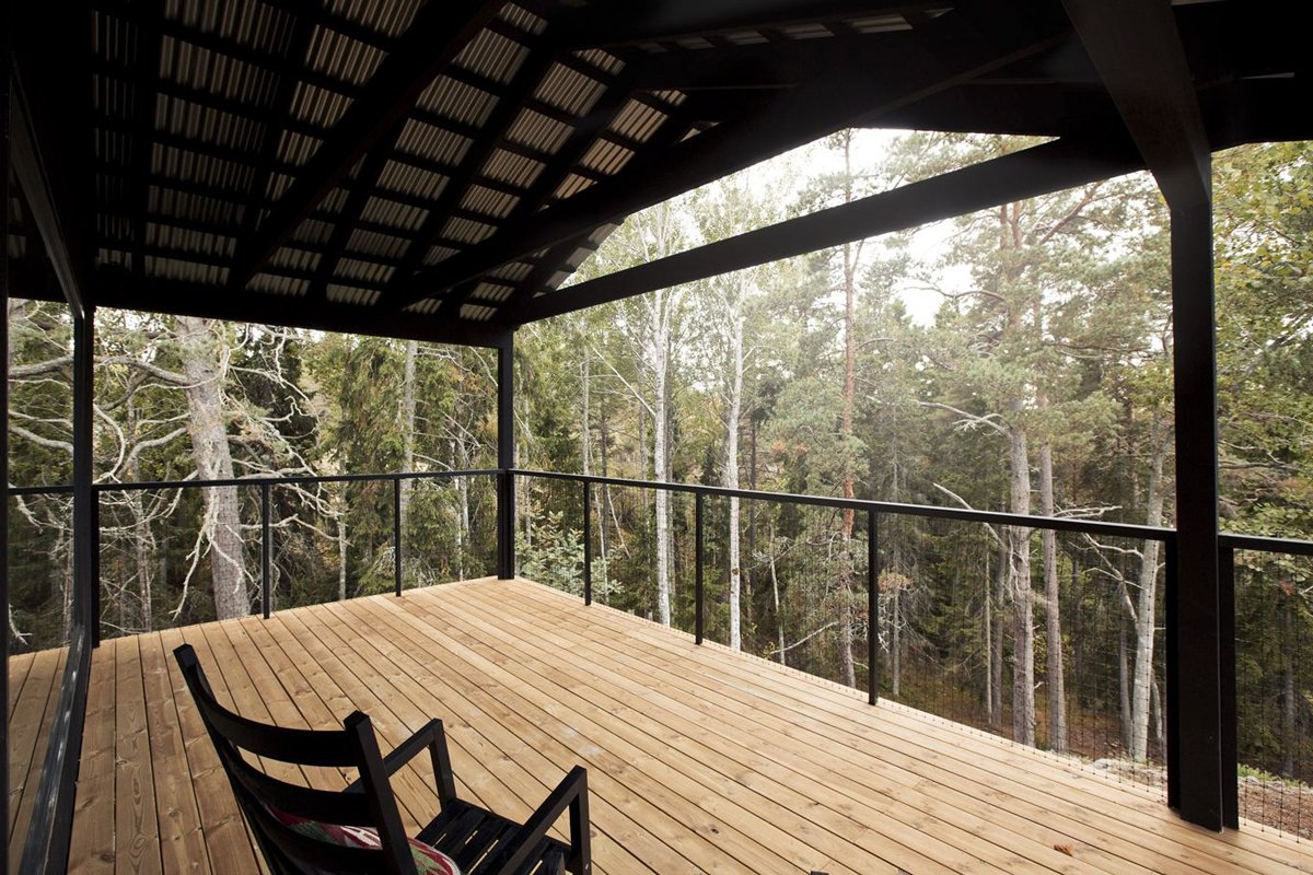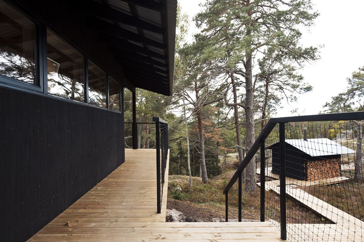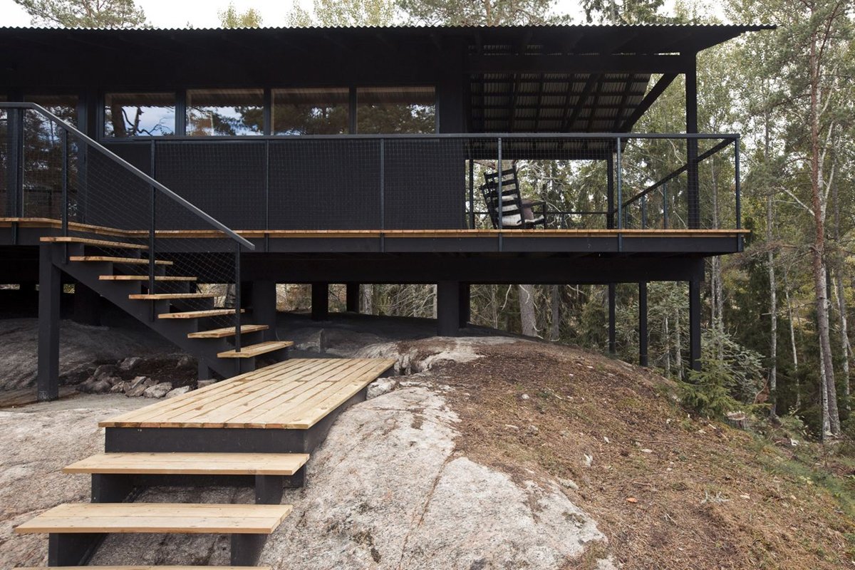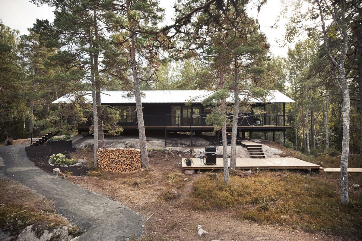 Created by architect Max Holst and developer Strömma Projekt AB, this small home can be found on Vindö, an island in the Stockholm archipelago. The house stands on black concrete plinths and is positioned beside a gorge. From the gorge, pine trees and hardwoods reach up, grown to eye level. The rare view can be appreciated from the sheltered terrace, which connects the natural wooden interior to the black painted exterior and the surrounding environment. In order to embed the construction in the natural world, the architect used many locally sourced materials, such as timber for the exposed rafters and opened up the interior with large windows. Light and woodsy, the cabin offers many opportunities for the homeowners to take in the surrounding trees and granite outcrops.