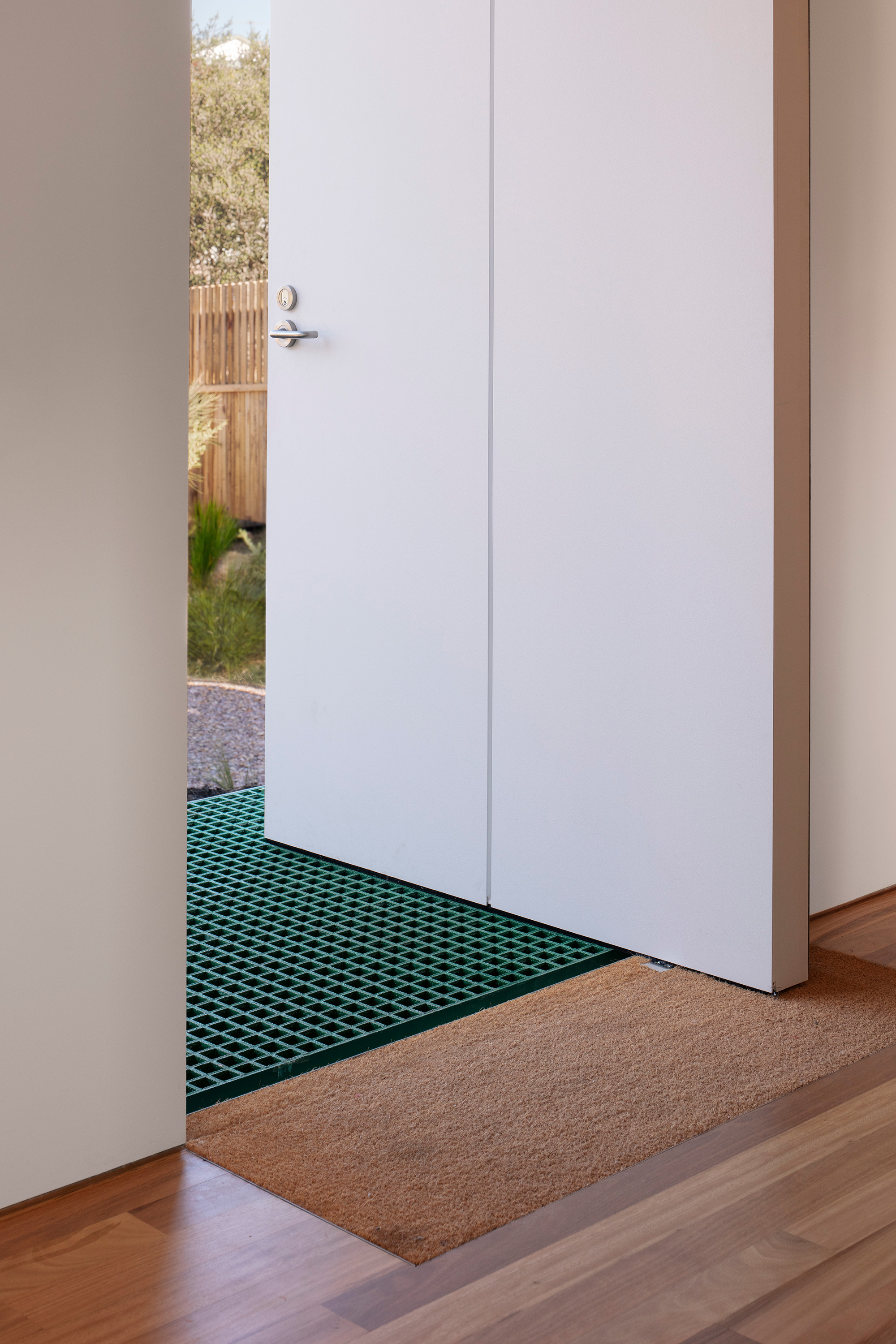 At the front, there’s a green kitchen and dining room along with a kitchen. Upstairs, there’s a home office. The middle contains a power room and a laundry room, while the rear houses two bedrooms with their own bathrooms. This zone also features a guest sitting room. To ensure a separation from neighboring houses, the studio added skylights in the western and eastern wings. The openings capture both the morning and the evening sun while maintaining privacy. Additionally, windows curate different views of the site and the garden. Extending the kitchen area, a wood deck provides the perfect opportunity to relax while basking in the midday and afternoon sunshine. The residents can also open doors to create a seamless flow between the front, center, and the back of the house. Photography © Ben Hosking.