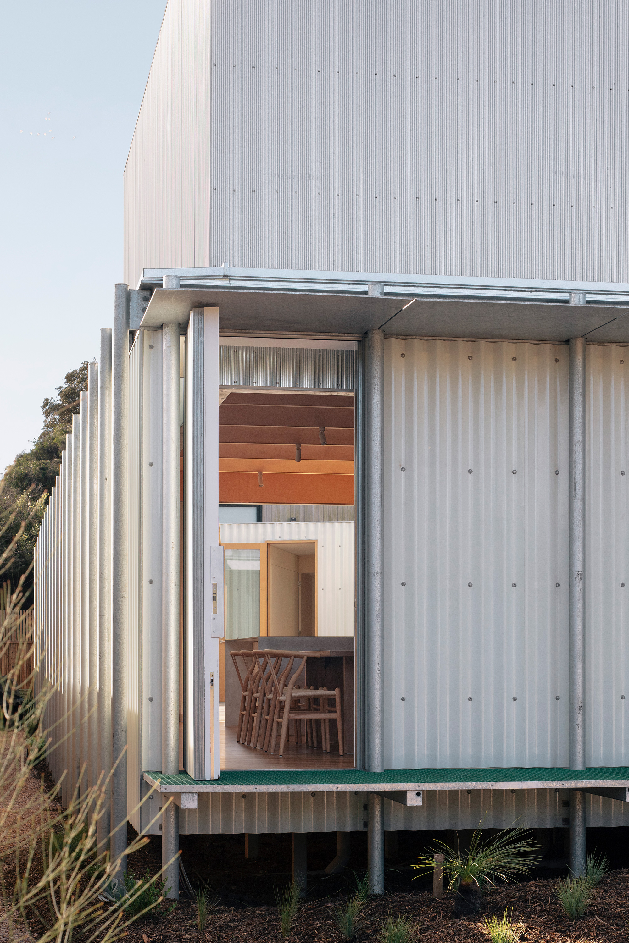 Located in Barwon Heads, Australia, AB House is a second home specially designed to provide privacy to family member without sacrificing the feeling of connection and closeness. Architecture firm Office MI-JI raised the building off the ground due to a flooding overlay. The house boasts both angular and curved forms that create a dynamic design. Durable, low-maintenance steel covers the exterior. The architects specially designed the living spaces with separate programs that allow a greater degree of privacy. At the same time, the layout allows the residents to come together when needed, with zones organized according to the family’s needs for long-term or short-term use. A curved corridor cuts across the length of the house, linking different areas and arranging the programs.