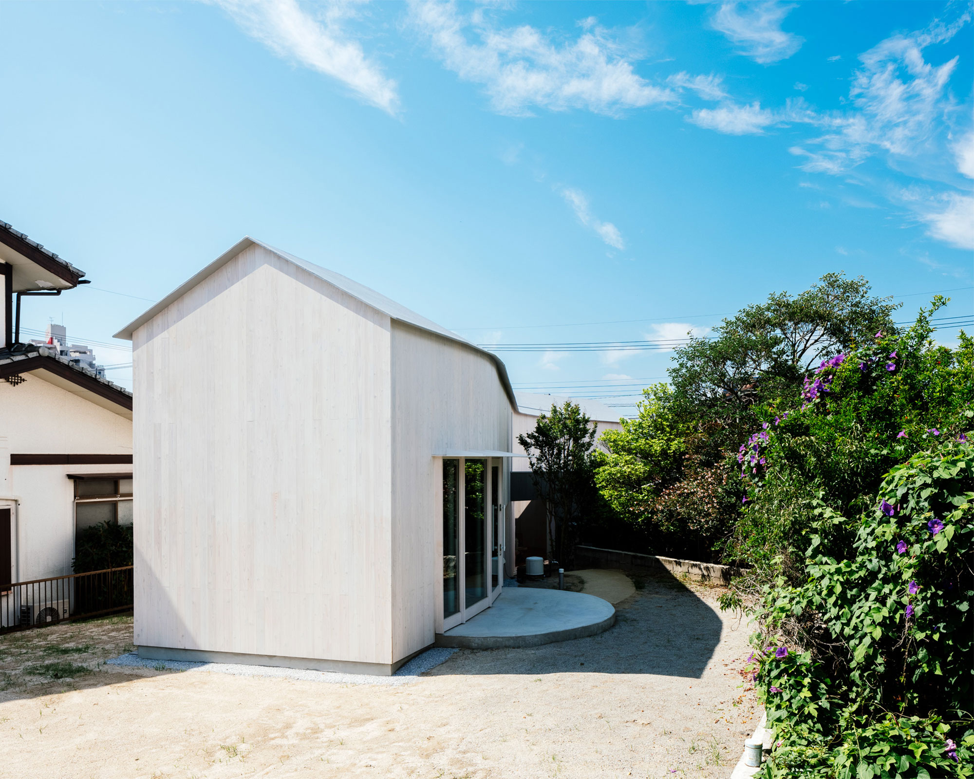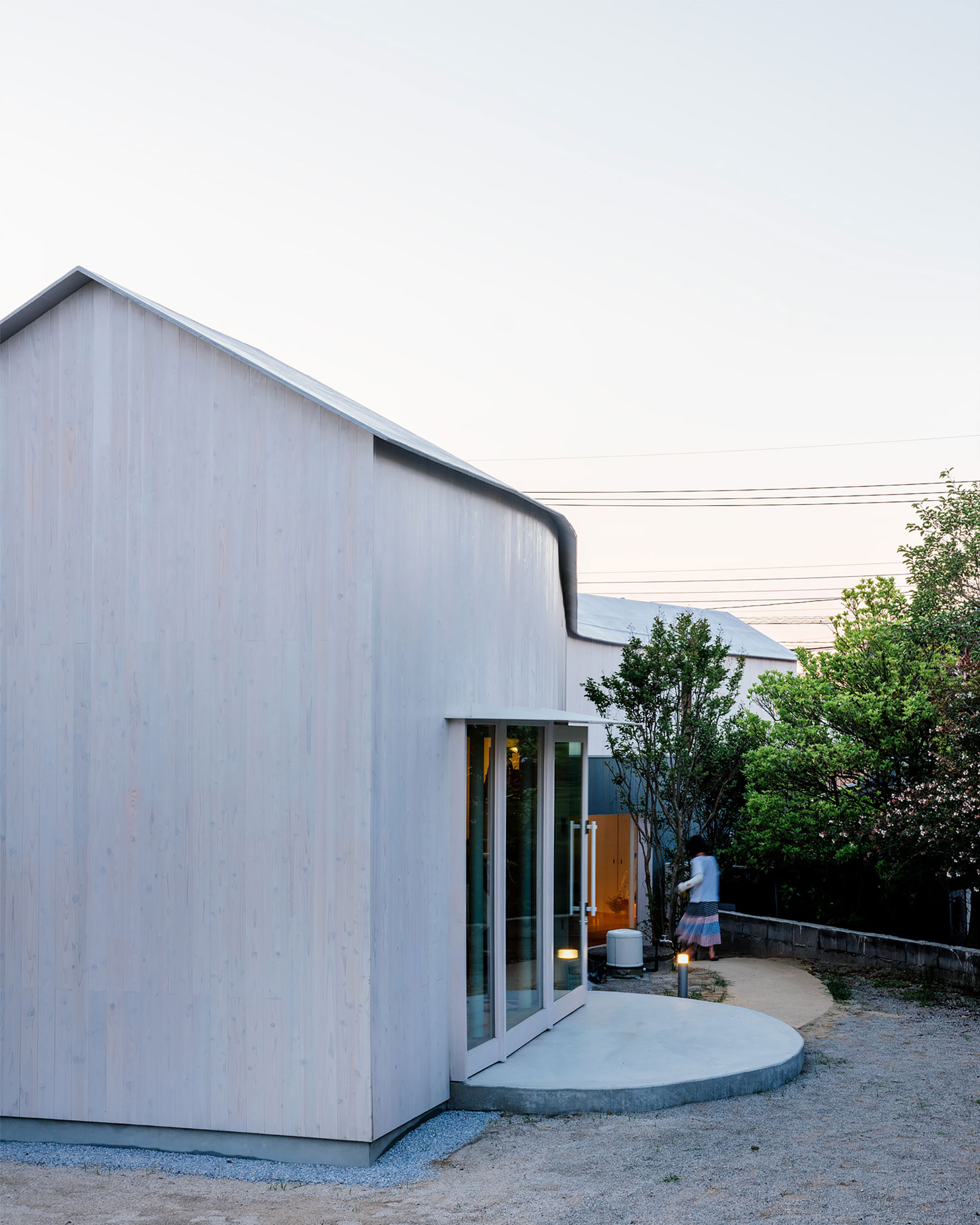 The minimalist architecture lets the shape of the building take center stage – the exterior features virtually no detailing apart from the addition of some curved and circular elements. Finished with pale wood siding, the house becomes a beacon of brightness in the neighborhood, especially when illuminated by sunshine. Looking at the narrow plot, it becomes clear that the curving form optimizes both privacy and space. The studio used few openings to ensure the solitude of the living spaces, with larger glass doors added only in areas that open to greenery or to a private terrace.