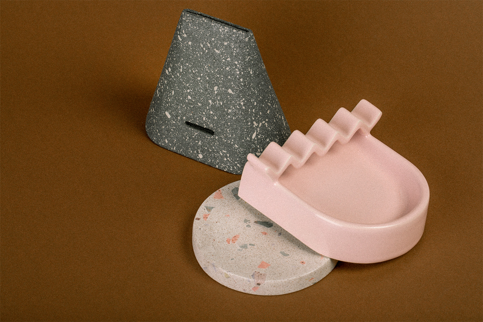 The designer uses materials with exceptionally tactile surfaces, from terrazzo and marble to ceramic and cast concrete. Some of the designs remind of ancient artifacts thanks to organic forms and rough surfaces. Others offer a tongue-in-cheek take on simple, everyday objects. The best example is the Zig Zag ashtray, a fun design that pays homage to the bold and highly influential work of the Memphis Group. Or Masas I, a concrete candle holder that resembles soft wax “poured” on the table in an organic, curved shape. The Algo Studio collection also enhances textures with the use of color. Bright green and orange objects bring a vibrant accent to a kitchen, dining room, or office space. Likewise, materials like marble and terrazzo transform simple objects into refined, decorative items. Photography© Algo Studio.