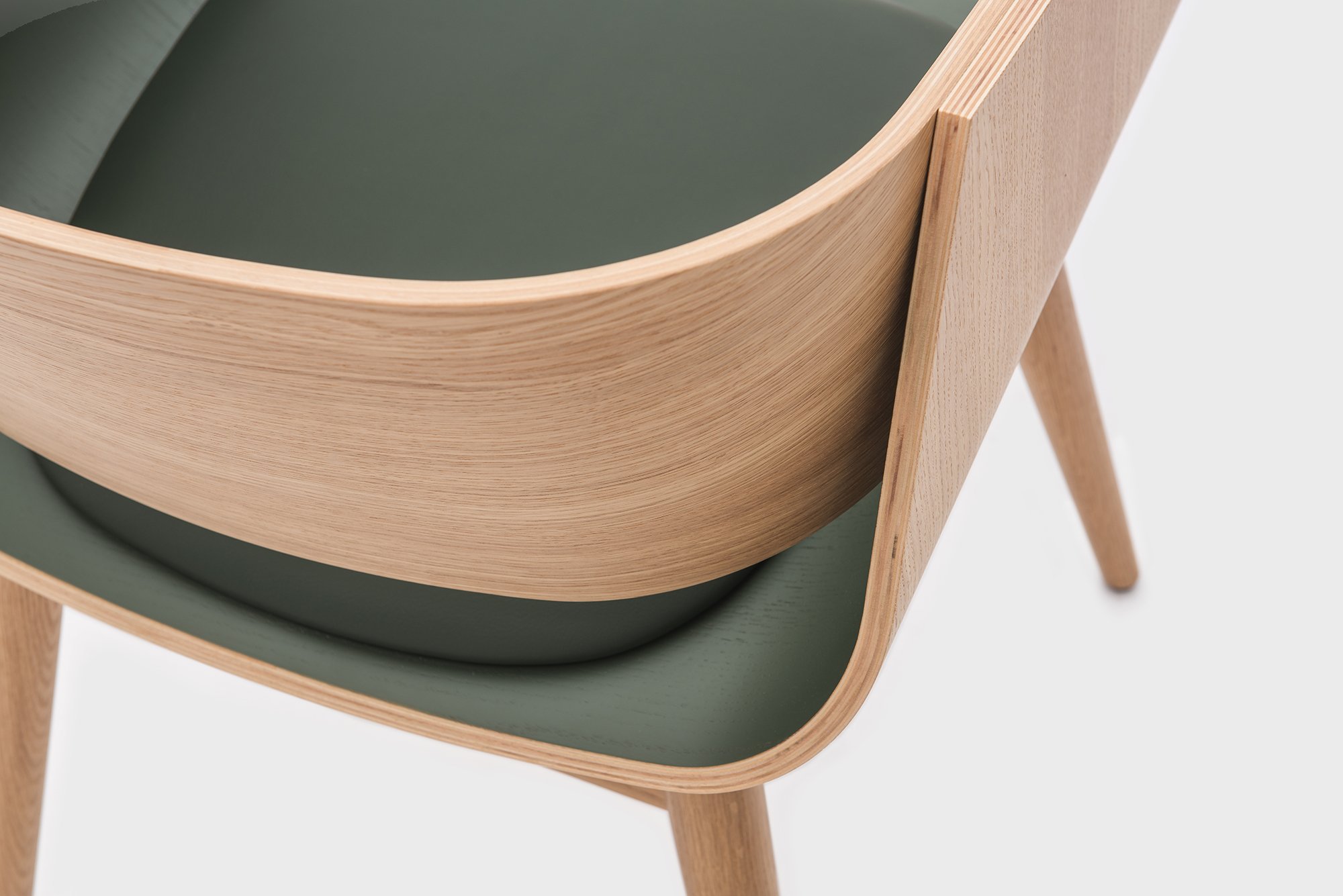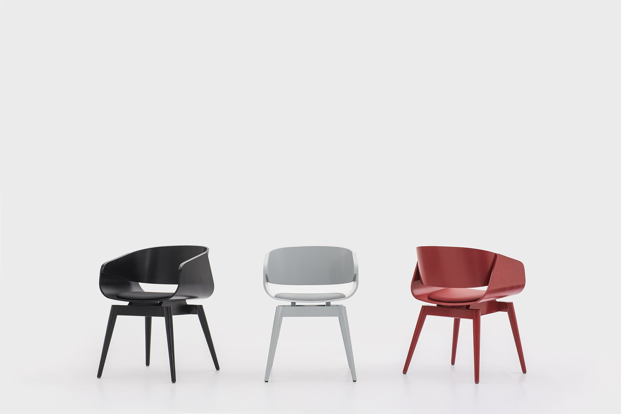 The backrest and seat rest upon the solid wood frame. Tapered, angled legs create a contrast between the bold straight lines and the elegant curves of the upper section. Hidden from view, the screws keep the stylish look of the design intact. A new synthetic leather cushion enhances the feeling of comfort of the ergonomic seat. At the same time, it provides the opportunity to brighten up the armchair. Made with form pressed plywood and solid wood legs, the 4th Armchair boasts a clear lacquer and acrylic paint finishes.