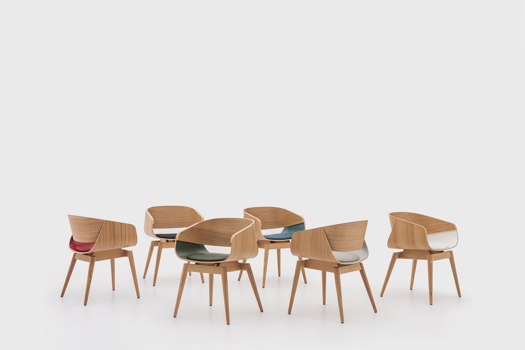 Both full-body coloring and dual-tone options are available. Neutral versions include Pitch Black, Porcelain White, and Fossil Gray. The more vibrant options feature Garnet Red, Ocean Blue, and Deep Green colors. Regardless of colorway, the designer armchair blends into a wide range of spaces seamlessly, from living rooms to home offices. Photographs© Almost Furniture.