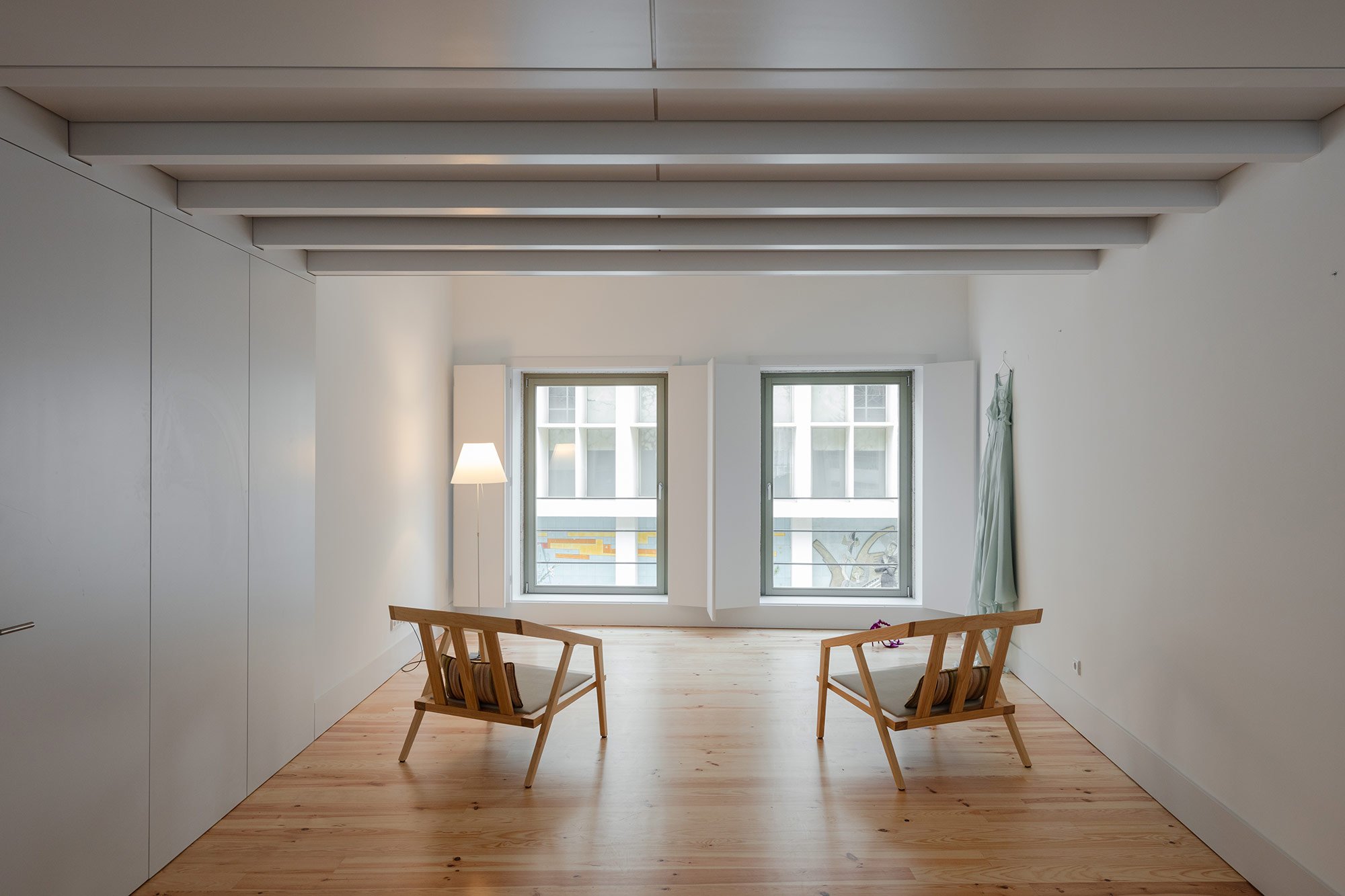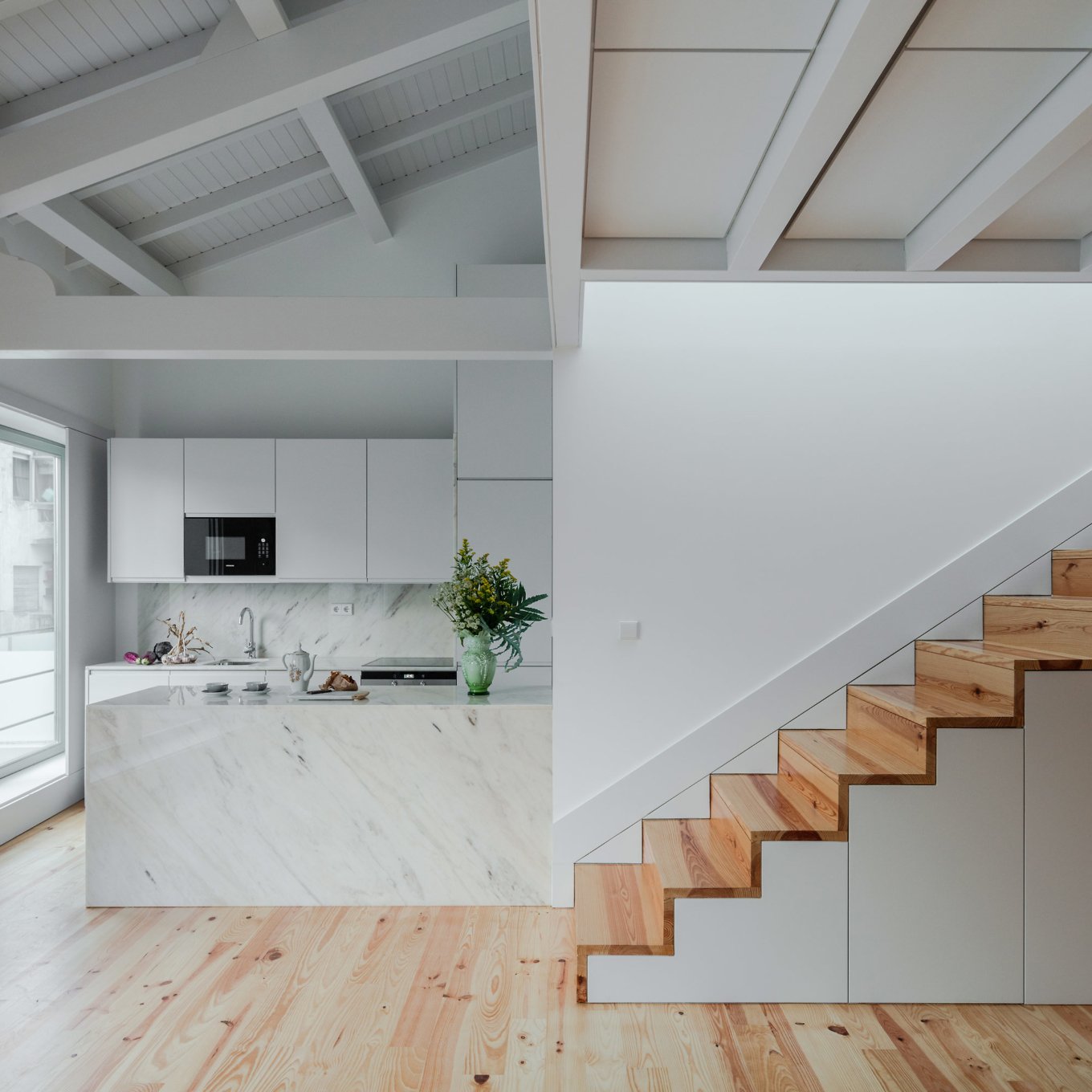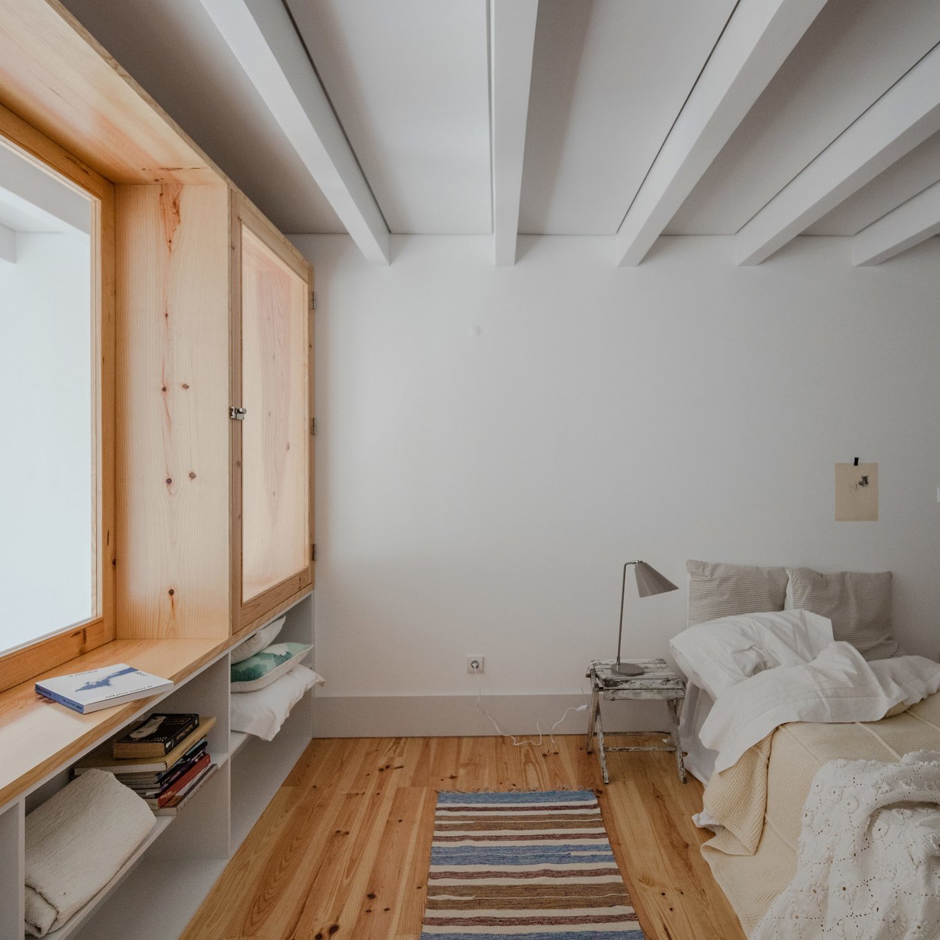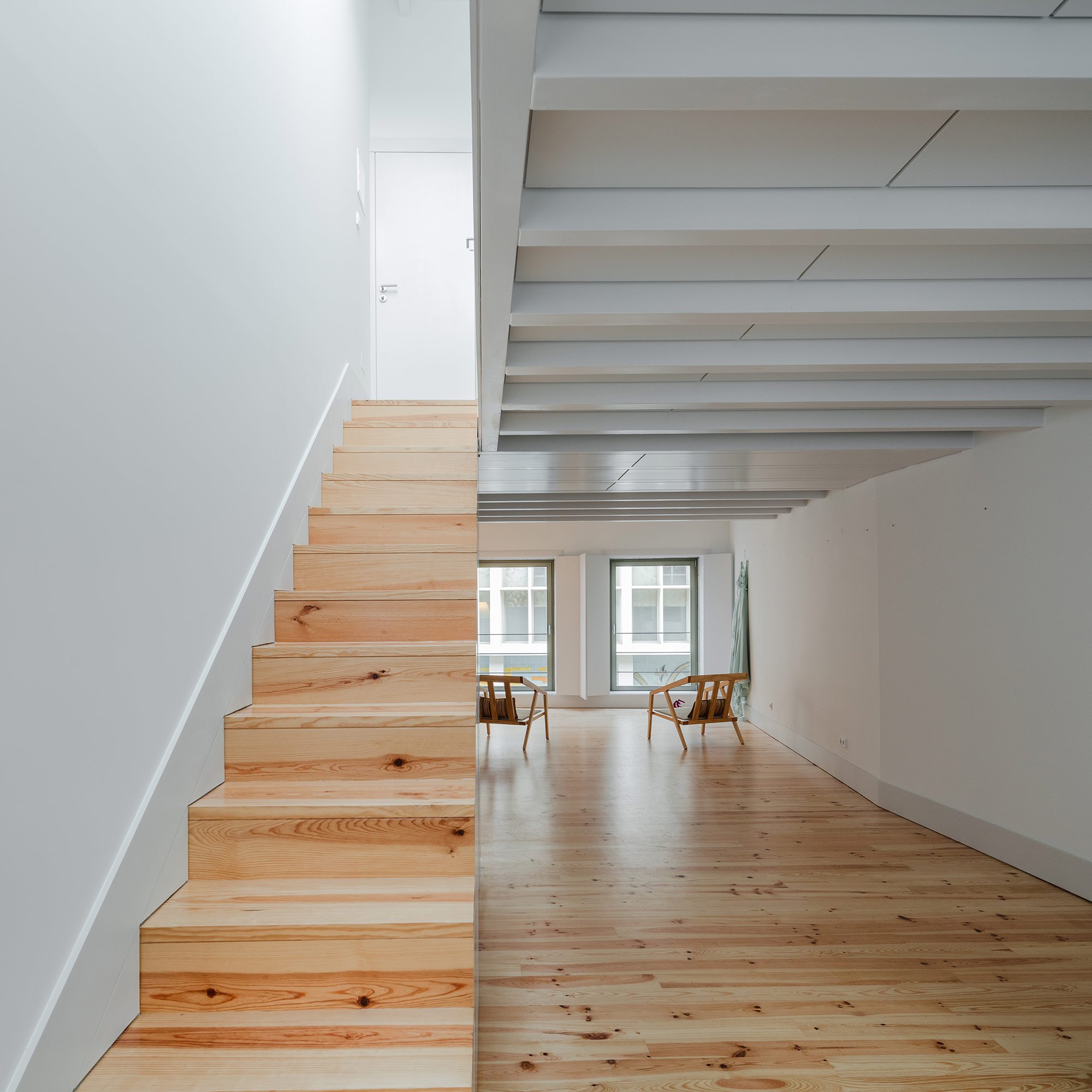 From the street, the Alves da Veiga building seems to have only two floors. Stepping inside, however, visitors discover the ingenious redistribution of space. The studio created four levels, including mezzanine areas, while also maintaining the original footprint of the building. The structure now houses six comfortable and cozy duplexes. A staircase connects the separate apartments and features a large skylight that fills the interior with natural light. Throughout the building, the materials reference the location of the rooms. The ground level features concrete floors, the middle sections boasts bright white walls and ceilings, while the upper levels have warm wooden flooring. Photography by João Morgado.