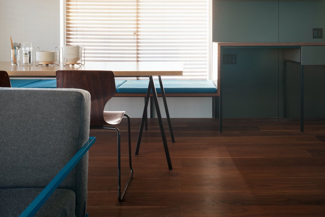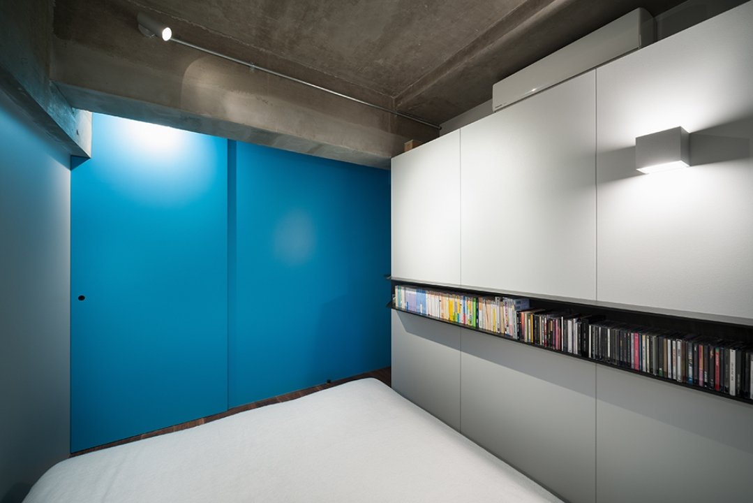 Renovated by Keiji Ashizawa Design, the Ao Studio was remade for a pattern-maker and a restaurateur working from home in Saitama, Japan. The architects removed all of the internal walls and installed built-in furniture, creating a spacious open plan for designing, cooking, and entertaining. Their addition of large windows allows the couple to work by natural light, the spacious balcony makes room for outdoor parties, and the washed concrete walls give the apartment an industrial look. Altogether, the new interior soothes the eye and keeps the owners feeling creative with a neutral palette and youthful pops of blue.