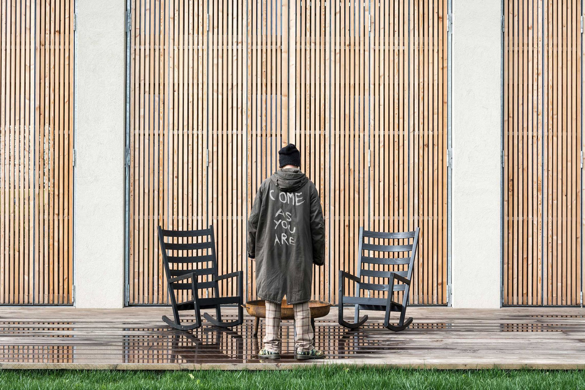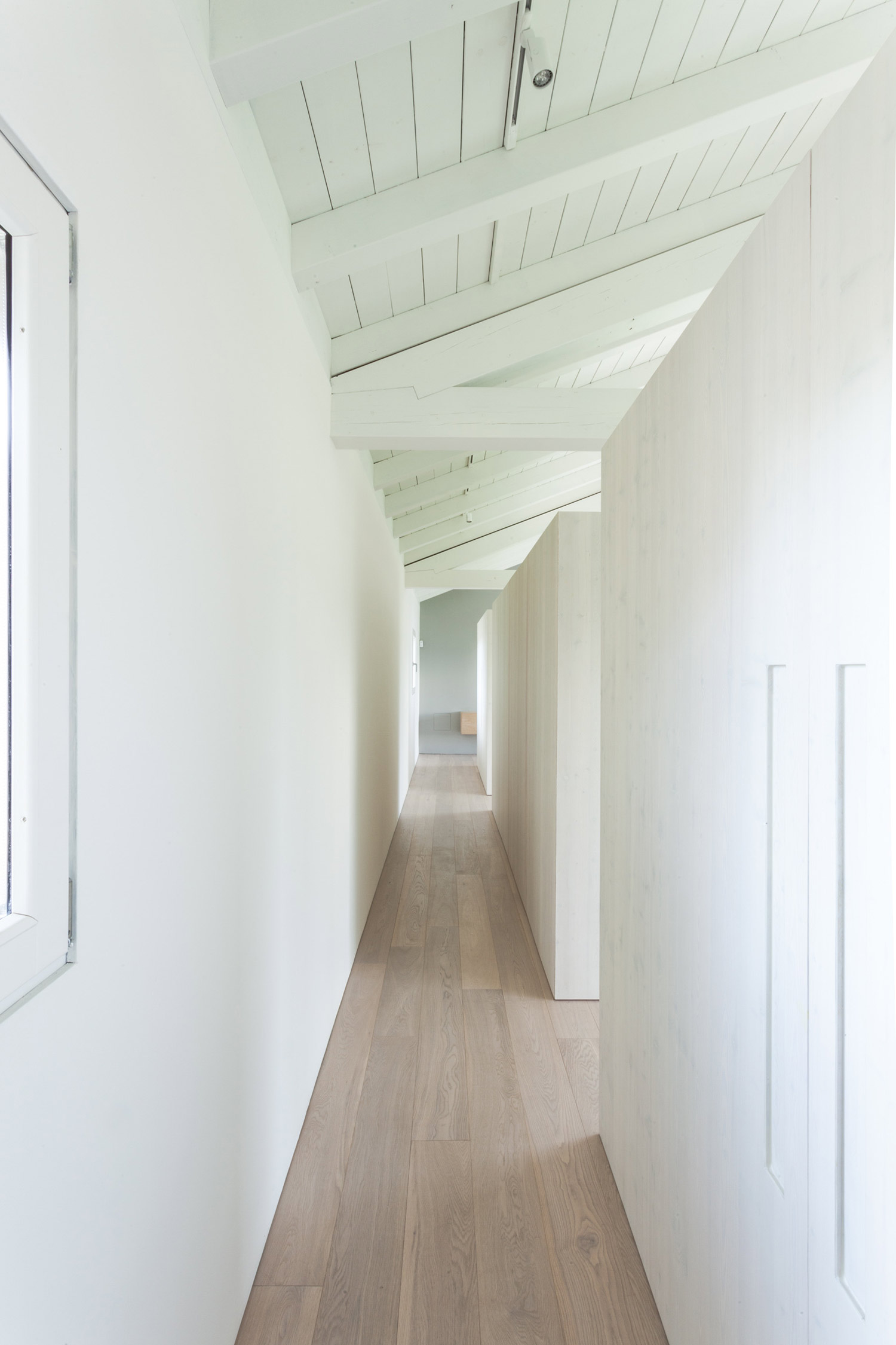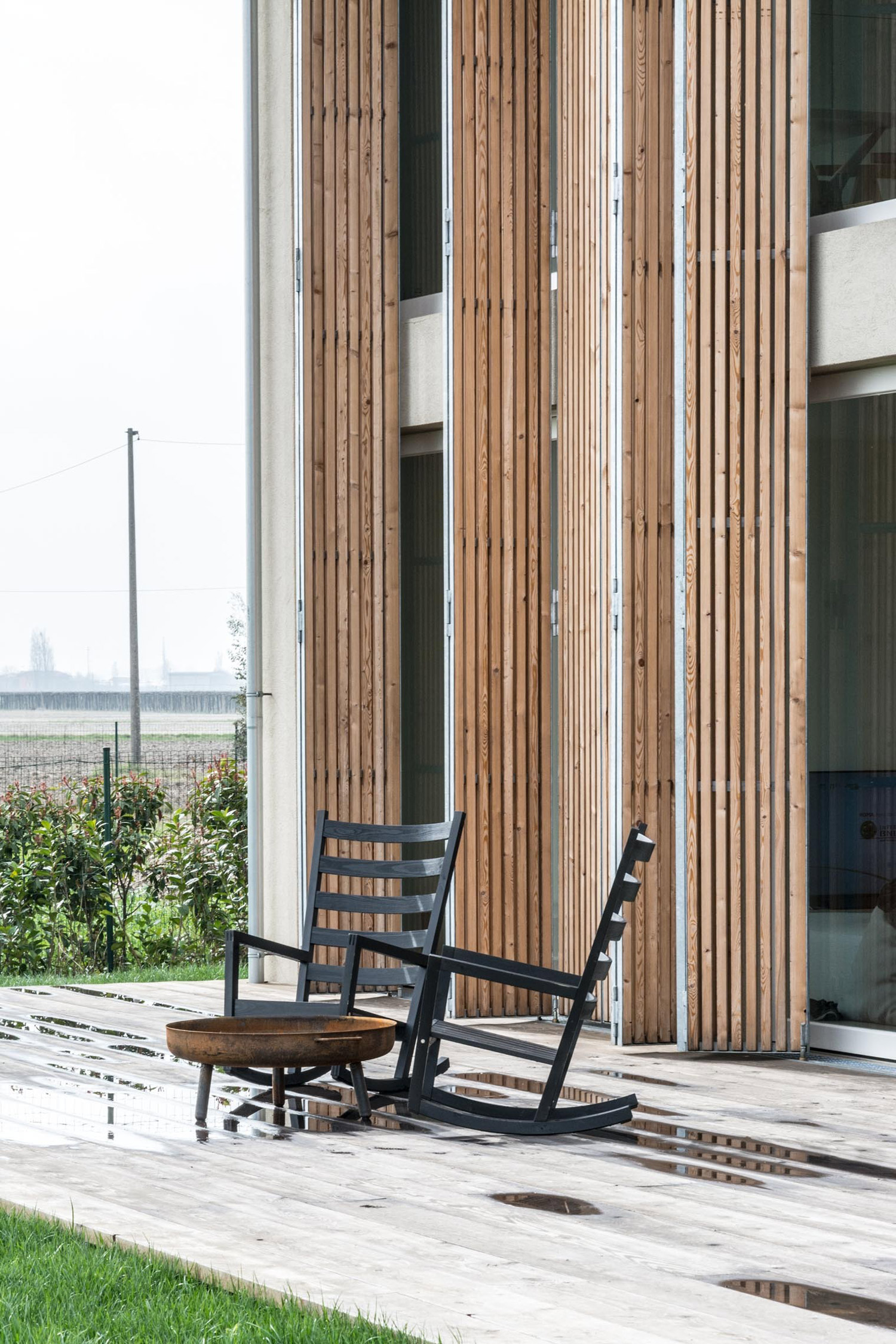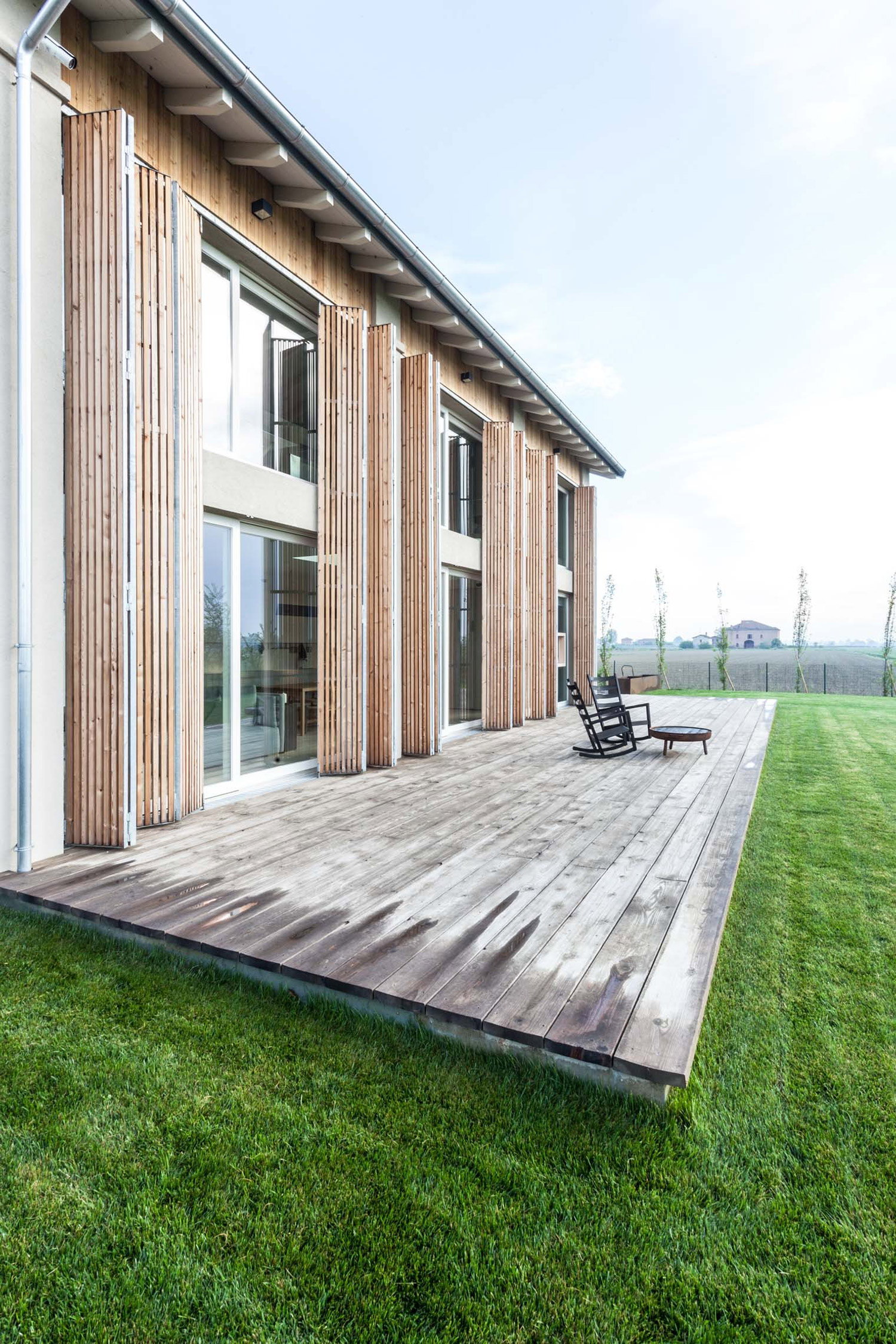In the beautiful countryside of Bomporto, Italy, an unfortunate event turned into a great opportunity. After an old barn was damaged by an earthquake, the owners decided to transform it into a stylish home and they hired the Archiplan Studio to handle the project. The exterior of the structure features an innovative feature that allows the occupants to either open up the interior to the landscape or to close it for privacy. The external folding panels are made of thin wood strips which are reminiscent of traditional shutters, but their vertical design is distinctly modern. The interior features bright white walls, creating a bright and welcoming space alongside the huge windows that let generous amounts of light inside. The ground floor houses a living room, kitchen, and dining room area, with a shower room boasting a floor-to-ceiling glass wall which can be covered by a frosted sliding panel. But the focal point of the entire house can be found just at the top of the stairs on the first floor. Here, a bath is placed between the bedroom and a small office, dividing the open plan space. Wood is used profusely throughout the home, from the original ceiling beams to the floors, bringing rustic warmth and a contemporary allure thanks to the lighter cream and sand tones with hints of pink. A large decking area provides a perfect outdoor relaxation space and views that stretch over to green fields and distant trees. Photography by Davide Galli.