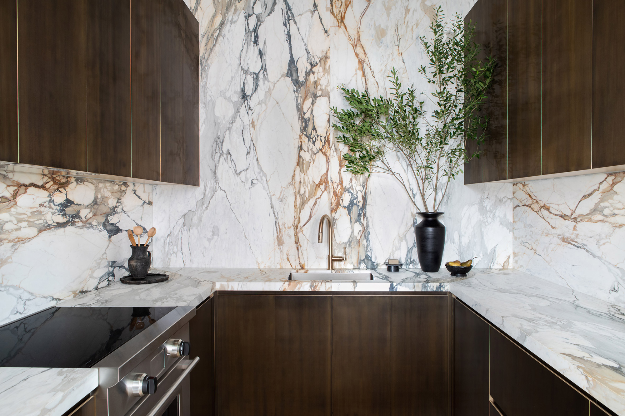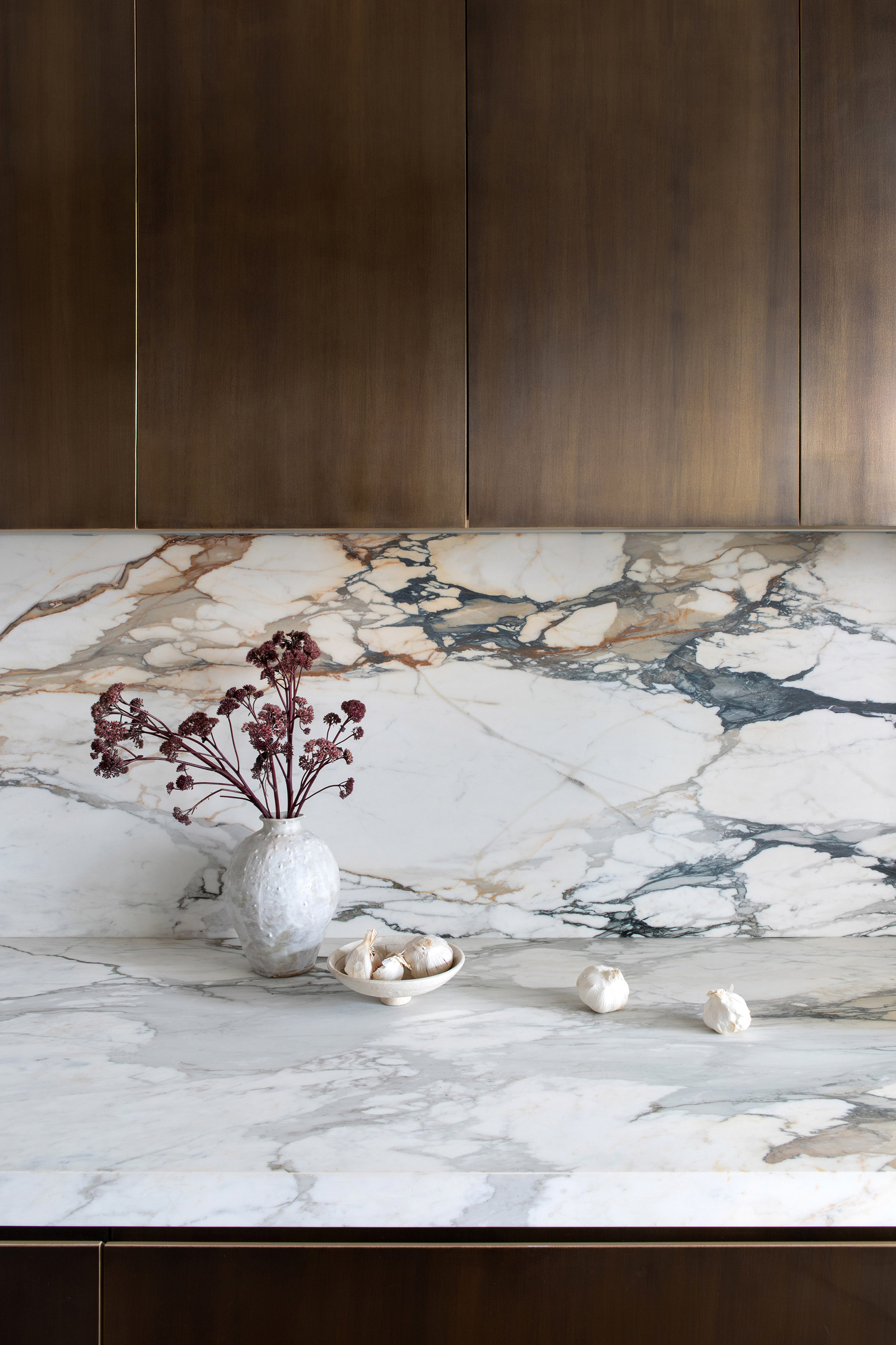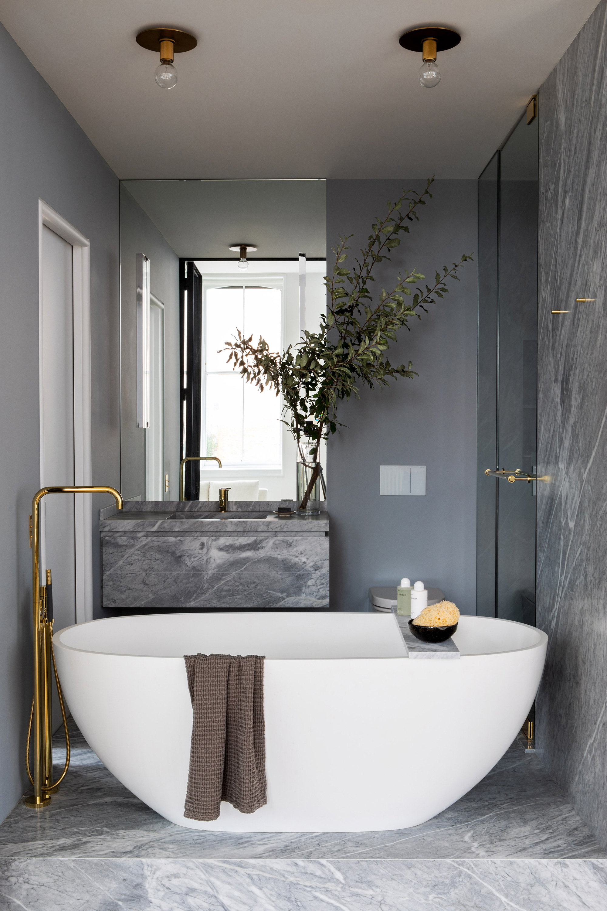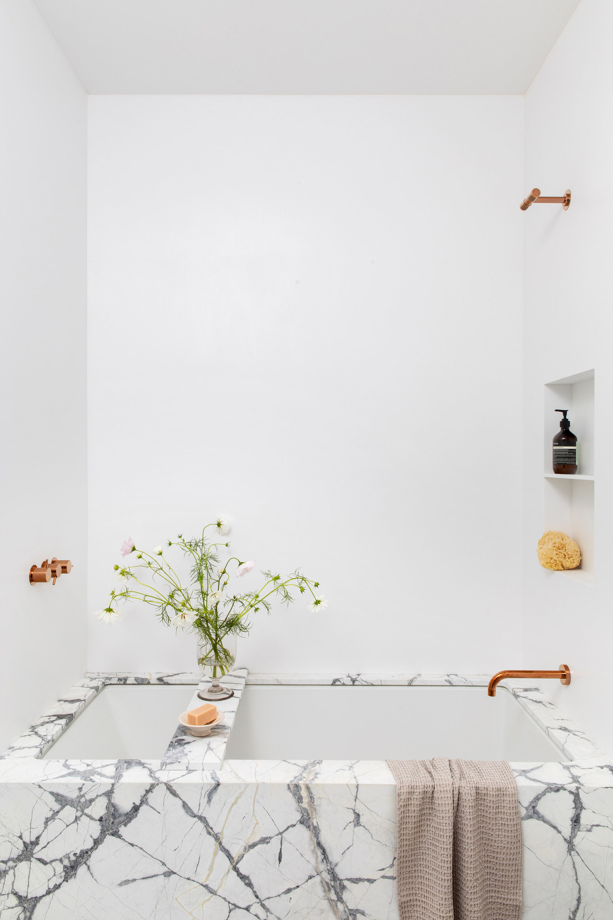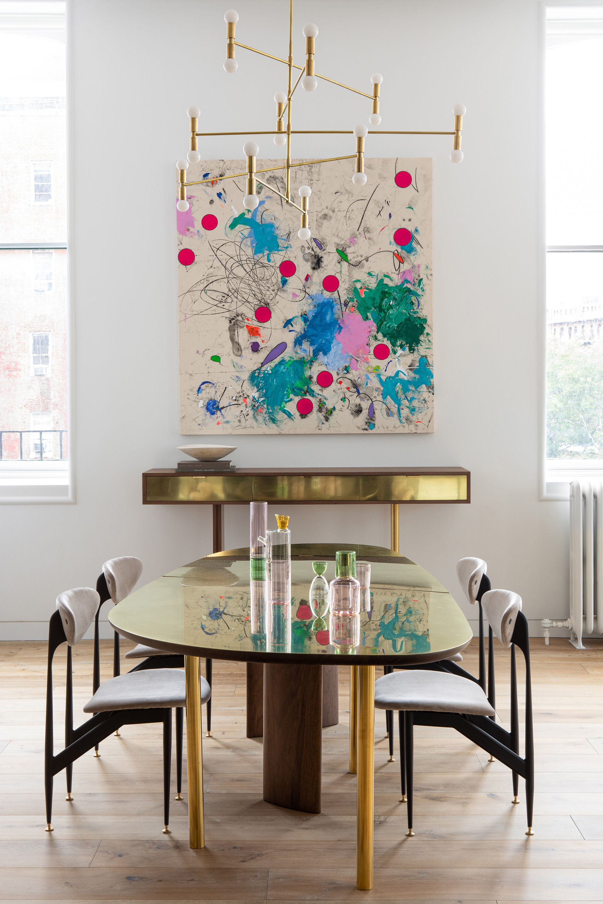 The apartment boasts refined furniture and lighting that create focal points but don’t disrupt the ethereal atmosphere of the interior. Andrea Leung designed several pieces of furniture for the dining room and living room, including a custom brass and walnut console and credenza along with a matching dining table. In the bedroom, a triple-bifold door opens to a bathroom with marble surfaces and a freestanding bath. The architect used marble, brass and wood throughout the apartment, resulting in an especially refined living space. Photography © Sarah Elliott and Scott Frances.