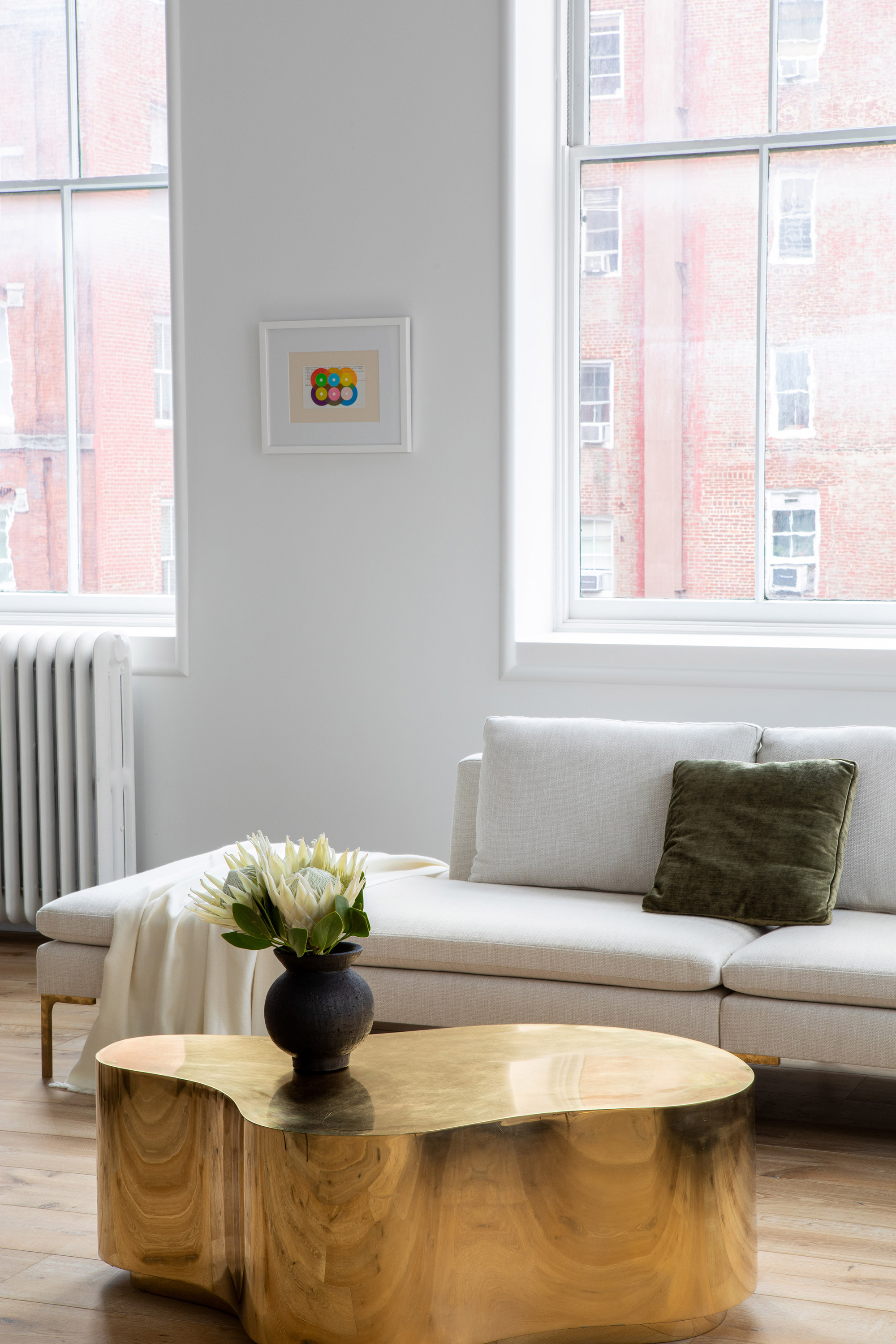 The architect completely transformed the apartment, located in an 1860s historical building. The spaces still featured a series of original elements, including high ceilings and cast-iron Corinthian columns. To create a more airy home, the architect removed a mezzanine level that cramped one side of the apartment. She also overhauled the old floor plan. Now, a series of private rooms run alongside the east wall. A mirrored wall conceals doors to the bedroom and bathrooms, but it transforms into transparent glass in some areas. These private spaces open to the sun-drenched living room which features tall windows on two sides.