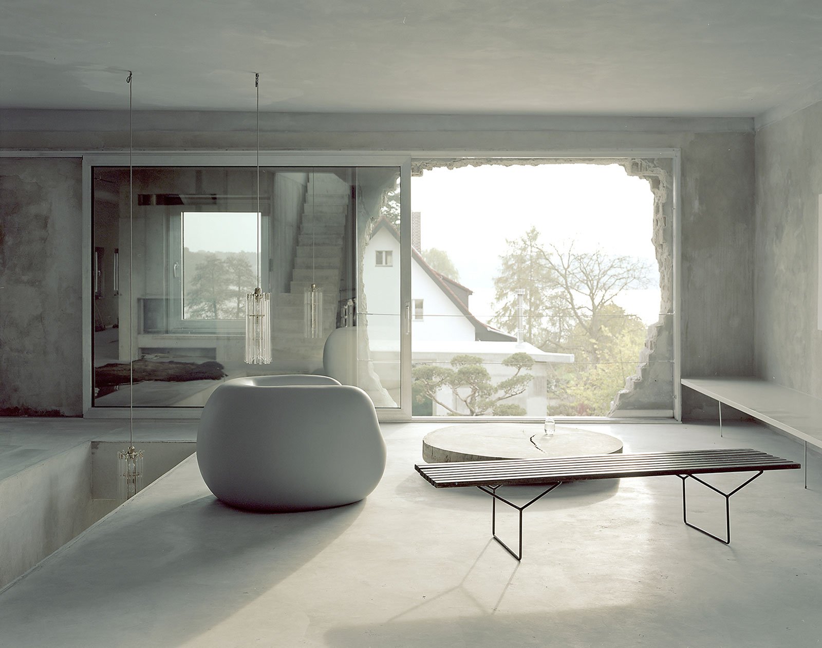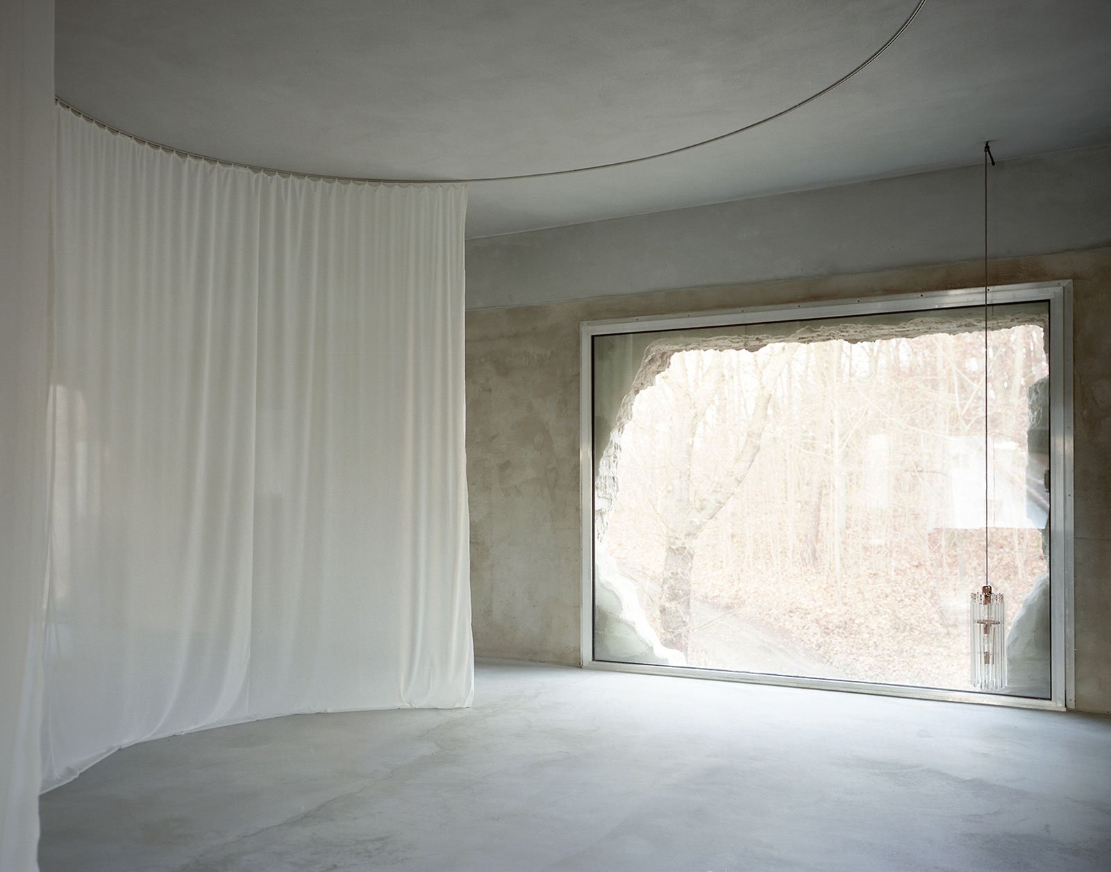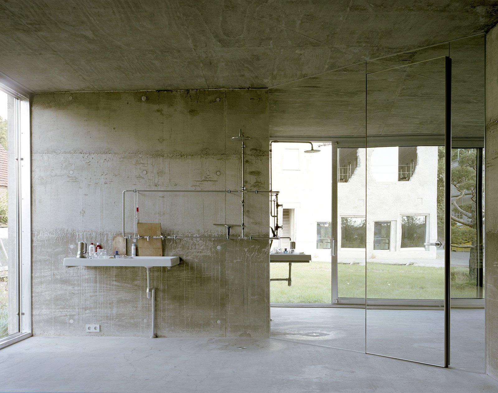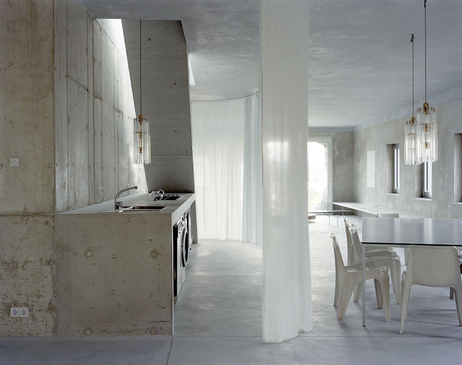 „Ernst Lück,“ a former lingerie factory southwest of Berlin in Potsdam, Germany is the unlikely site for this combined living and studio space created by architects Brandlhuber+Emde, Schneider. “Antivilla” is an entirely new approach to reuse and adaptive living that’s as efficient as it is beautiful. Although little has been done to alter the appearance of the original structure, the result could not be more different from its origin; if lingerie is considered delicate, extravagant, and meticulously-detailed, then “Antivilla” is a concrete chastity belt.