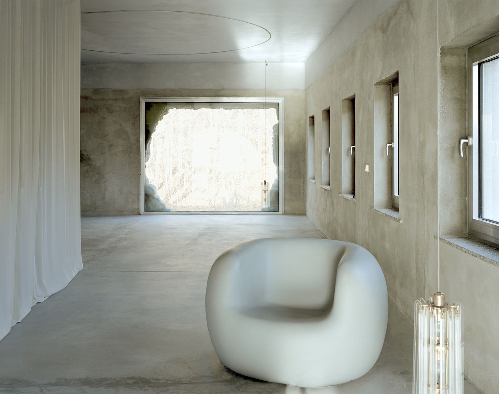 Every non-bearing wall has been removed to make space for an interior “core,” 20 square meters wide, which spans both floors with a staircase, bathroom, kitchenette, bedroom with fireplace, and even a sauna. Climate control is handled with breathtaking simplicity; the original exterior of the building is covered with inexpensive shortcrete rather than insulation, while transparent PVC curtains divide the interior curtains for a hands-on method to regulate the actual temperature at any given time. Roughly-hewn by a group of friends with hammers, the gaping windows on the South façade measure up to five meters high to complete the home’s brutalist aesthetic and provide a scenic view of the nearby lake. Despite building’s crude and unrefined character, subtle modern elements like glass window panels and a mirrored bathroom are enough to suggest the genuinely minimalist style at the heart of this project. Photograpy Erica Overmeer