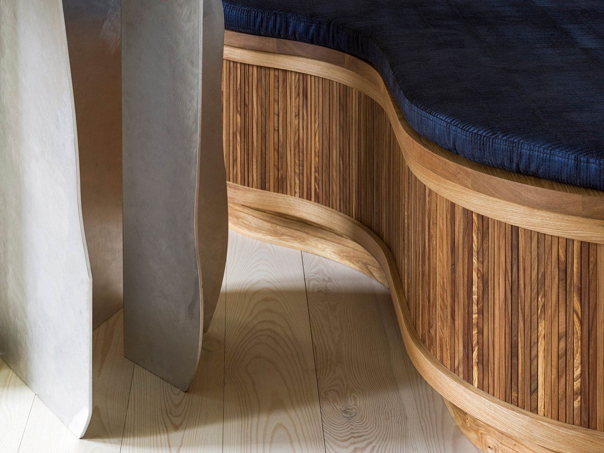 To complete the cabinets, cupboards, and shelving, the architects collaborated with traditional cabinet makers from Rammelisten. Additionally, the team used the highest quality metalwork. Designed with rounded forms and elegant curves, the cupboards, kitchen island, and bench give a nod to the natural beauty of the solid wood material. At the same time, they reference the client’s fondness for beautiful workmanship. The sinuous lines also provide an organic counterpoint to the client’s collection of art objects and furniture. Cupboards, shelving and a new pantry door all showcase the elm wood’s growth rings and striking patterns. As for the new color scheme, the studio referenced Swan Pond (216) by Swedish artist Mamma Anderssons in the wall colors. The color palette includes dusty, light hues of blue, green, and yellow, as well as dark brown and red colors. Photography © Hampus Berndtson.