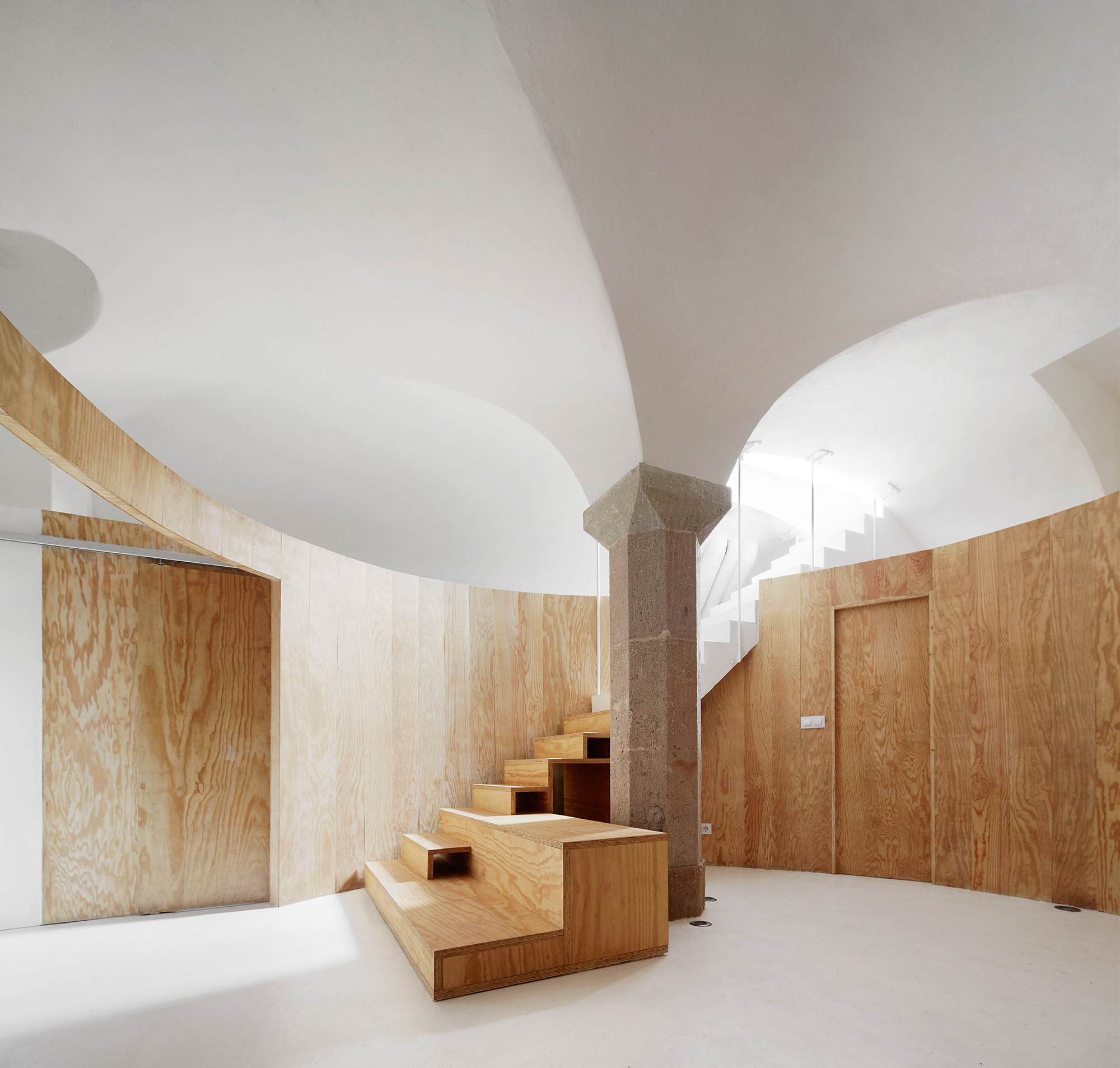 The studio finished the floor and walls in white, to add contrast to the laminated pine and to brighten the space. Furthermore, the pristine walls act as a blank canvas for the client’s furnishings, decorative objects and other belongings. To control the level of humidity, the architects treated and then sealed all surfaces and ceilings. They also installed underfloor heating and a ventilation system paired with a dehumidifier. Natural light flows through the staircase and a rounded opening, bouncing off the walls and illuminating the entire apartment. Photographs © José Hevia.