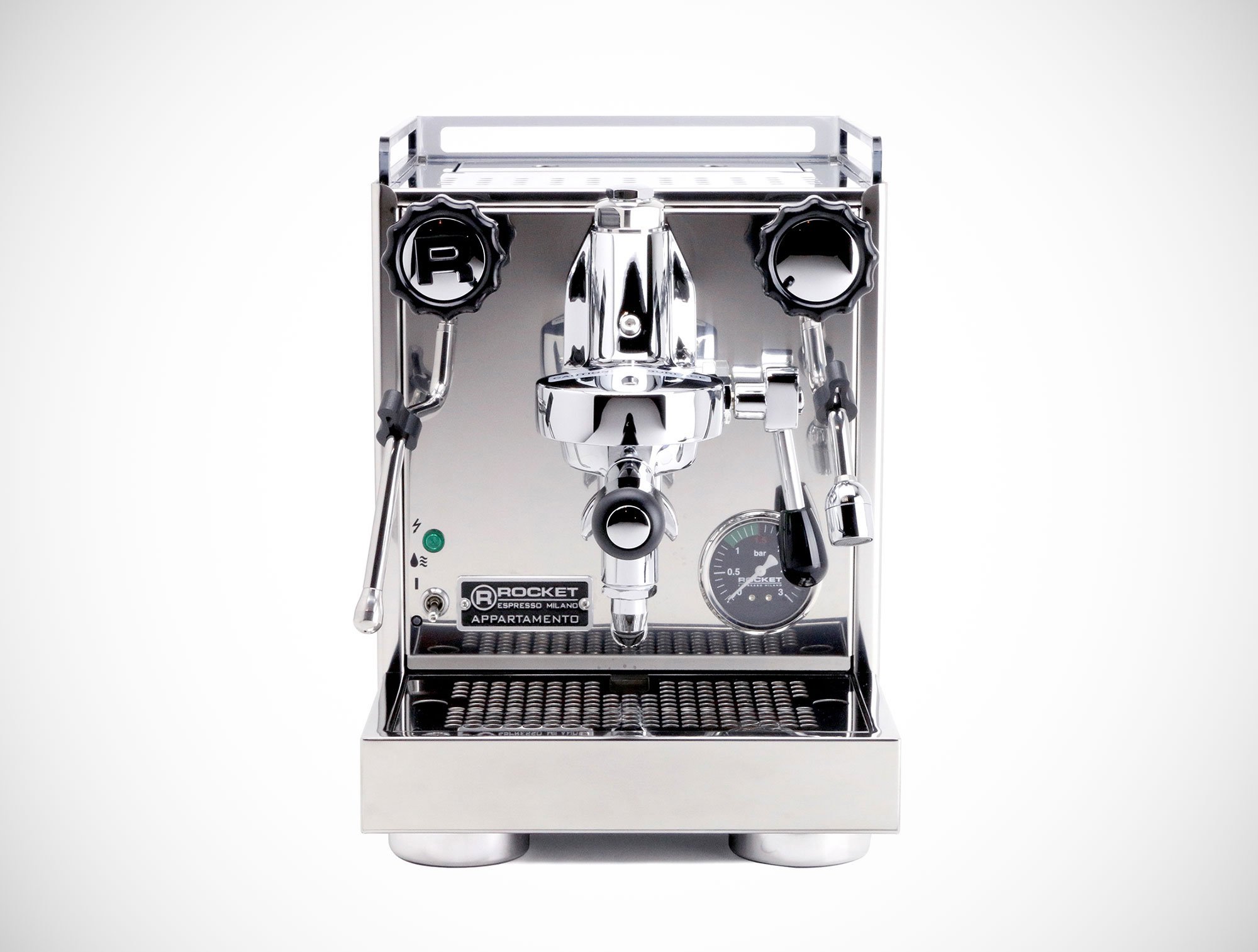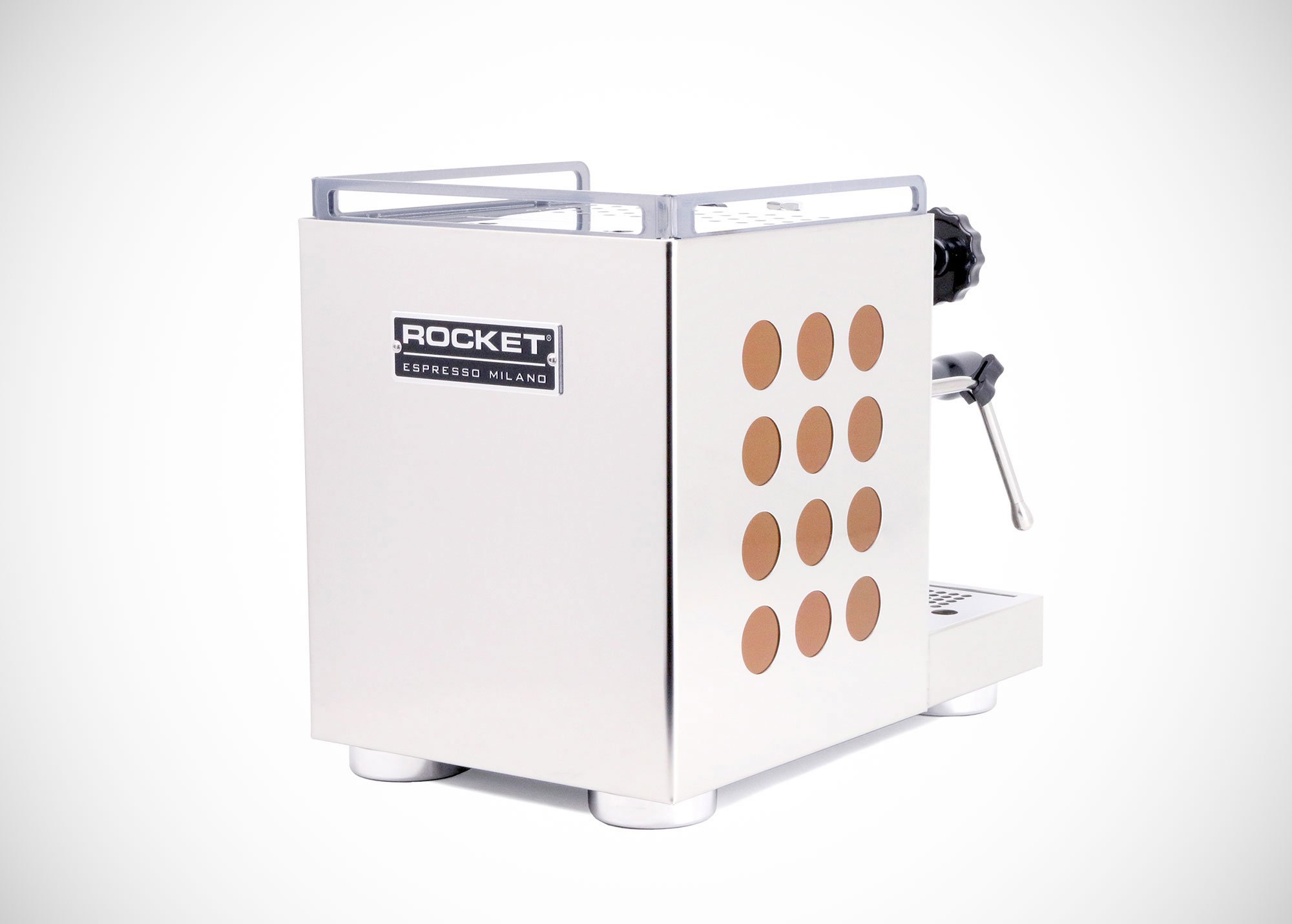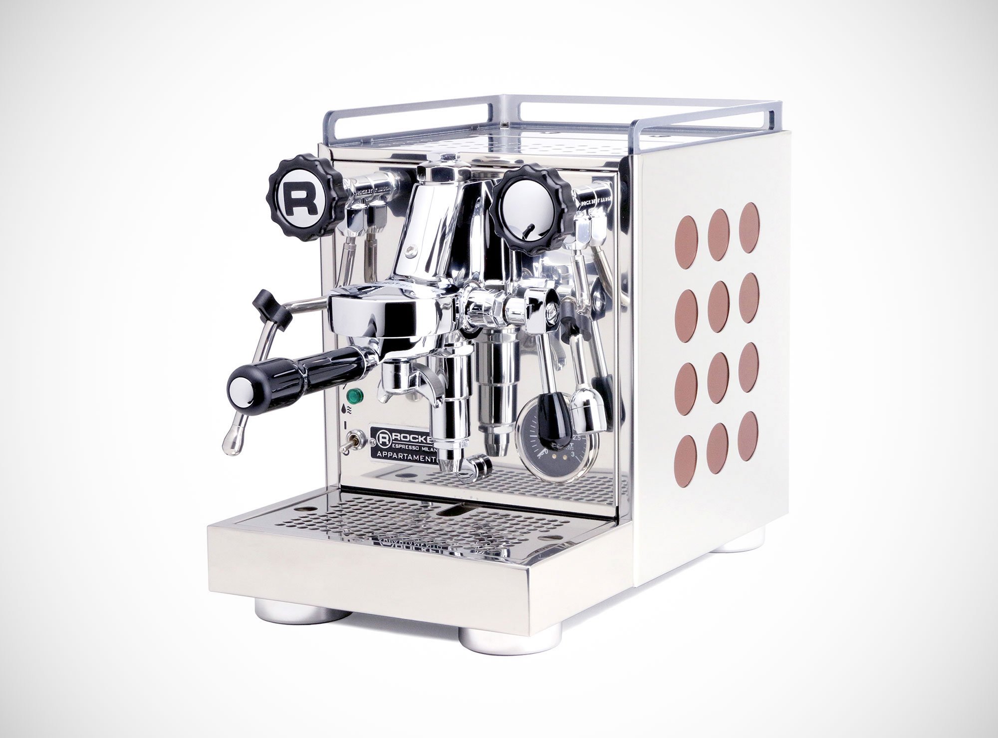 Handmade in Italy, like all of the brand’s products, this ingenious machine blends craftsmanship and style with function. Important features include an E16 commercial brew group with an automatic pre-infusion, a copper boiler and heat exchanger, as well as no-burn stainless steel hot water and steam wands. The manual controls are easy to use and also add a vintage touch to the design. Although compact, the espresso machine comes with oversized round feet that provide optimum stability. The brand’s signature “R” logo completes the modern design. Ideal for both experts and beginner brewers alike, Appartamento brings the unmistakable taste of a good espresso and the art of coffee-making into kitchens. Photographs© Rocket Espresso Milano.