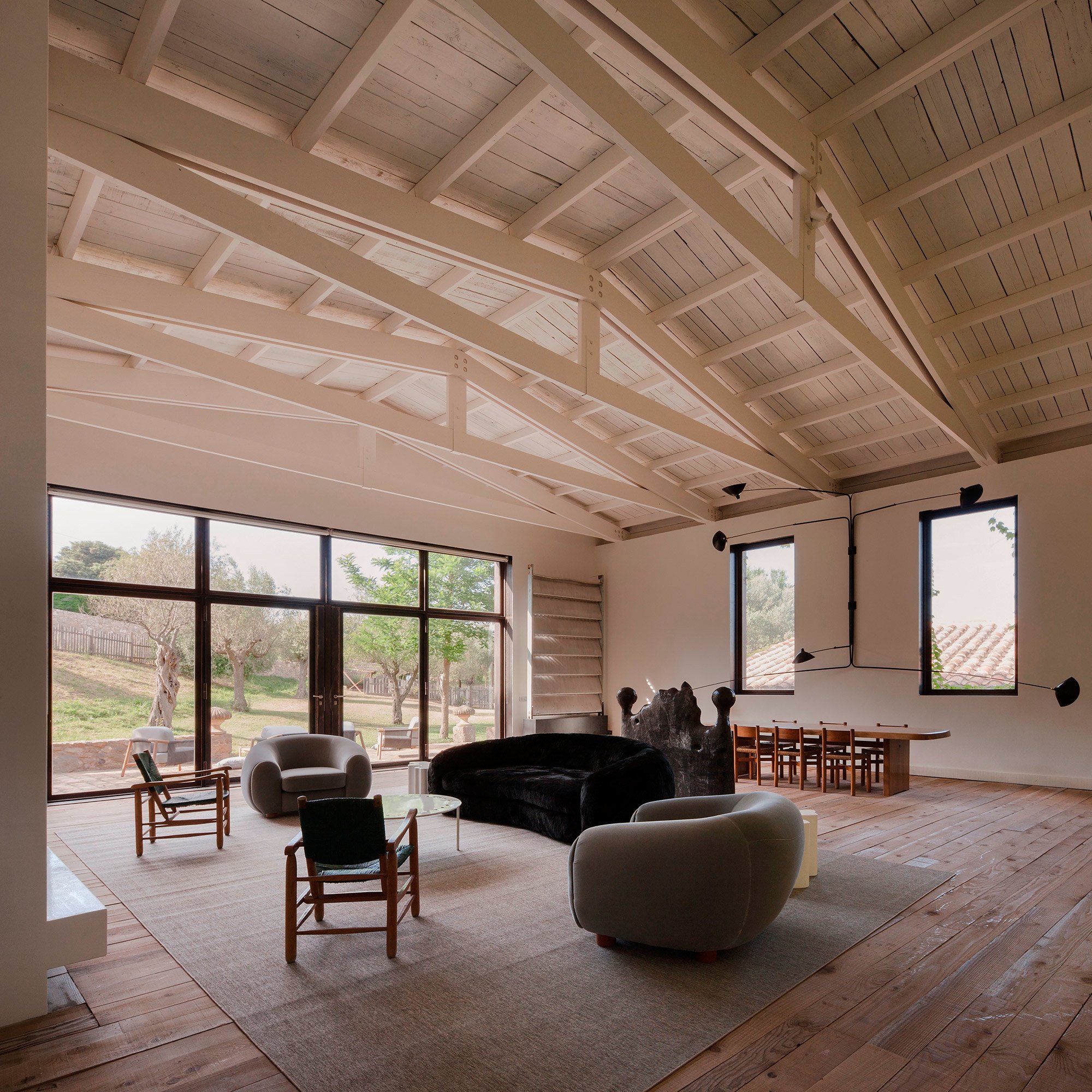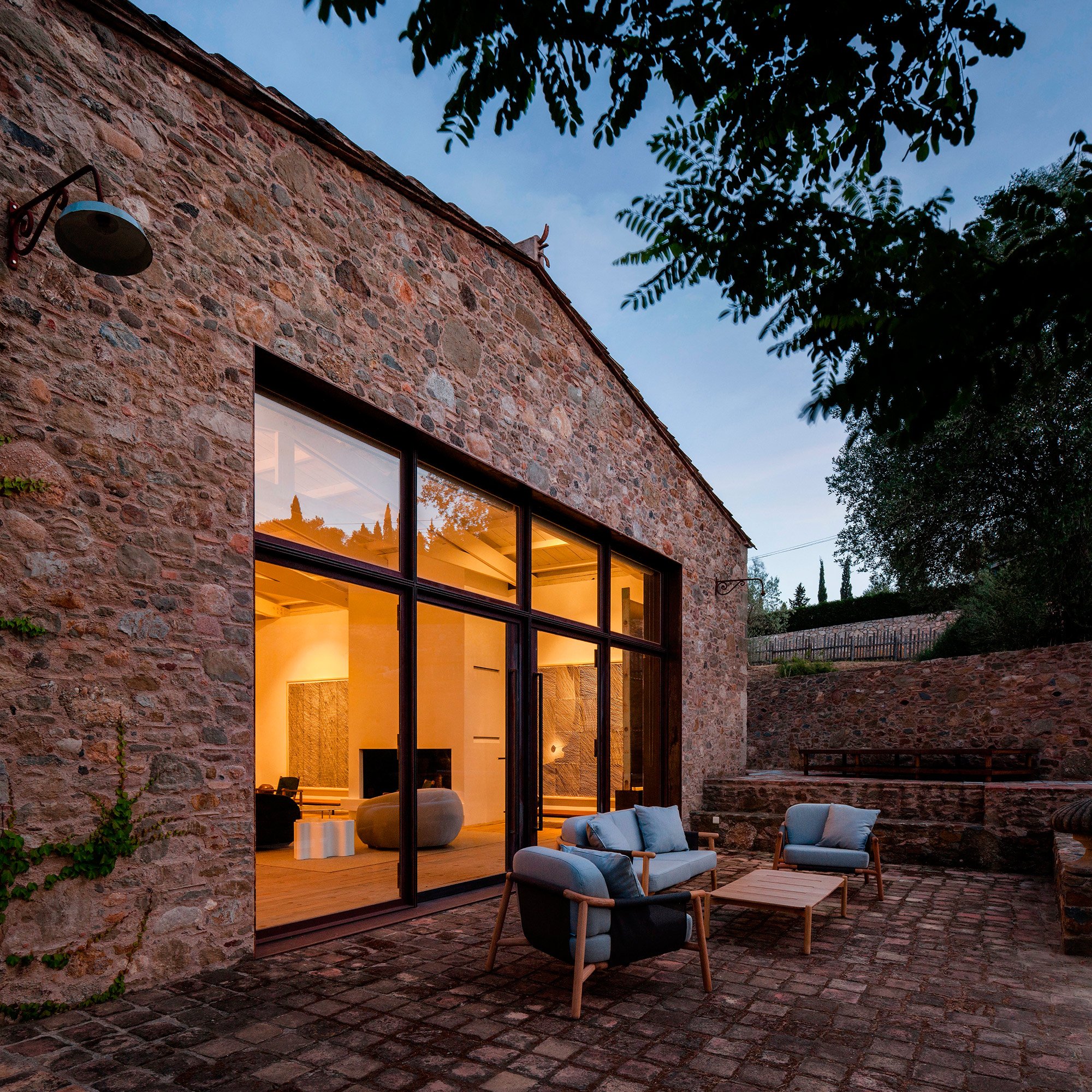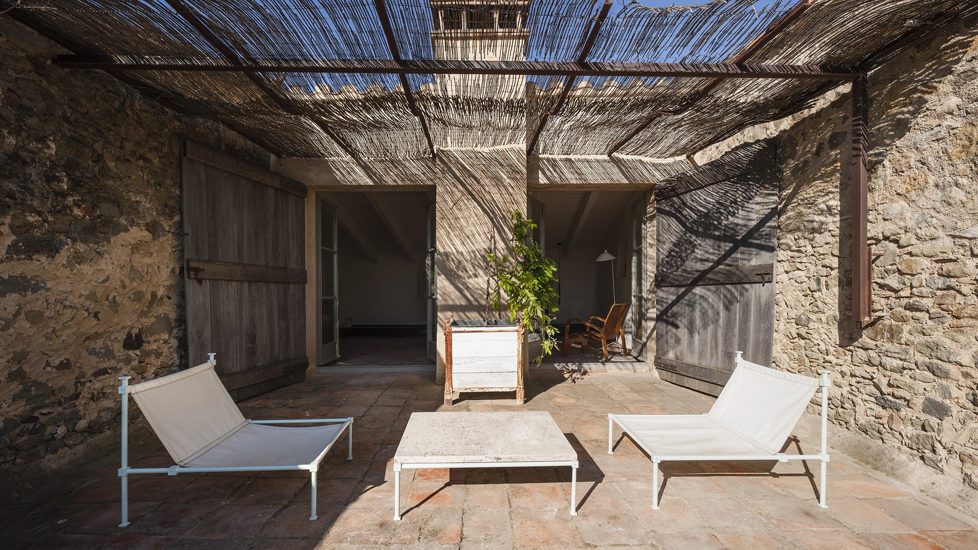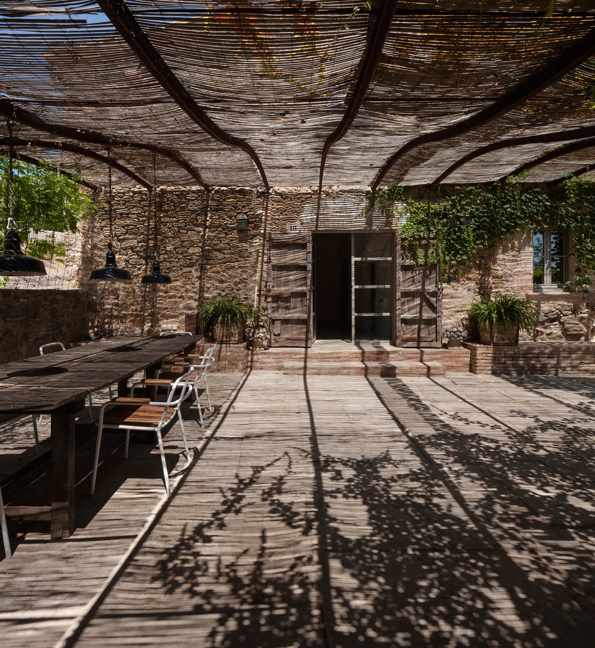 The owners of this 1910 farmhouse wanted to create the ideal living space where their extensive furniture collection from the 50s and 60s as well as contemporary artwork could coexist with the rustic features of the original structure. They hired the Francesc Rifé Studio to renovate and transform the house into the home of their dreams. Several removed walls and a few extended windows later, the main room became the ideal living room-cum-gallery space. The high, white ceiling with wooden beams and the immaculate walls help to create the illusion of an even larger space while also putting the artwork and furniture pieces by Jean Prouvé and Charlotte Perriand perfectly on display. In this home, modern and refined design items and organic rustic features are brought together in complete harmony. The best elements of the original farmhouse have been carefully preserved, from the stone steps to the original masonry details and impressive archways. Light colors, including cream and caramel, complement the generous use of bright white, with black accents and hints of vibrant colors adding the perfect finishing touch to the palette. The main structure houses the spacious living room, kitchen, and two guest bedrooms on the first floor. A smaller annex holds the main bedroom and a studio, and it’s accessible via a beautiful garden and terrace, the latter shaded by a wavy canopy. The house pays homage to the vernacular Catalan architecture and places the incredible art and furniture collection of the owners in a clever contrast. The rustic past and the sophisticated present are strikingly different, yet here they complete each other and both shine brighter as a consequence. Images courtesy of Francesc Rifé Studio. Photography by Fernando Alda.