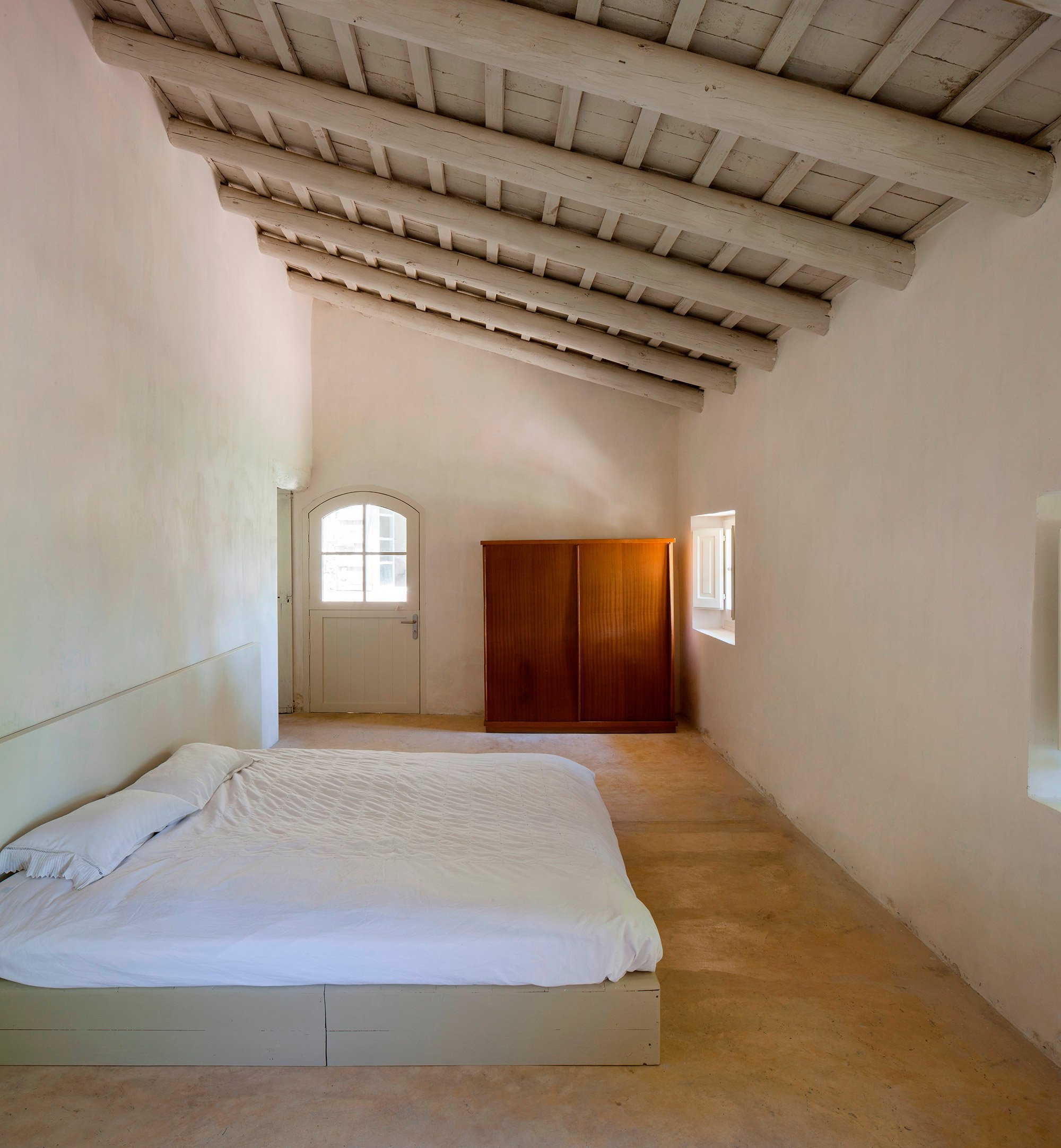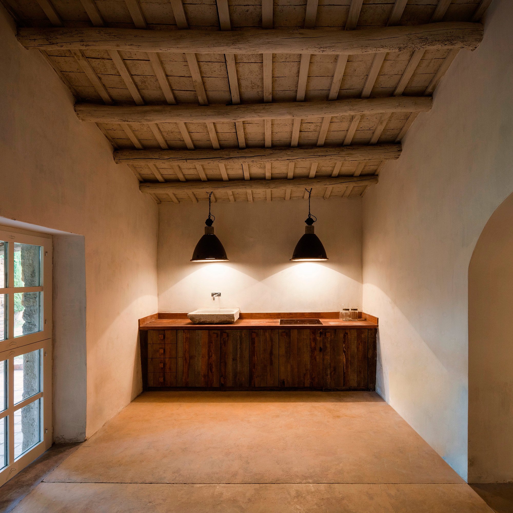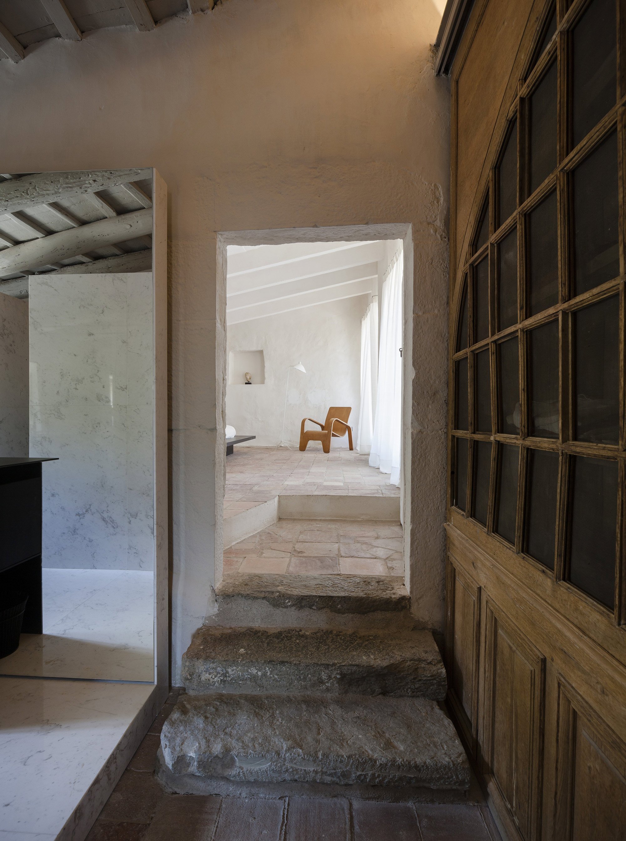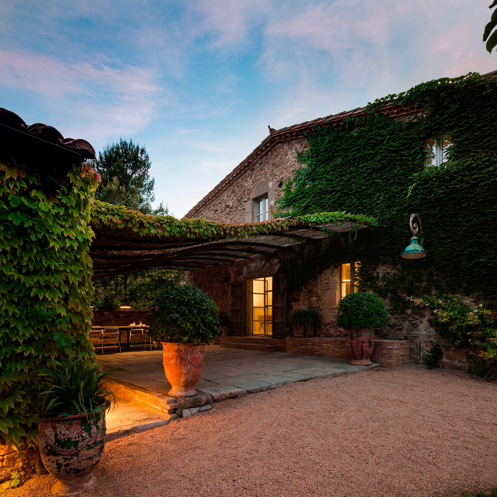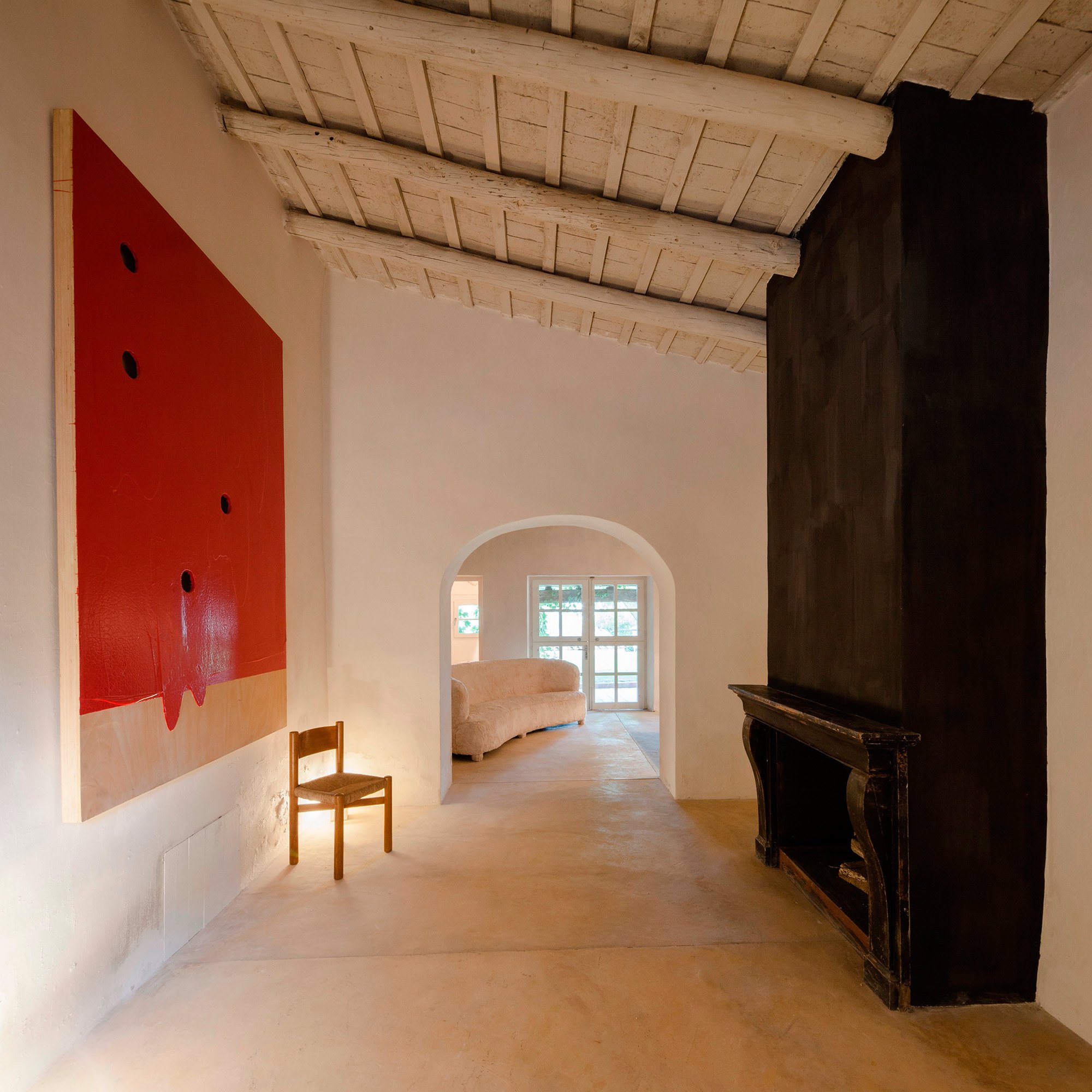 The owners of this 1910 farmhouse wanted to create the ideal living space where their extensive furniture collection from the 50s and 60s as well as contemporary artwork could coexist with the rustic features of the original structure. They hired the Francesc Rifé Studio to renovate and transform the house into the home of their dreams. Several removed walls and a few extended windows later, the main room became the ideal living room-cum-gallery space. The high, white ceiling with wooden beams and the immaculate walls help to create the illusion of an even larger space while also putting the artwork and furniture pieces by Jean Prouvé and Charlotte Perriand perfectly on display. In this home, modern and refined design items and organic rustic features are brought together in complete harmony. The best elements of the original farmhouse have been carefully preserved, from the stone steps to the original masonry details and impressive archways. Light colors, including cream and caramel, complement the generous use of bright white, with black accents and hints of vibrant colors adding the perfect finishing touch to the palette. The main structure houses the spacious living room, kitchen, and two guest bedrooms on the first floor. A smaller annex holds the main bedroom and a studio, and it’s accessible via a beautiful garden and terrace, the latter shaded by a wavy canopy. The house pays homage to the vernacular Catalan architecture and places the incredible art and furniture collection of the owners in a clever contrast. The rustic past and the sophisticated present are strikingly different, yet here they complete each other and both shine brighter as a consequence. Images courtesy of Francesc Rifé Studio. Photography by Fernando Alda.