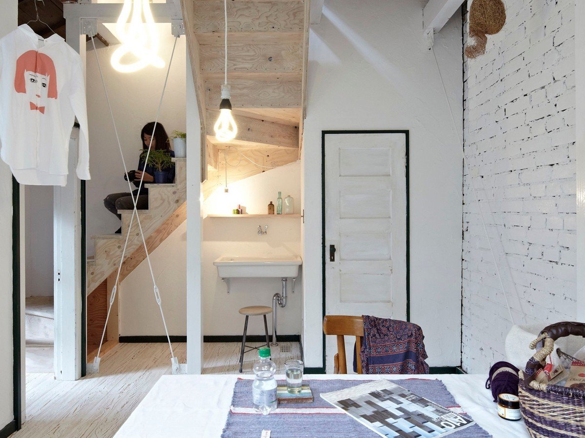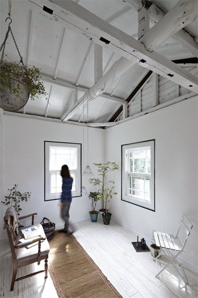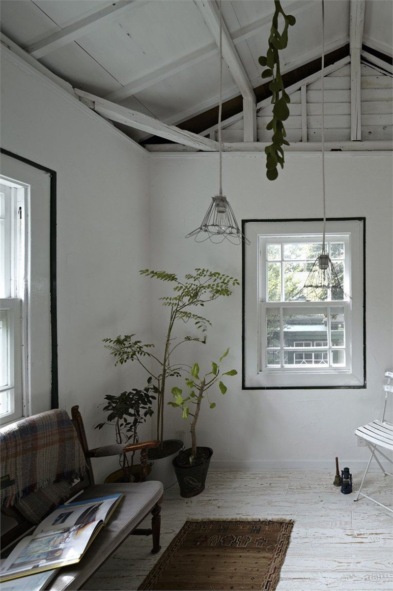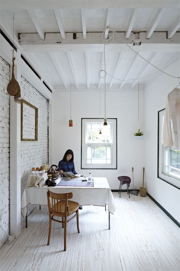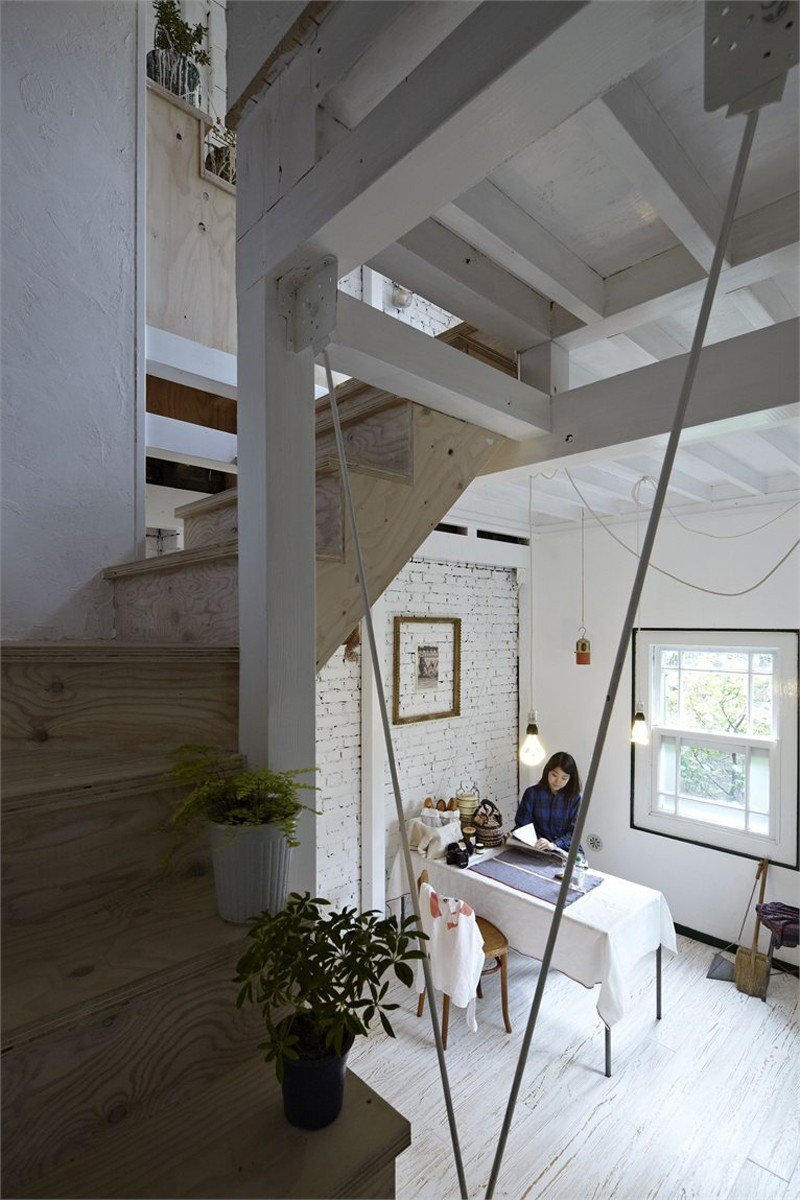 ASE is described by architect Takuya Tsuchida of no.555 as imperfect, but this descriptor is meant to convey character, history, and familiarity. The residence is built constructed around a retaining wall from approximately a hundred years past, and the masonry is now coated in a splotchy white through which the aged bricks still reveal themselves. A set of unfinished wooden stairs leads the ascent upstairs, and this wooden motif is mirrored by the exposed ceiling rafters and floors. A little bit of Western rusticity, including small touches such as hanging pendant lights and small potted plants, for the eastern flavor of Yokohama, Japan creates a homey hybrid in the house.