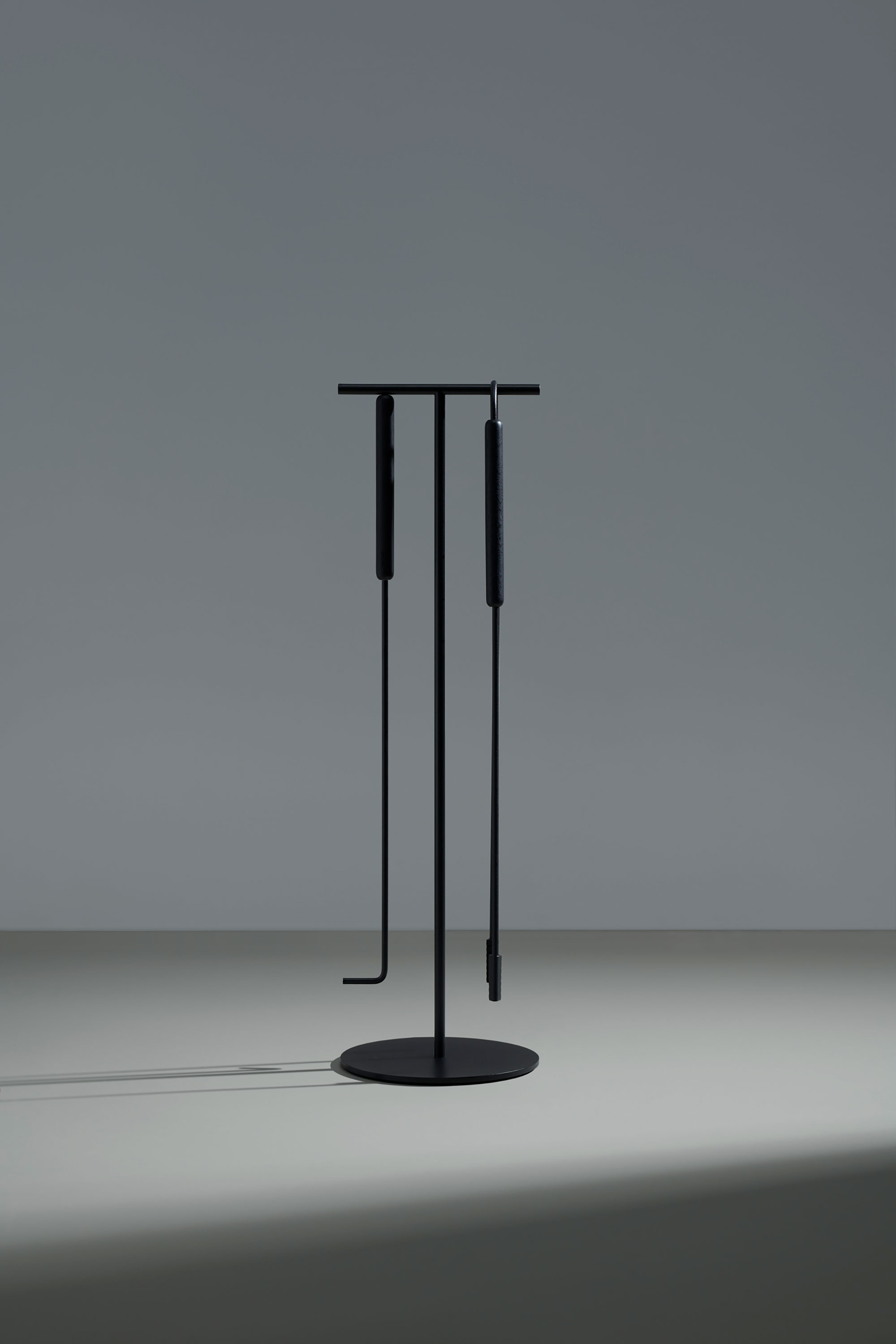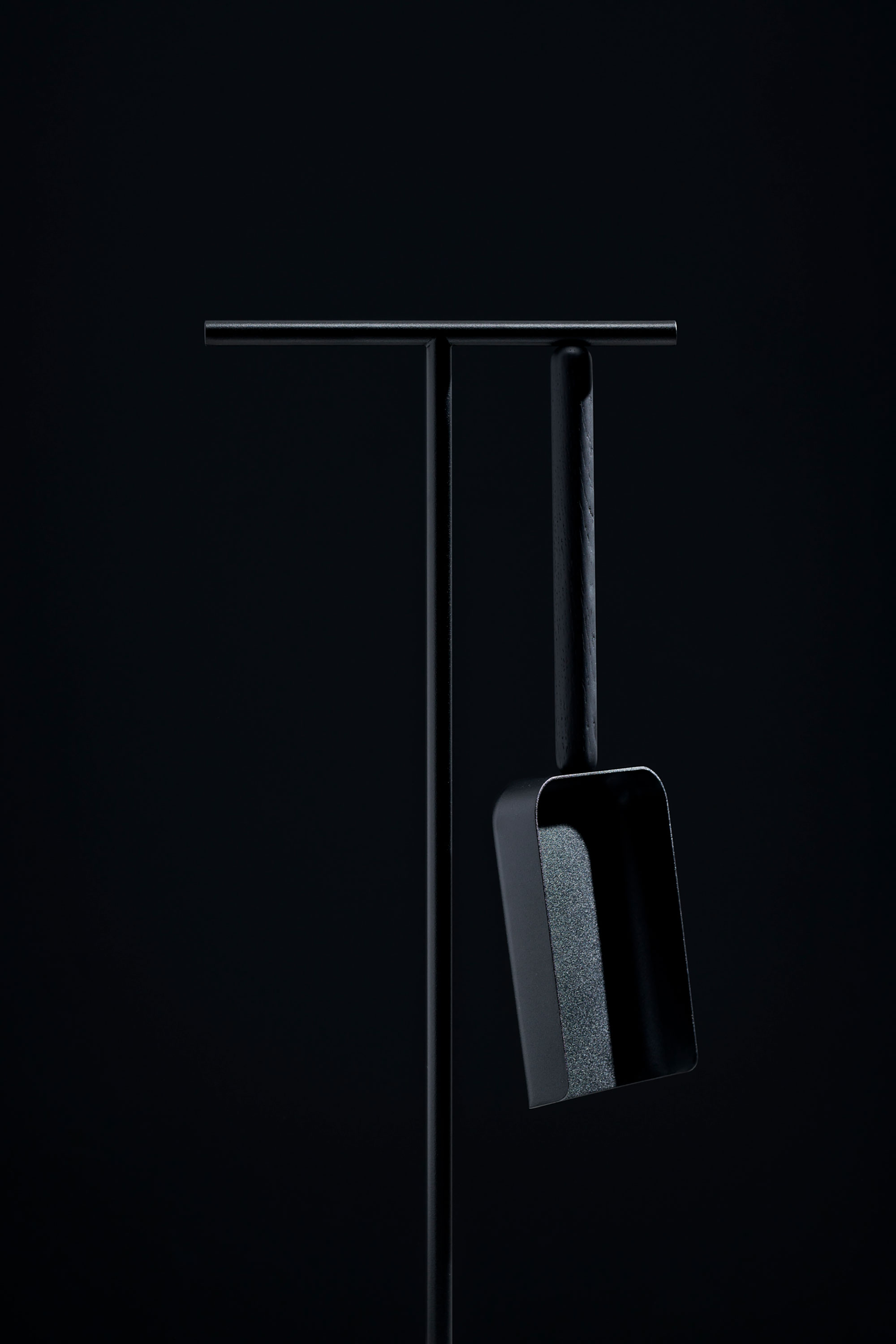 Minimalist and elegant, the tools feature slender shapes that remind of the hollow reed stem. At the top, the rounded handles correspond to the plants’ easily recognizable brown spadix. The studio also designed the wooden handles with built-in magnets; this way, the user can easily place the tools securely on the stand when not in use. Crafted to last, the Ashi set is made from black powder-coated steel and oak wood. The collection comprises a stand with a round base, a poker, tongs, and a shovel with a brush. A basket for wood logs completes the set. The Ashi fireplace tools come in two versions: with natural brown handles or black handles that match the finish of the metal. Customers can also choose between 3-piece or 5-piece sets, with the basket available separately. Photographs© Thomas Wiuf.