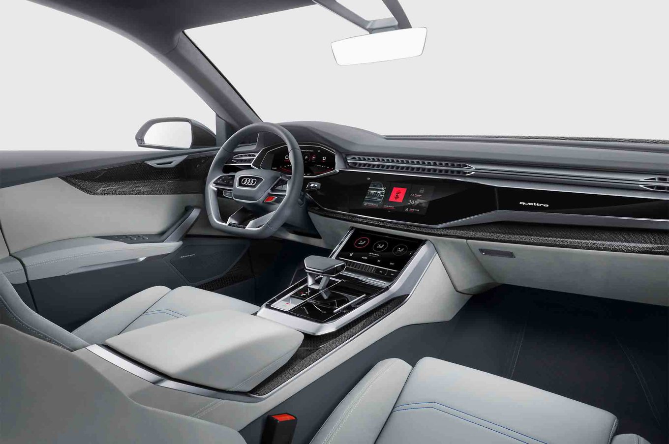 Recently introduced at NAIAS 2017, the Audi Q8 announces a new era for the German manufacturer. Built like an SUV yet eco-friendly and designed with elegant coupe lines, the concept car combines beauty, brains and brawn. Dynamic and refined, it features a wider honeycomb grille, a silver blade at the bottom of the bumper, doors without window frames, as well as striking front and rear lights. Curved lines and sharp angles combine in a sporty but stylish design that will surely turn heads. Inside, passengers enjoy the comfort one would expect from an Audi. The clean interior design reduces the number of buttons and switches for an airy feel, while the sleek instrument panel enhances the futuristic aesthetic.+