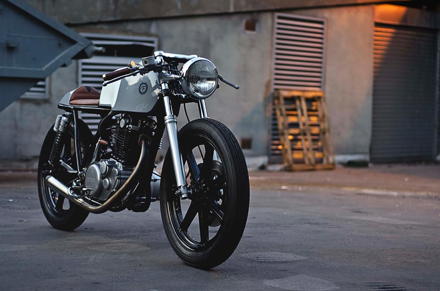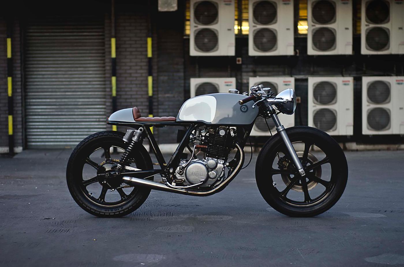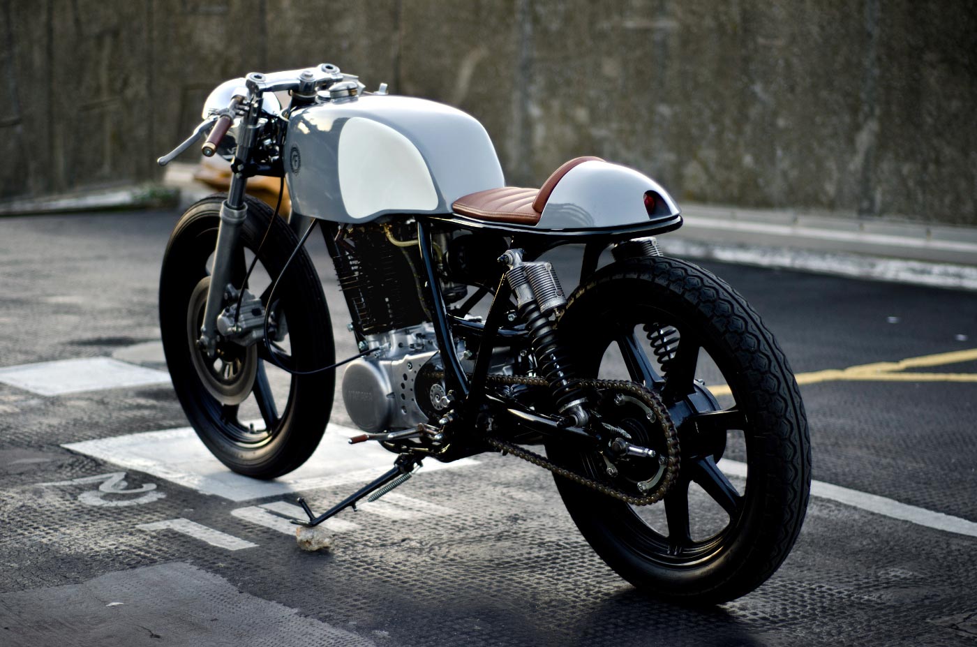 The Auto Fabrica Type 2 is a minimalist custom build of the SR500. The edited motorbike is slimmer and lighter than the original. Heavy components were stripped and replaced with sleeker aluminum parts such as the aircraft-grade English wheel. Light in color as well, the motorcycle gleams with naturally finished metal and glossy gray and white paint. The mostly grayscale palette is broken up by the warmth of the brown leather seats, making the design visually as well as structurally balanced.