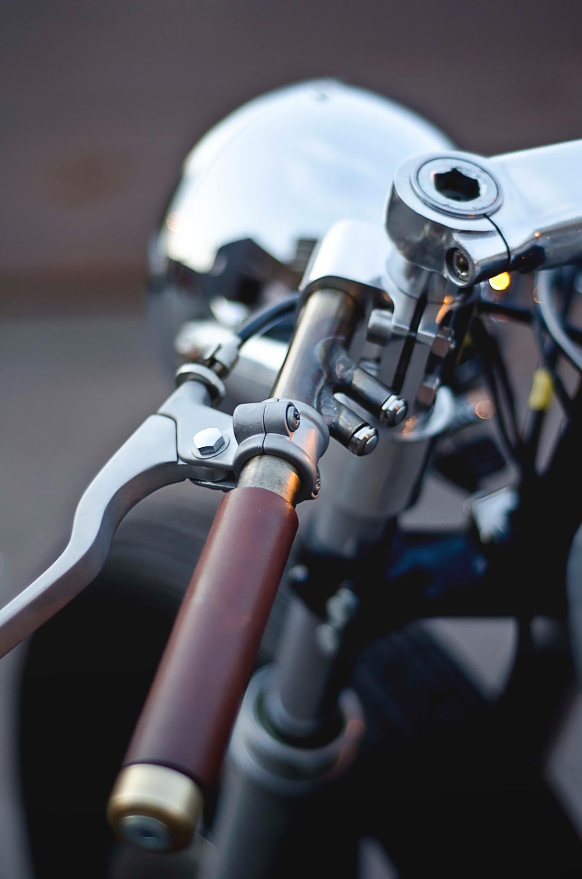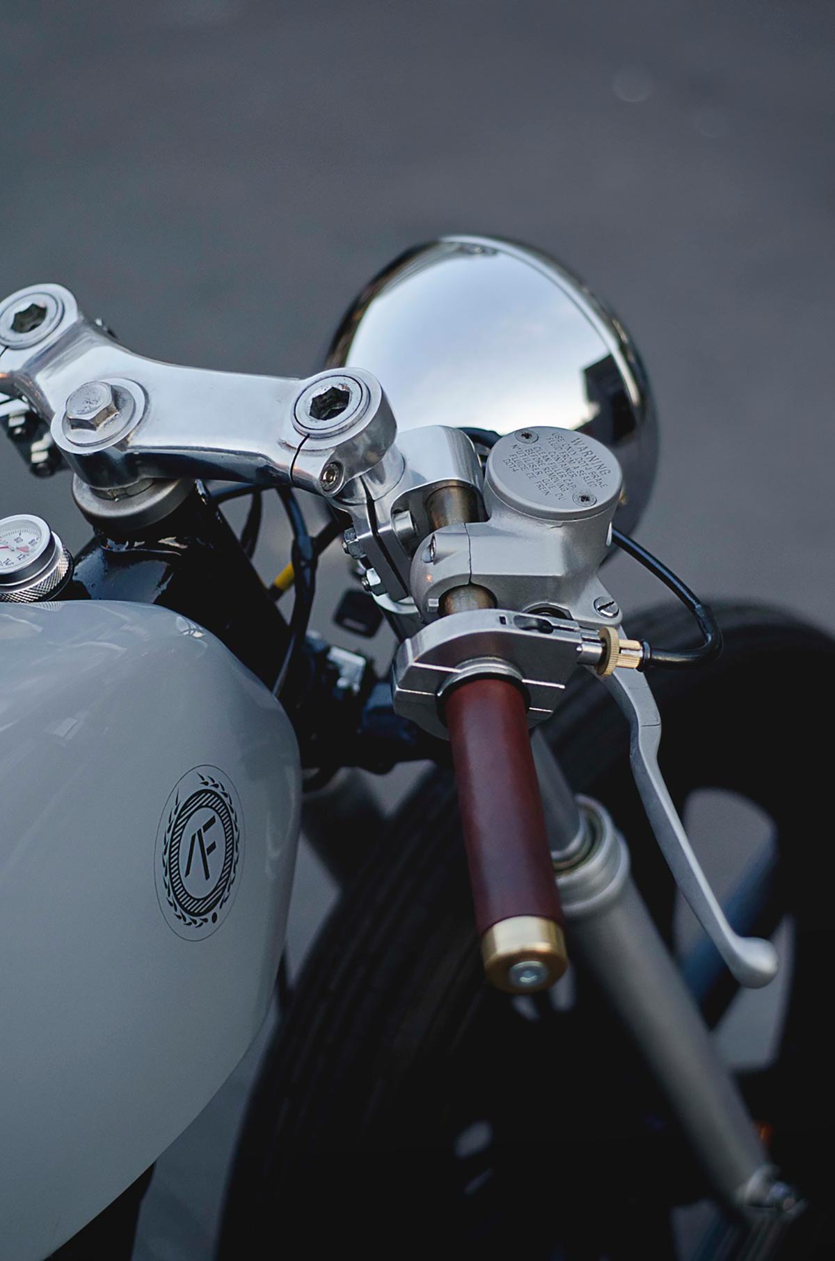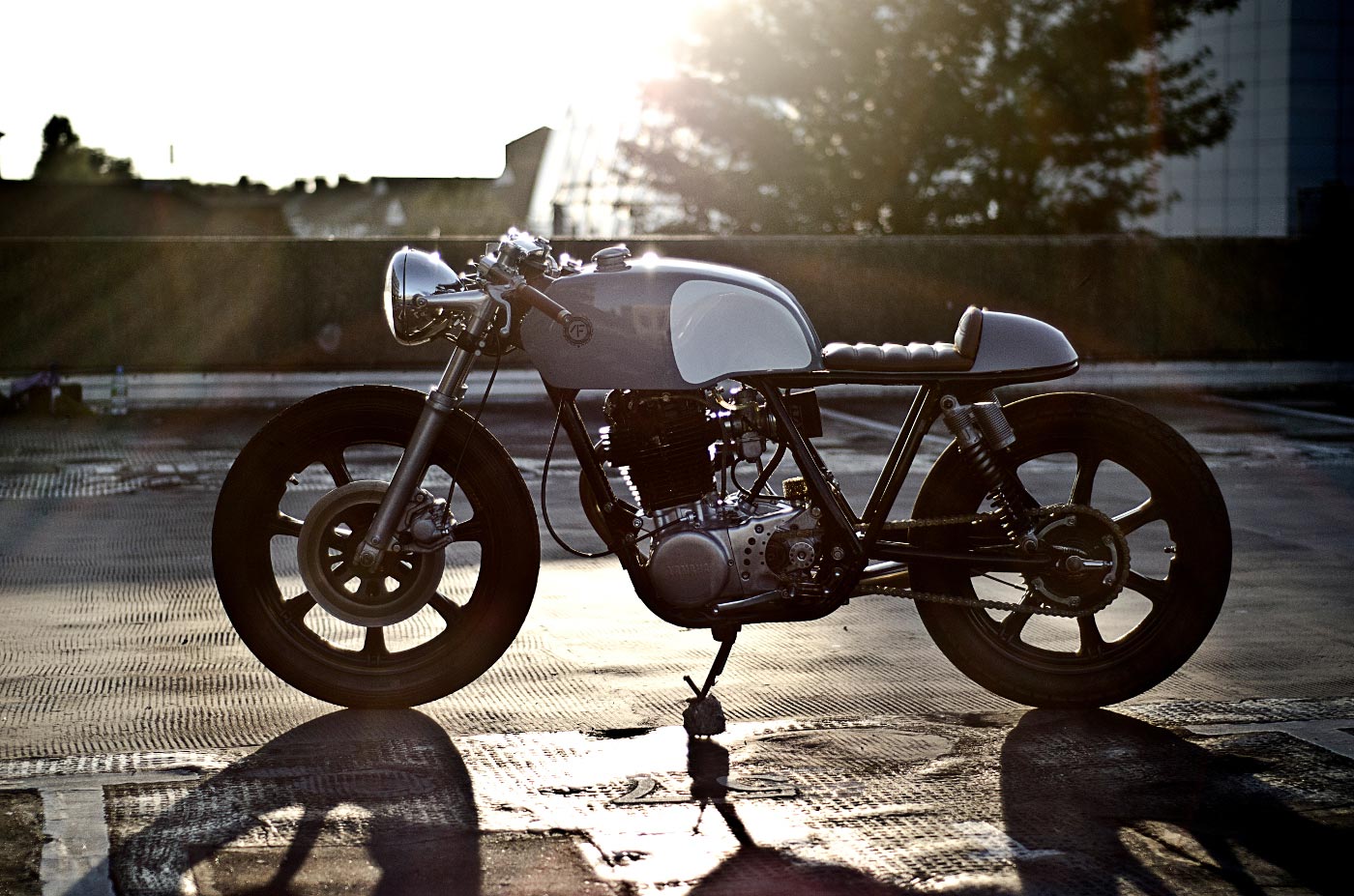 The Auto Fabrica Type 2 is a minimalist custom build of the SR500. The edited motorbike is slimmer and lighter than the original. Heavy components were stripped and replaced with sleeker aluminum parts such as the aircraft-grade English wheel. Light in color as well, the motorcycle gleams with naturally finished metal and glossy gray and white paint. The mostly grayscale palette is broken up by the warmth of the brown leather seats, making the design visually as well as structurally balanced.