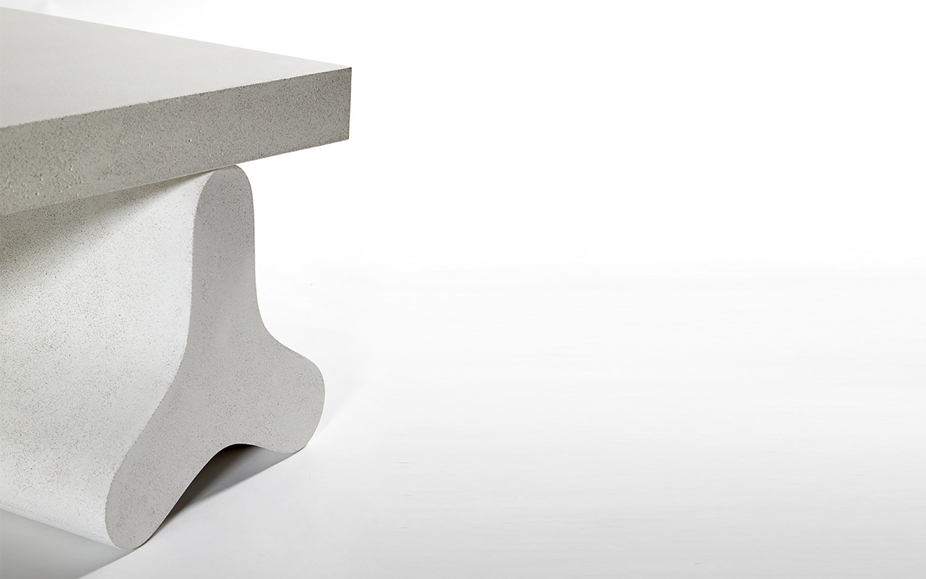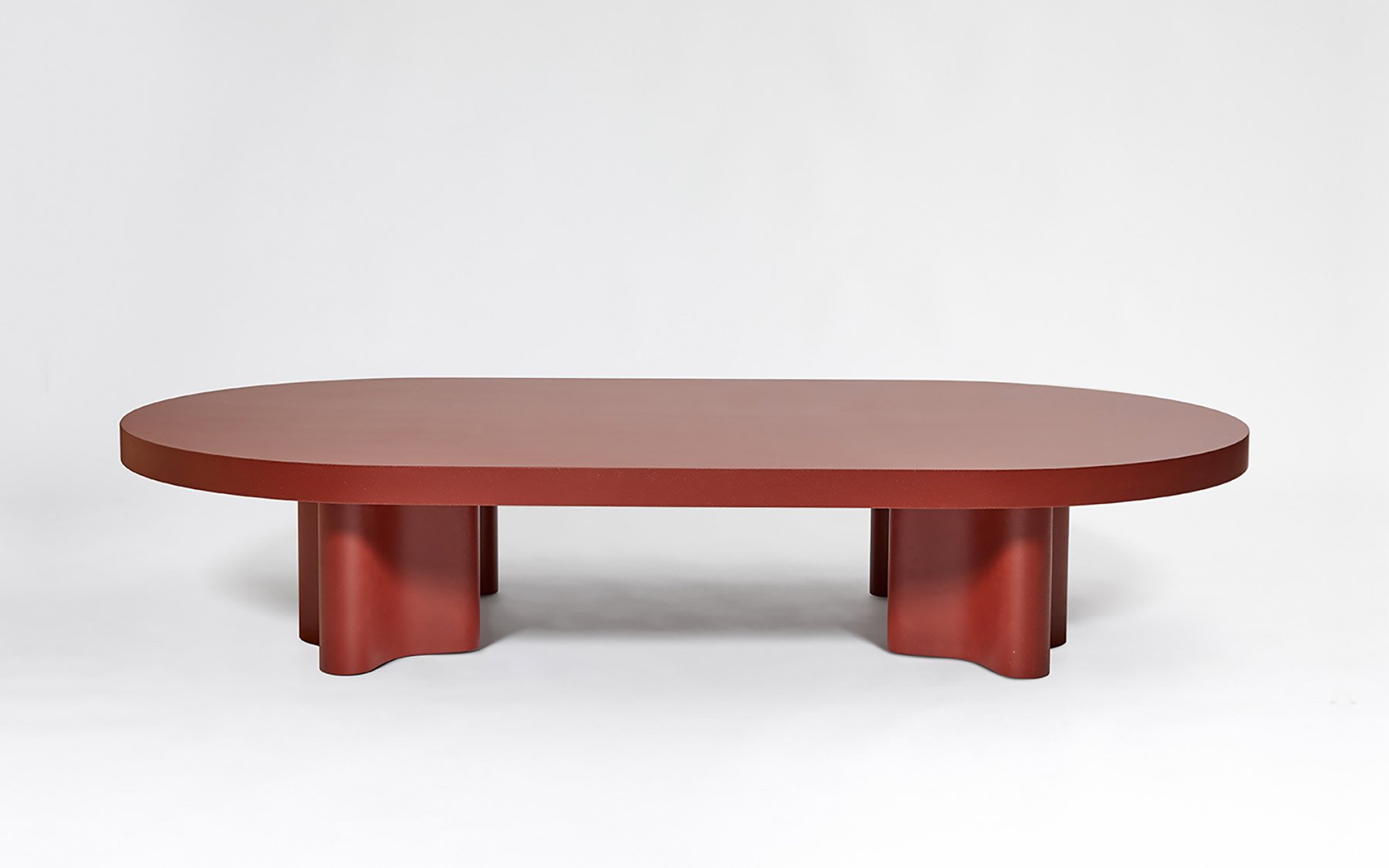 French designer François Bauchet has a passion for exploring materials and form in his work. Following on the footsteps of the “Cellae” collection, which featured resin-soaked felt, the designer created a new range of furniture for Paris-based Galerie Kreo using an innovative material. Named “Azo”, the collection features a composite material that contains sand, resin, and concrete. This mineral composite has a smooth surface with subtle textures and comes in light gray or vibrant brick red. Throughout the collection, clean lines and minimalist volumes combine with bold curves.