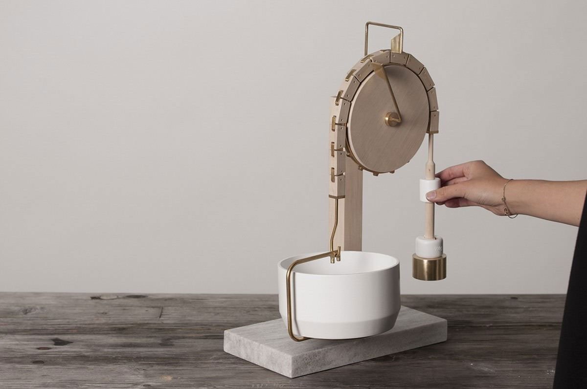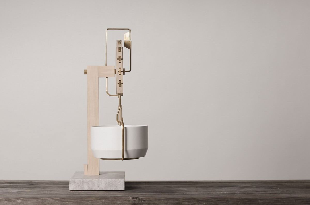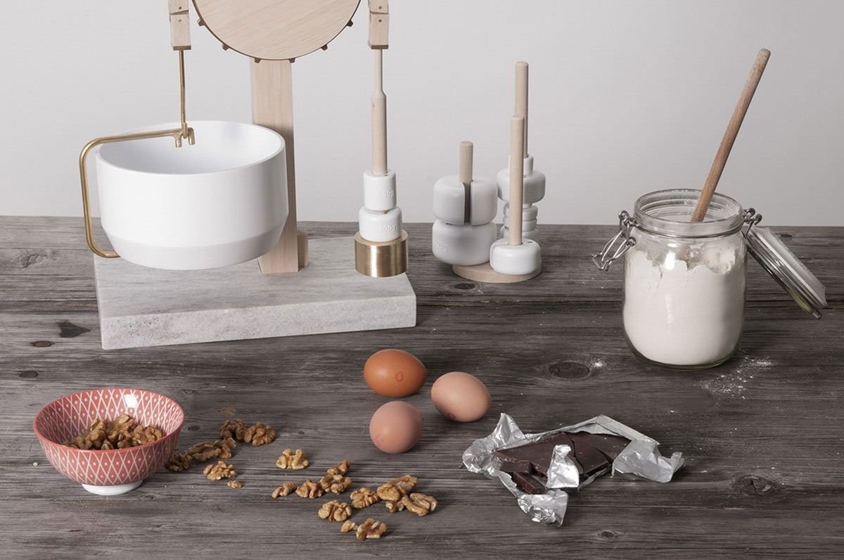 Balance is an intuitive kitchen scale by Nadine Fumiko Schaub. The simple design helps the user bake precisely by the gram, balancing up to 1kg of ingredients with porcelain and lead granulate weights. Interaction with the design encourages the user to see the object as an heirloom rather than a disposable tool. Additionally, the natural materials—brass, local marble, porcelain, and wood—make Balance a valuable asset to one’s cooking arsenal and design collection.