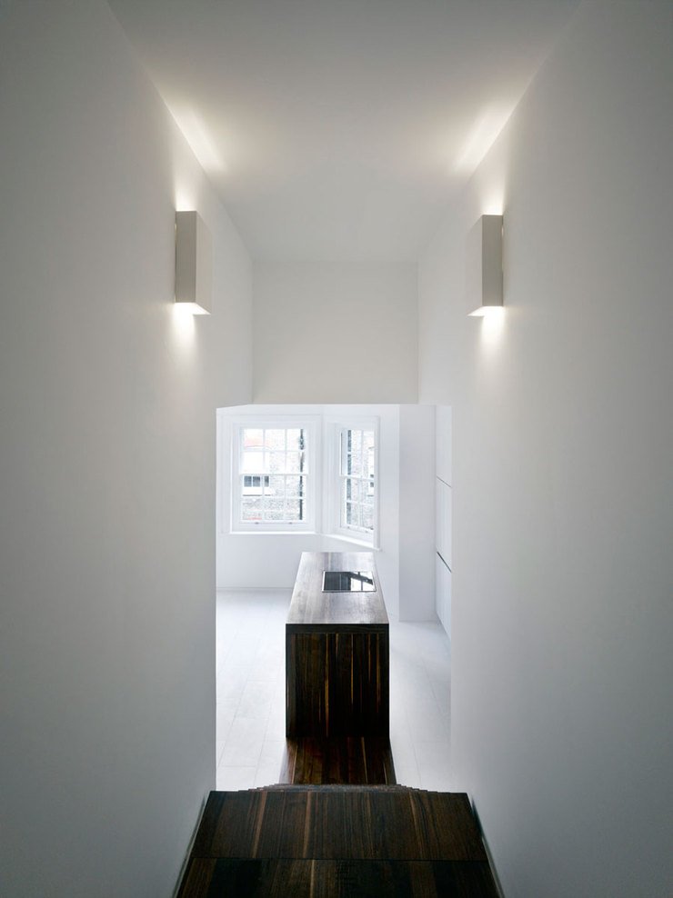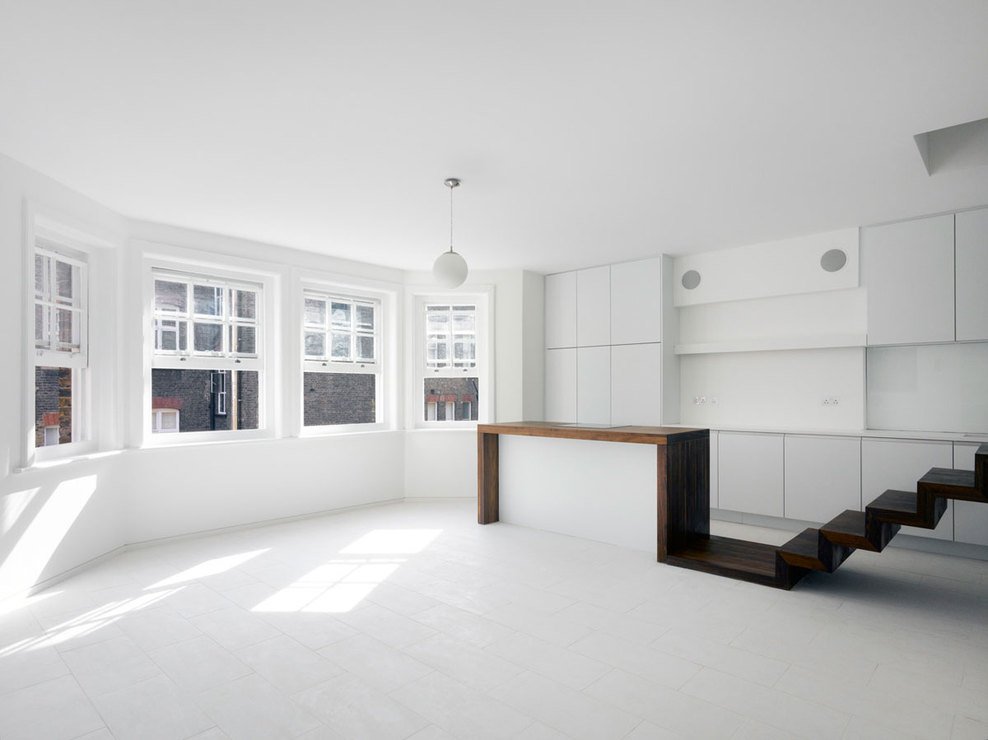 Balfour Place converts circulation into a physical component in its program, and around this core the rest of the plan falls into place. As a collaboration between KHBT and Office for Subversive Architecture (OSA), the house features a ribbon of wood that gets folded at varying elevations to form a kitchen counter, stairs that bisect the main form of the house, and the outline of the bathroom’s tub. While the dark strip separate kitchen from living room, it also is the conduit between shared spaces and more private rooms including bed and bath. Though not blatantly subversive per se, this element contrasts the Mayfair residence’s interiors, reiterating its role as an organizer and partition for space.