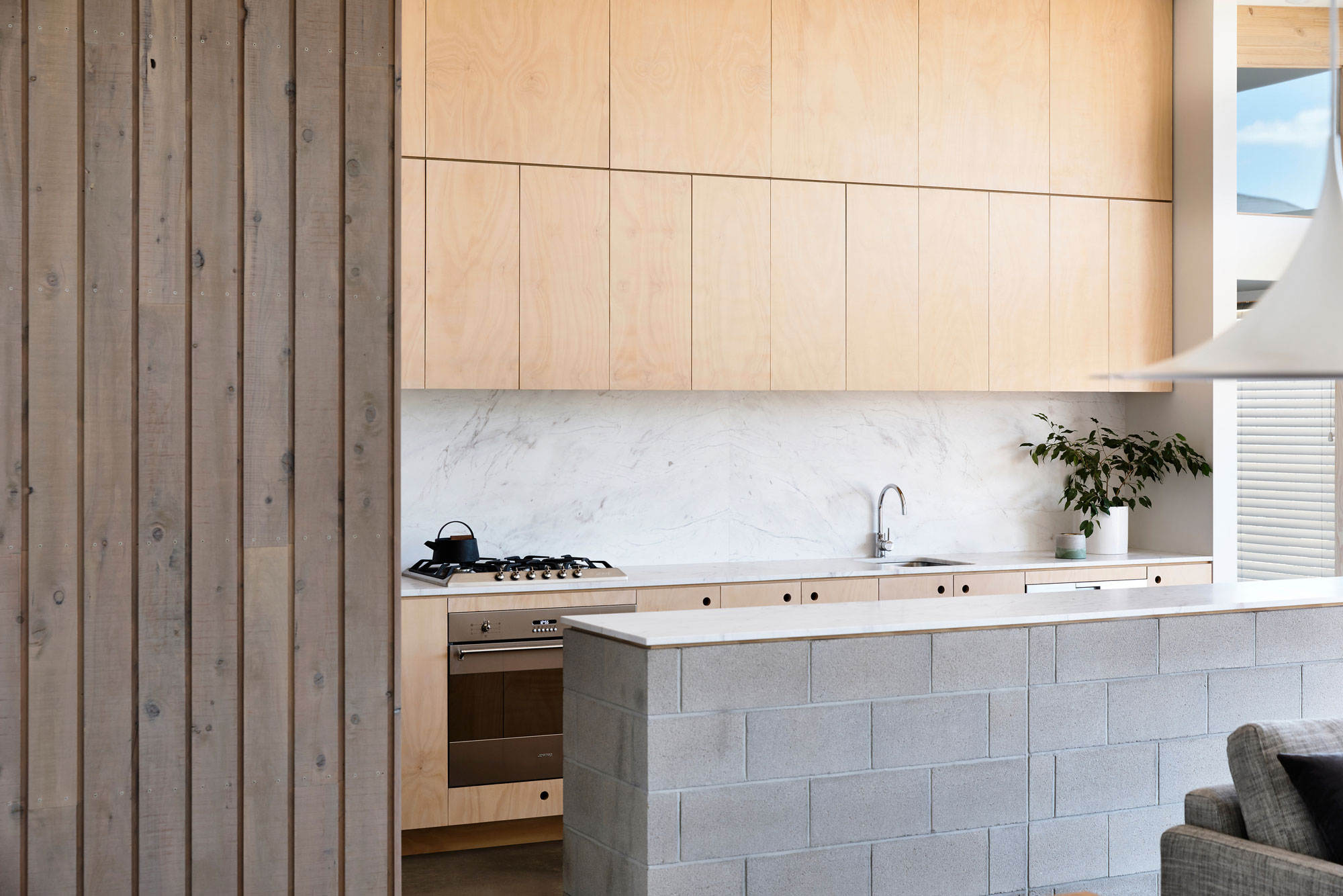 Toward the rear, the roof rises in height further to maximize access to light. This north-facing side also opens to a partially sunken deck and a garden. Thanks to these details, the house remains warm during winter, without heating, as the sunshine heats up the concrete walls. The studio used a minimal material palette for this project, but every choice gives a rich tactility to the living spaces. Apart from concrete blocks and concrete floors, the house also features wood cladding, plywood furniture, timber beams, and marble surfaces. In a creative twist, the wood beams extend outside. Their external tapered forms pierce the envelope and add an expressive touch to the architectural design. Photography © Derek Swalwell.
