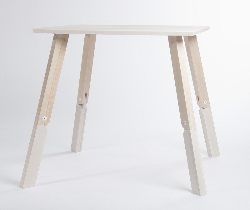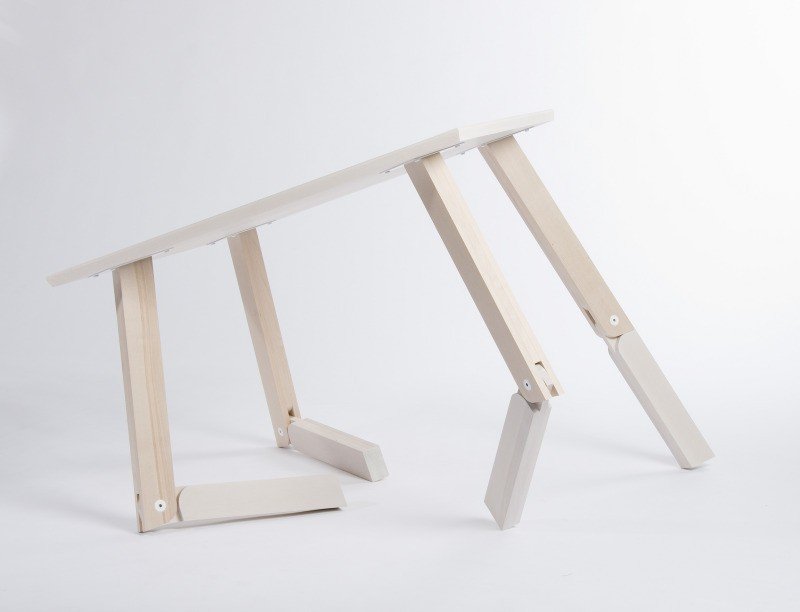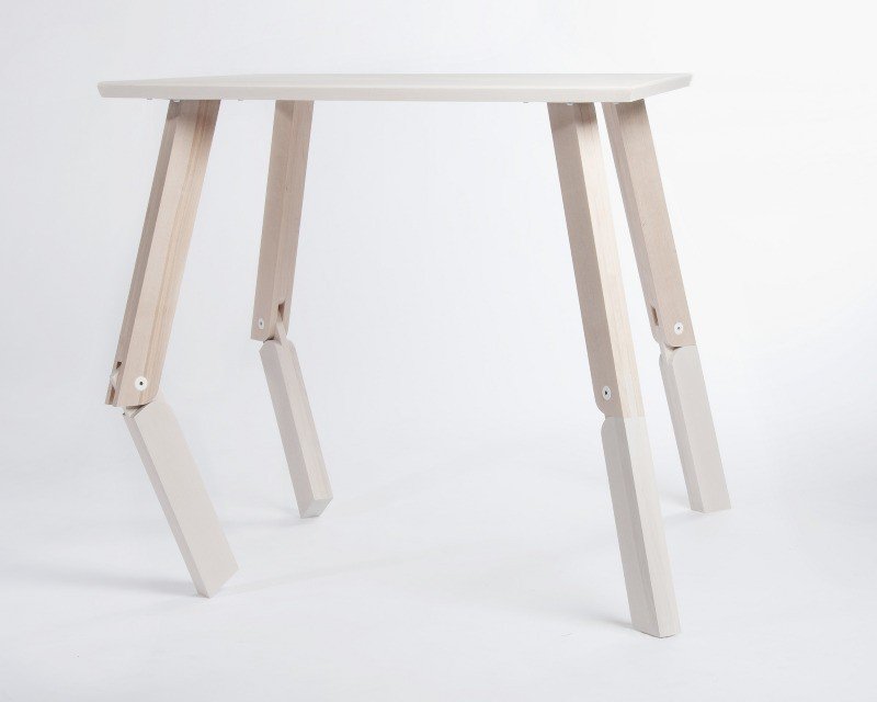Norvegian designer Caroline Olsson inspired by the anatomy of the knee joint designed the Bambi table. The location and angle of the table legs, as well as the meeting points of the joints, help keeping the table upright and stable. When the table is folded down and used at the lower level it reminds of a small foal resting in the meadow. Combined with 10″ seat height chairs the Bambi table can be a very safe solution as children’s play table, specially because of its stability when legs are folded in the lower position.