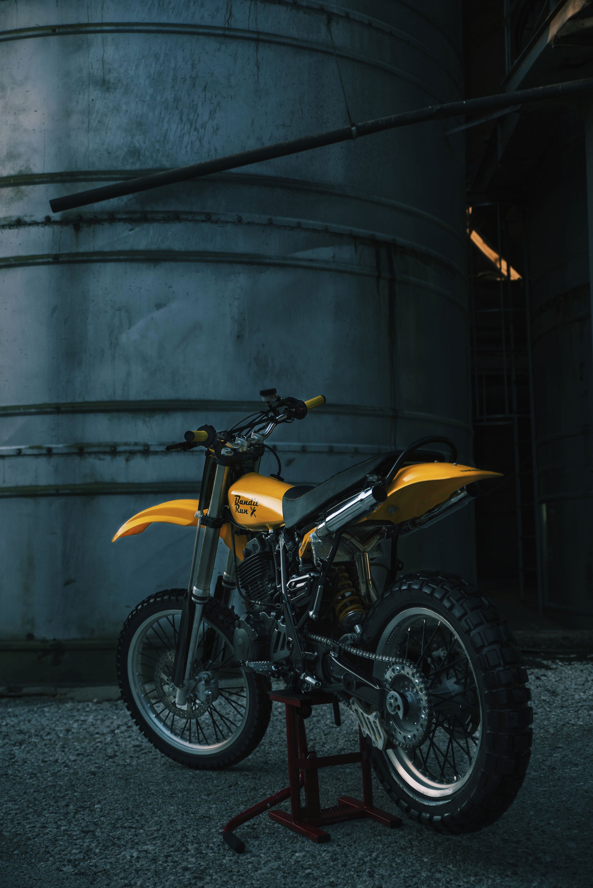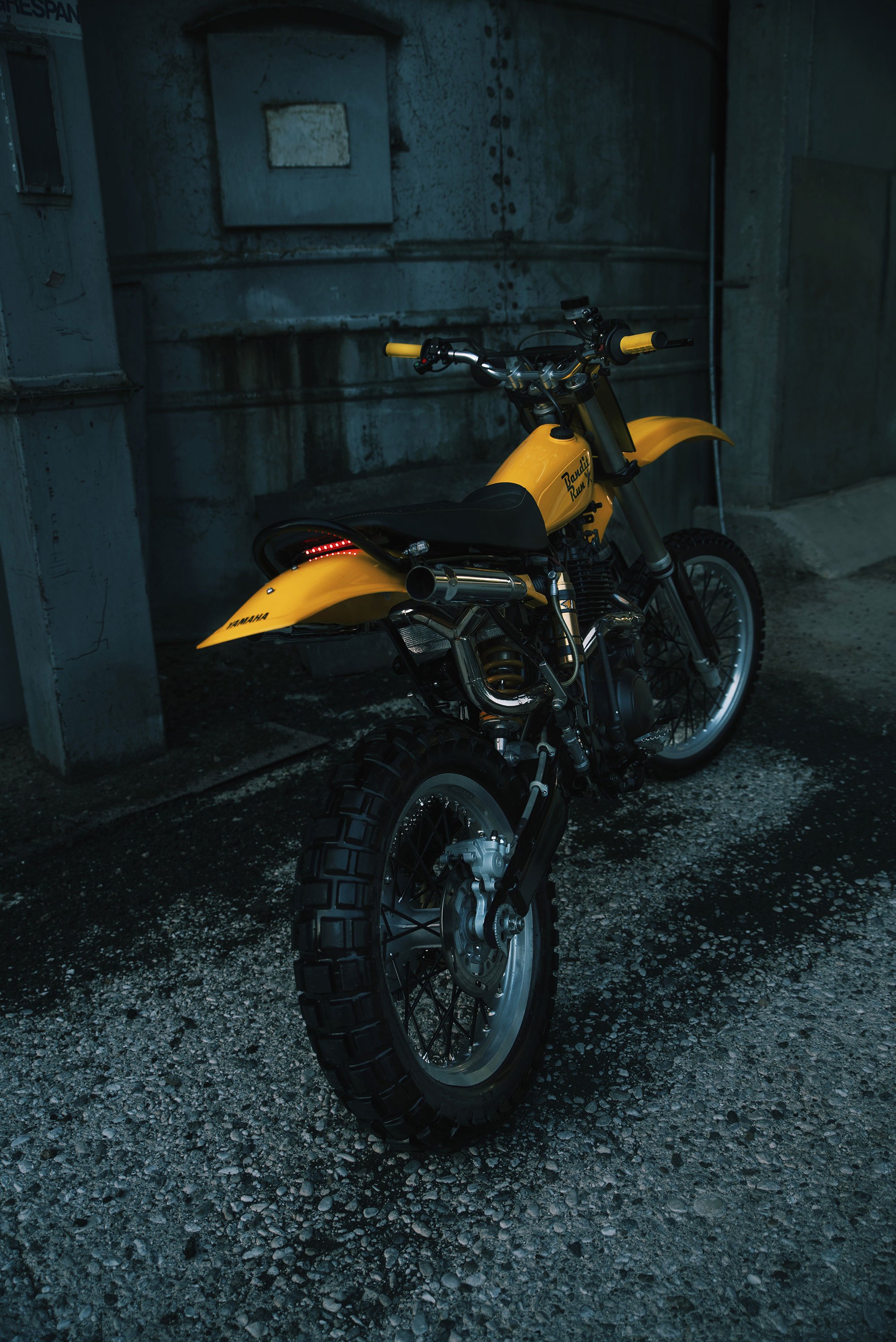 The base is a 1997 Yamaha TT600, which Pego disassembled completely before shaping the chassis to give it a more graceful silhouette. The bike features a rare tank sourced from a 1970 Yamaha YZ125 as well as a custom TIG-welded double exhaust system, courtesy of Pego’s uncle. Minimalist and modern despite its retro look, ‘Bandit Run’ also boast an integrated LED light strip at the front. The rear features a thin line of red lights, just under the edge of the seat. As a finishing touch, the bright yellow and black palette gives the bike a cool vintage vibe. Photographs© Elisa Carpentiere – Photography.