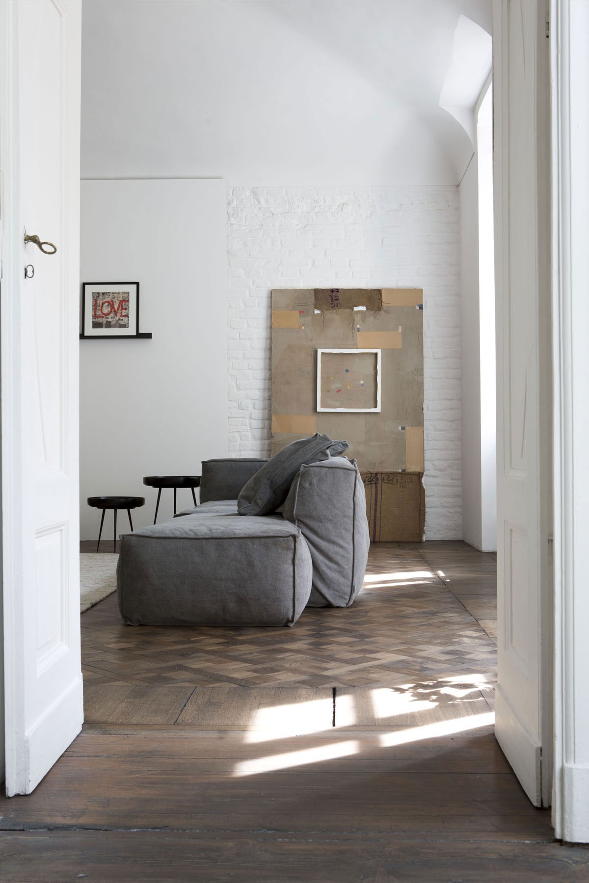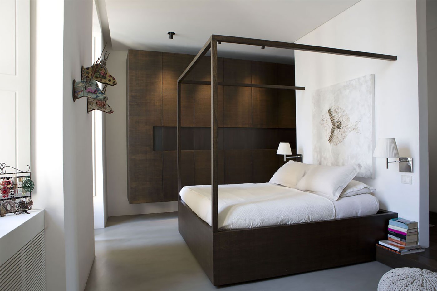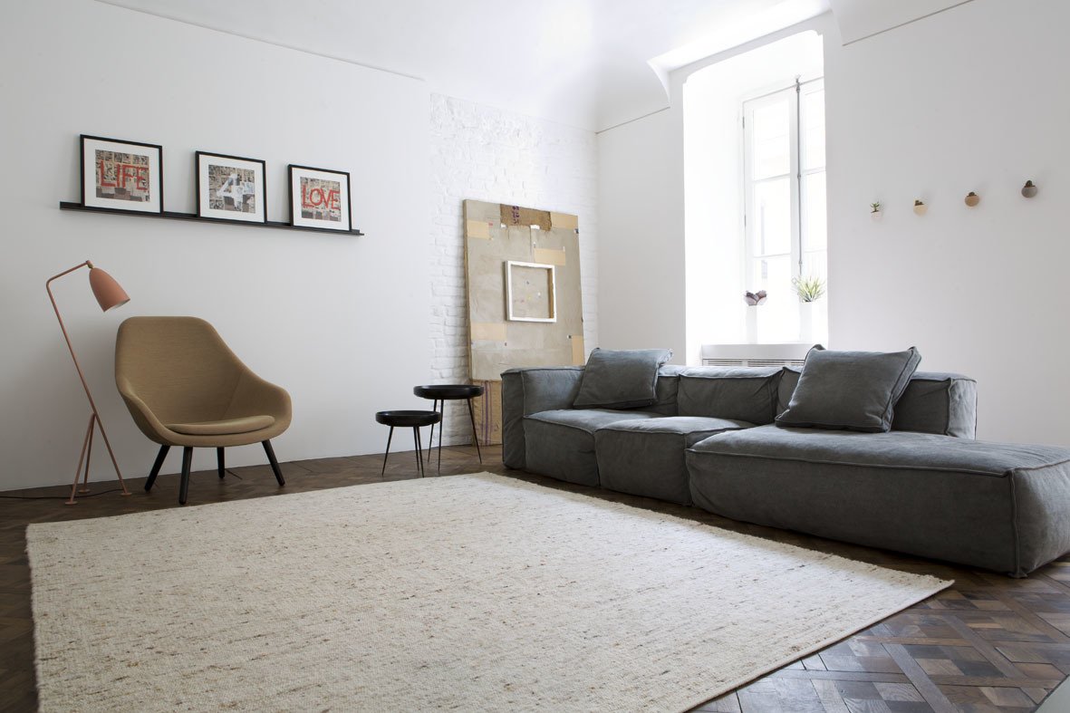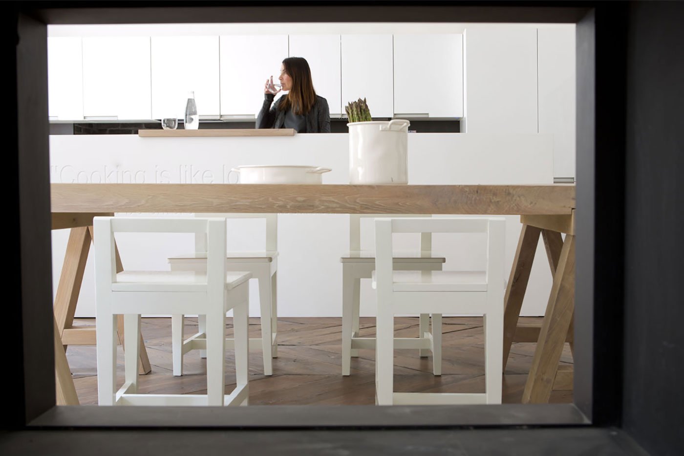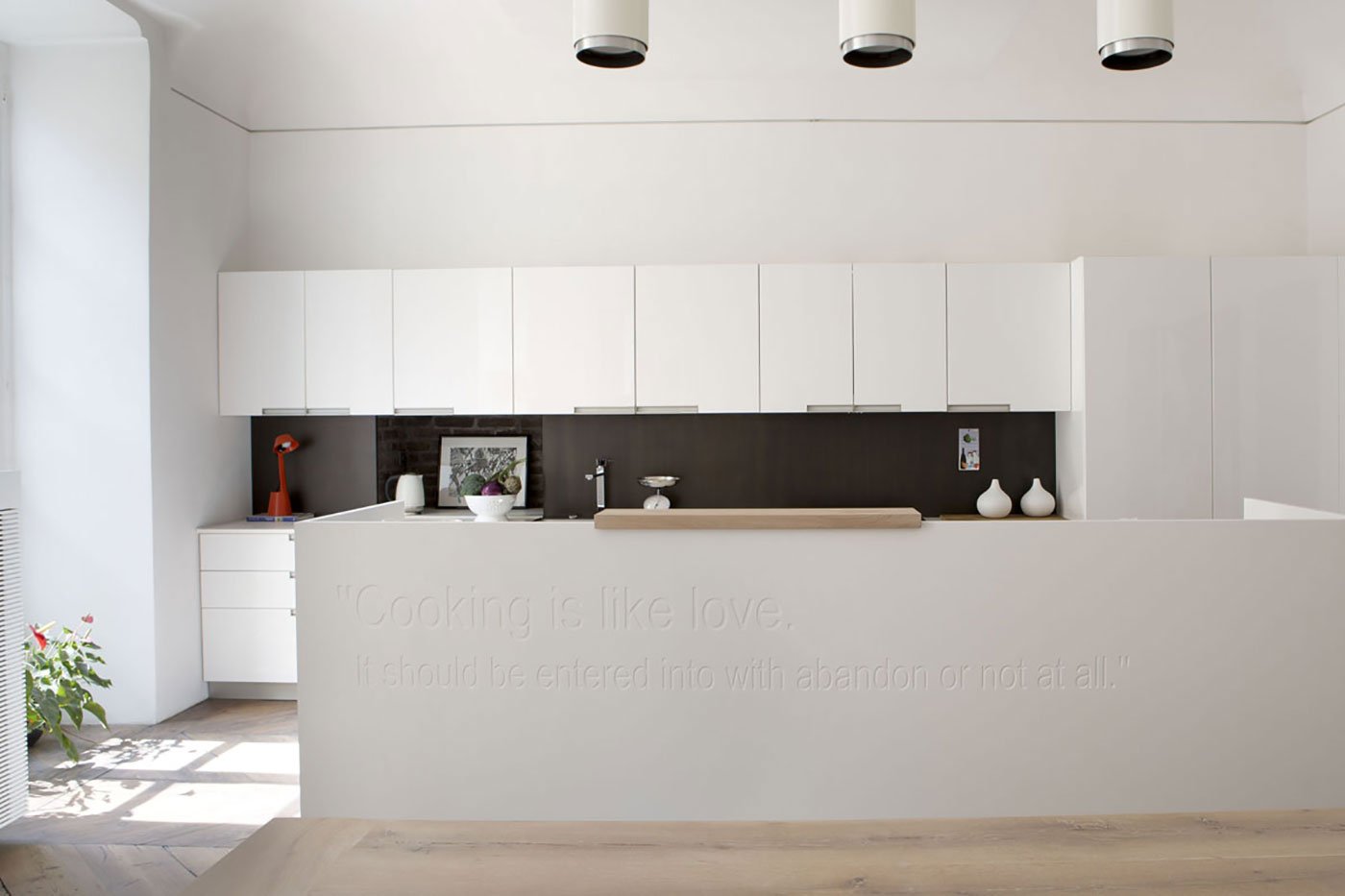 An interior design project by Fabio Fantolino, Basilica updates a home in Turin, Italy with a palette of neutral colors. In every room but the bathroom, the walls and ceilings are painted white. The white backdrop in the living room is a particular standout, as it includes a painted brick panel and contrasts with the vintage wooden floors of various patterns. In the kitchen, minimalist white cabinets are paired with a black backsplash. Additionally, there is a partial interior wall obscuring the worktop. To create dialogue between the open plan kitchen and dining room, the barrier is engraved with a Harriet Van Horne quotation, “Cooking is like love. It should be entered into with abandon or not at all.” In more private areas such as the master bedroom and bathroom, the floors are polished for a smooth, sophisticated effect. The square-framed bed is a particular standout in the bedroom, and the bathroom is a dark, cozy space with black panels. All of the rooms are finished with gray, black, and brown furniture and decor to round out the earthy look.